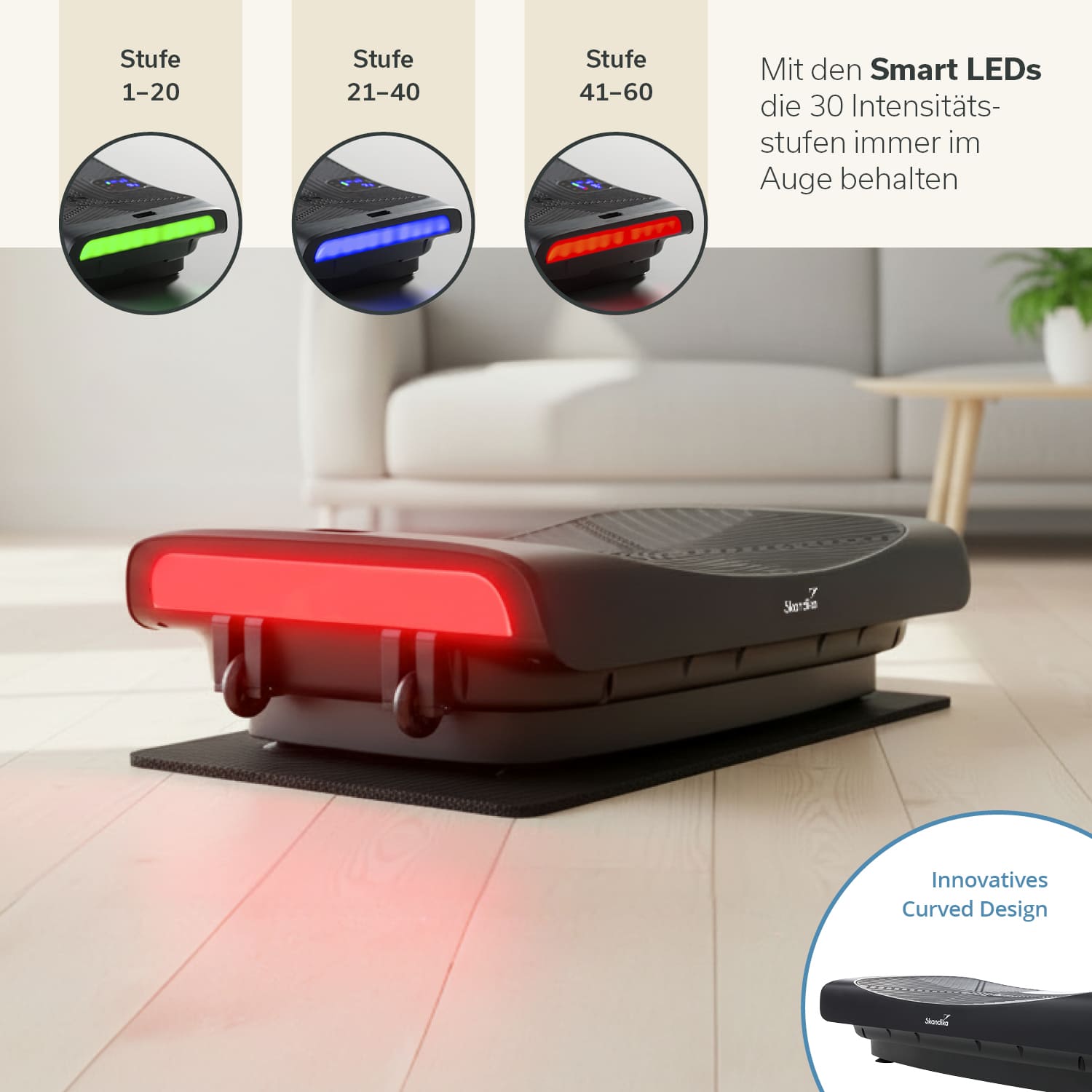 Ein schönes Extra sind die LED-Leisten an den beiden Seiten der Vibrationsplatte. Die LED Power Lights geben Aufschluss darüber, welche Trainingsintensität eingestellt ist. Zwischen den Trainingsstufen 1 und 20 leuchten die LED-Leisten grün. Ab 21 bis 40 leuchten die LED-Leisten lila und ab Stufe 41 bis 60 rot.