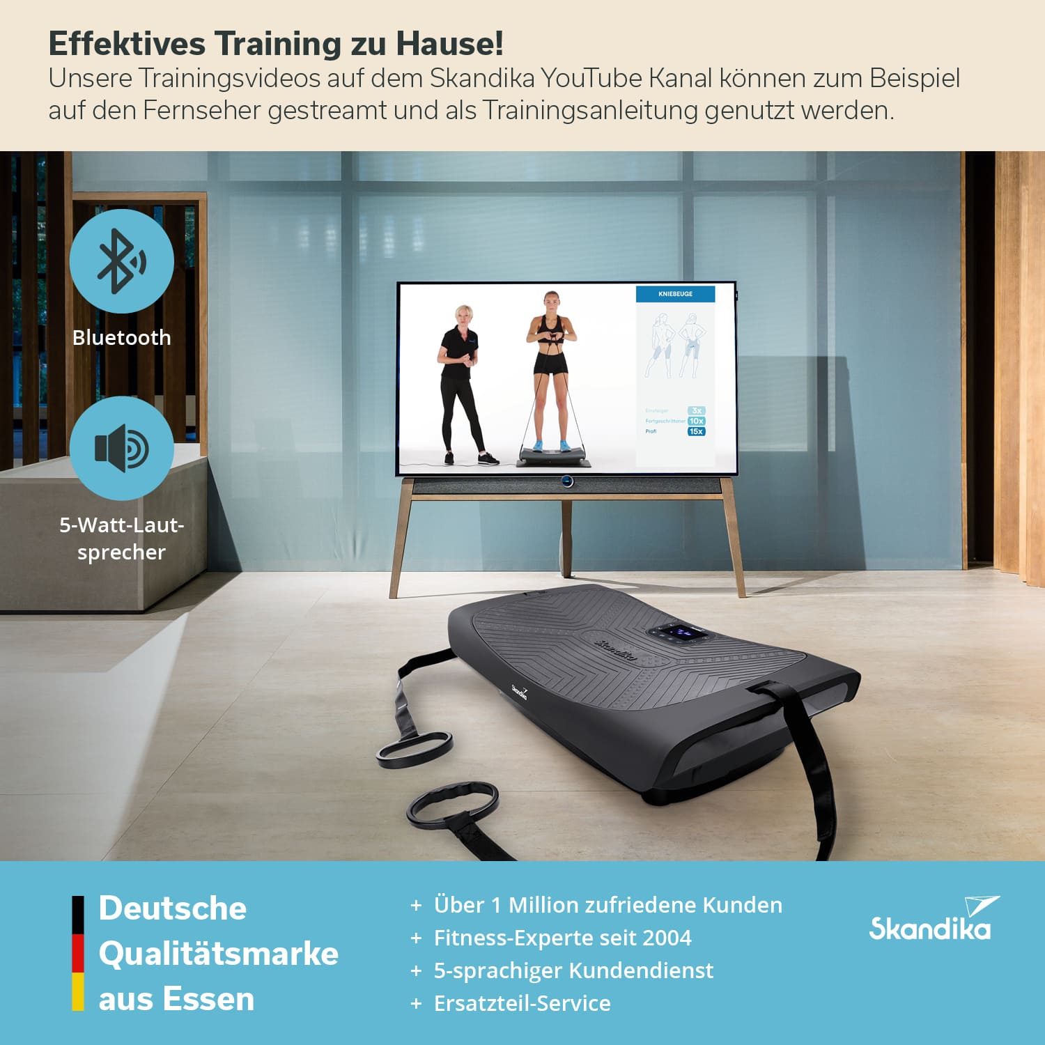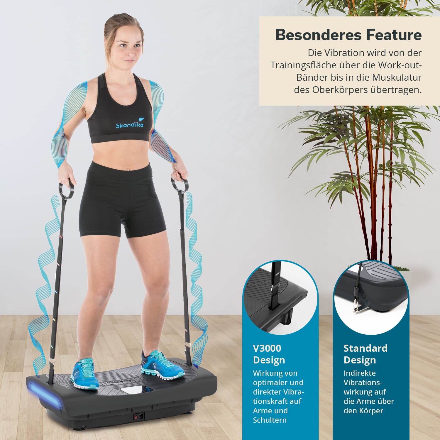 Bei der Skandika V3000 Plus werden die Armbänder oben auf der Platte montiert. Im Vergleich zu anderen Herstellern übertragen die Trainingsbänder die Vibrationen nun deutlich besser, da nur der obere Teil der Vibrationsplatte wirklich vibriert. Die Workout-Bänder sind durch einen Klettverschluss in der Länge verstellbar.