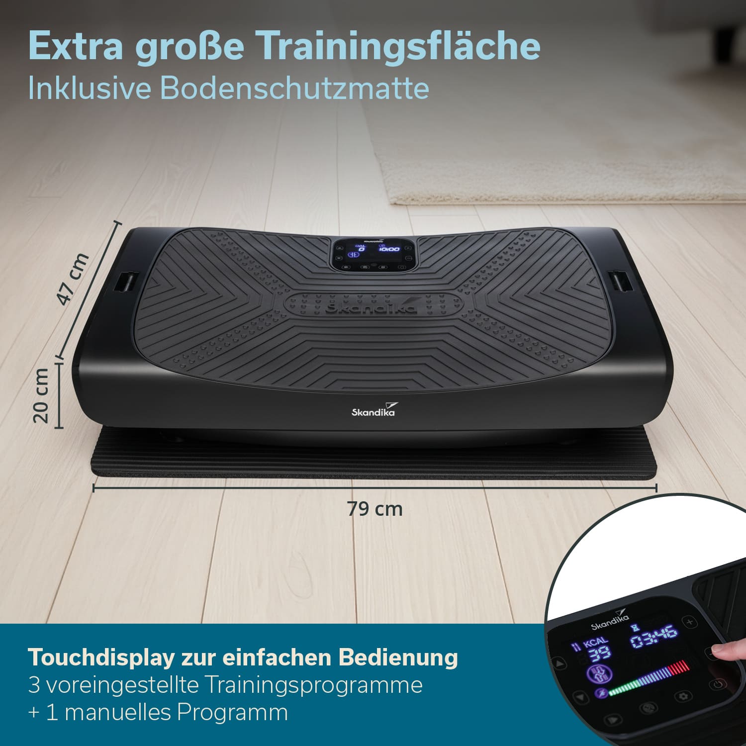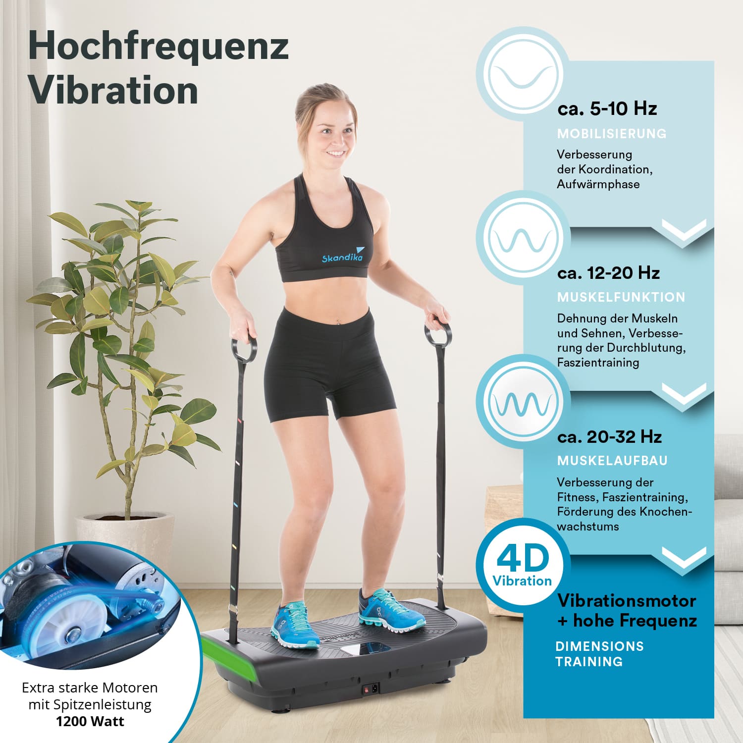 Die Skandika 4D Vibrationsplatte V3000 Plus verwendet ein neuartiges Antriebs- und Motorensystem. Dazu werden 3 Motoren gleichzeitig eingesetzt. Die Vibrationsplatte ermöglicht 4D Vibrationen. Oszillation, Vibration und Mikro-Vibration werden miteinander vereint und sorgen für ein umfangreiches und effektives Training.