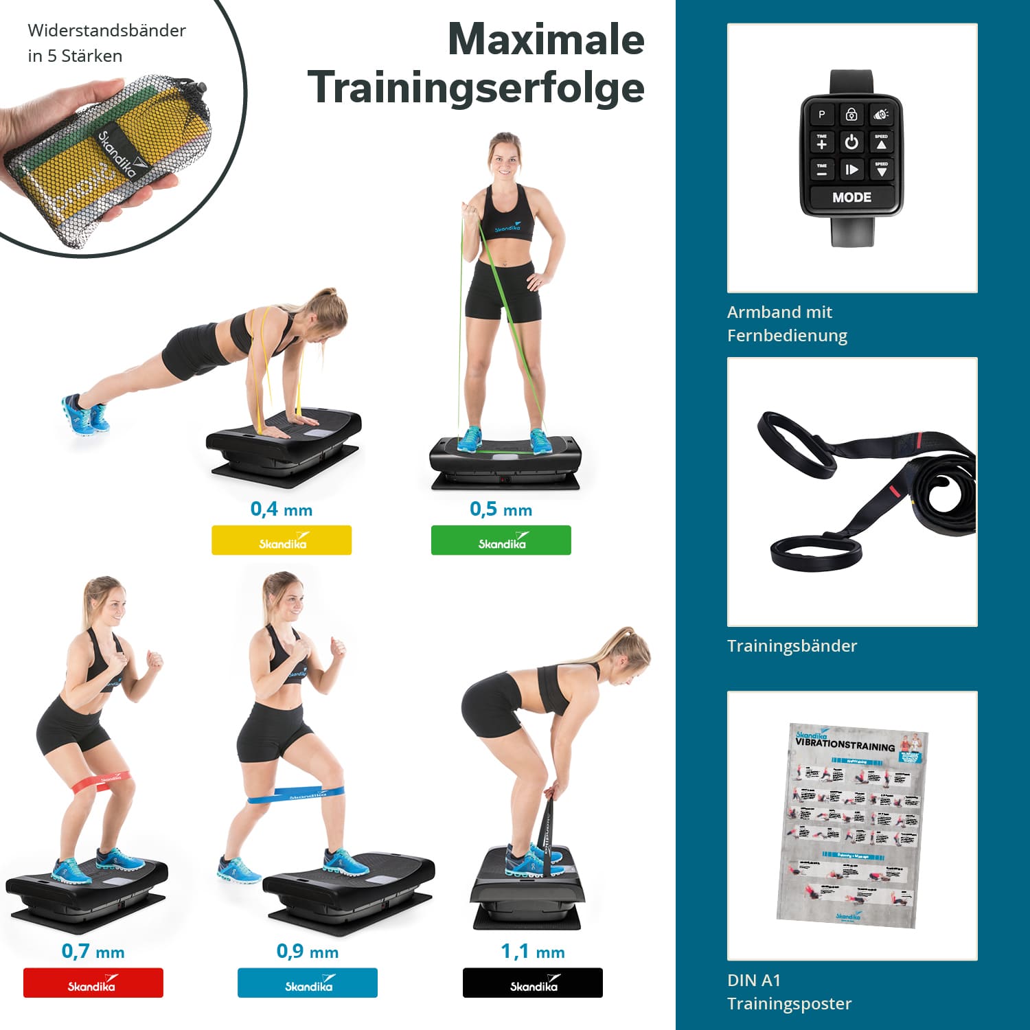 Ein Trainingsposter, zwei schwarze Trainingsbänder, fünf farbige Widerstandsbänder und eine 77 × 43 cm große Bodenschutzmatte aus synthetischem Kautschuk sind im Lieferumfang enthalten. Außerdem ist das Skandika Multi-Widerstandsbänder Set separat erhältlich und eine Vielzahl an Ganzkörper-Übungen mit Erklärungen, Tipps & Tricks steht auf der Skandika Website zur Verfügung.