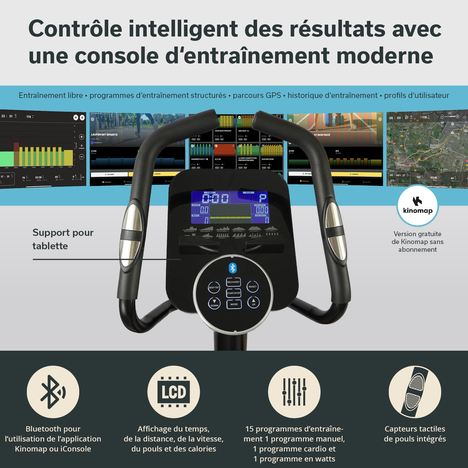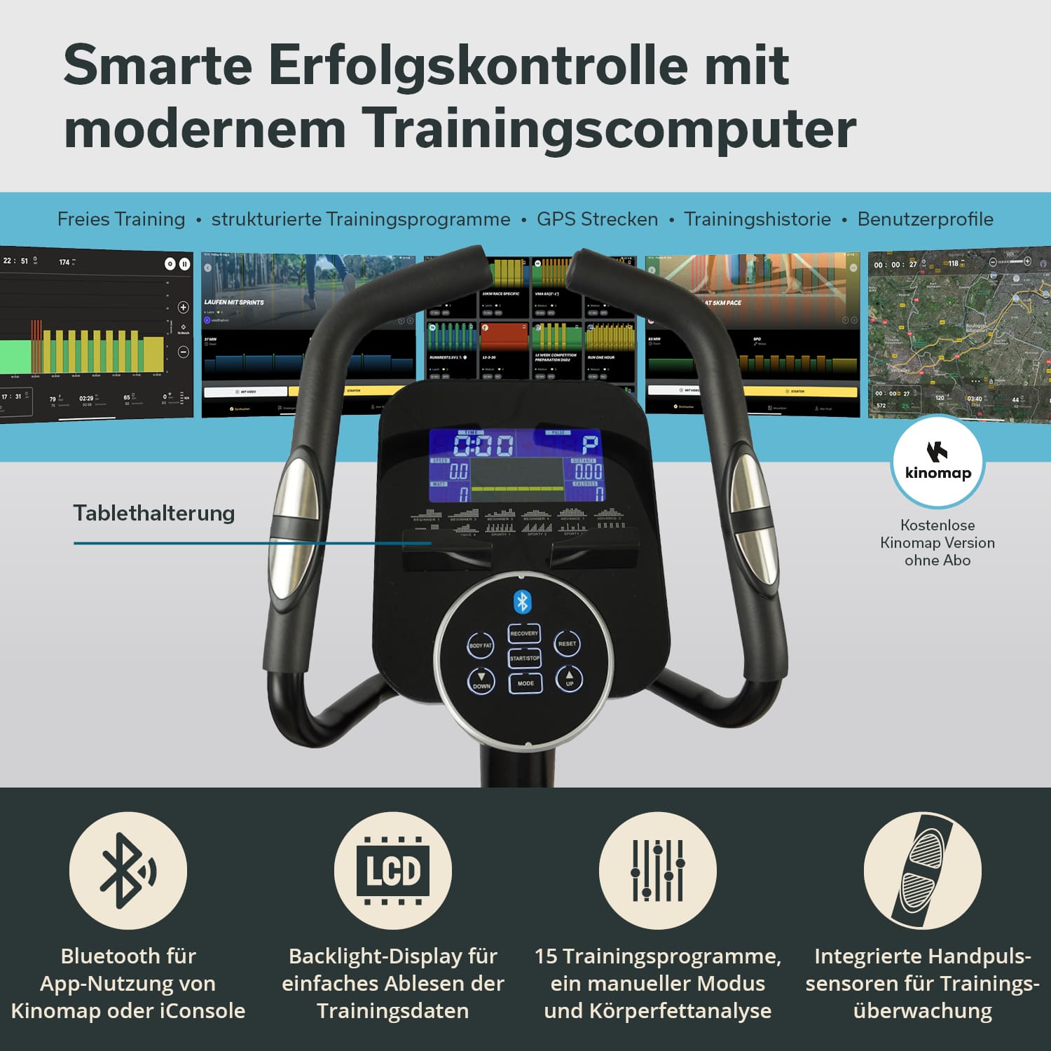 Die Pulsmessung erfolgt praktisch und unkompliziert über die Handpulssensoren. Die integrierte Bluetooth-Schnittstelle ermöglicht die zusätzliche Nutzung von Apps wie Kinomap oder FitnessData. Die praktische Tablet-Halterung erleichtert dies.