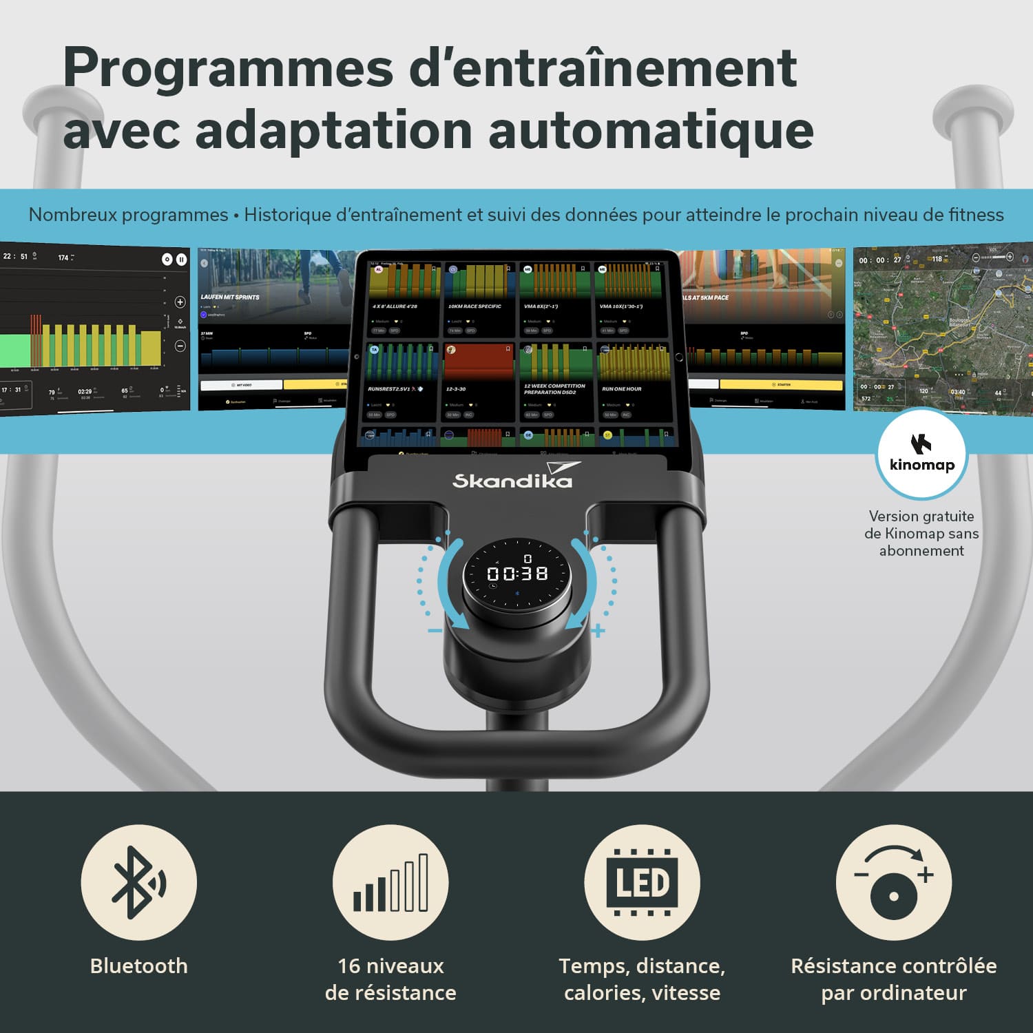 Die Bluetooth-Schnittstelle ermöglicht die Verbindung mit Apps wie Kinomap. Skandika-Kunden erhalten durch die Gold-Partnerschaft mit Kinomap einen Code, um 60 Tage kostenfrei die Vollversion der Kinomap-App zu testen. Live-Videos, Coachings und virtuelle Trainingsvideos bringen jede Trainingseinheit auf ein neues Level und ermöglichen Workouts an den schönsten Orten der Welt.