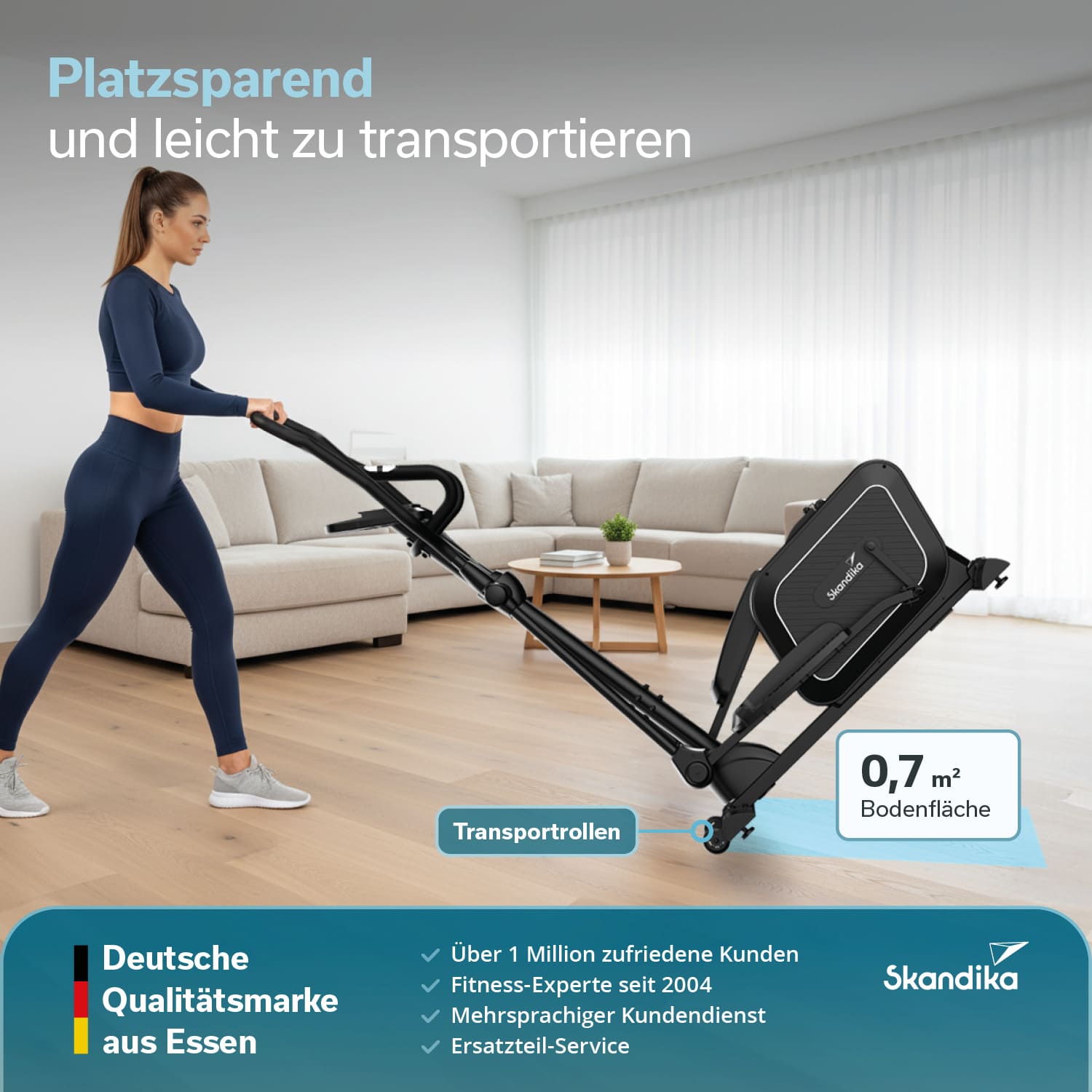 Dank integrierter Transportrollen lässt sich der Crosstrainer mühelos an verschiedene Orte verschieben und fügt sich harmonisch in jede Wohnumgebung ein.