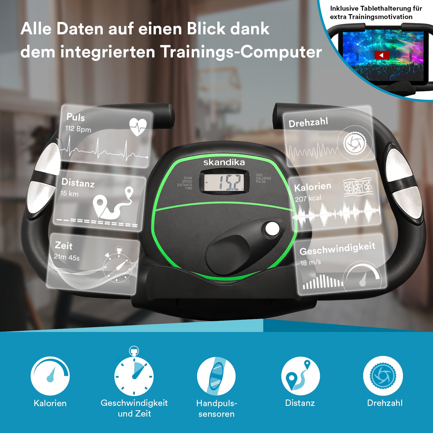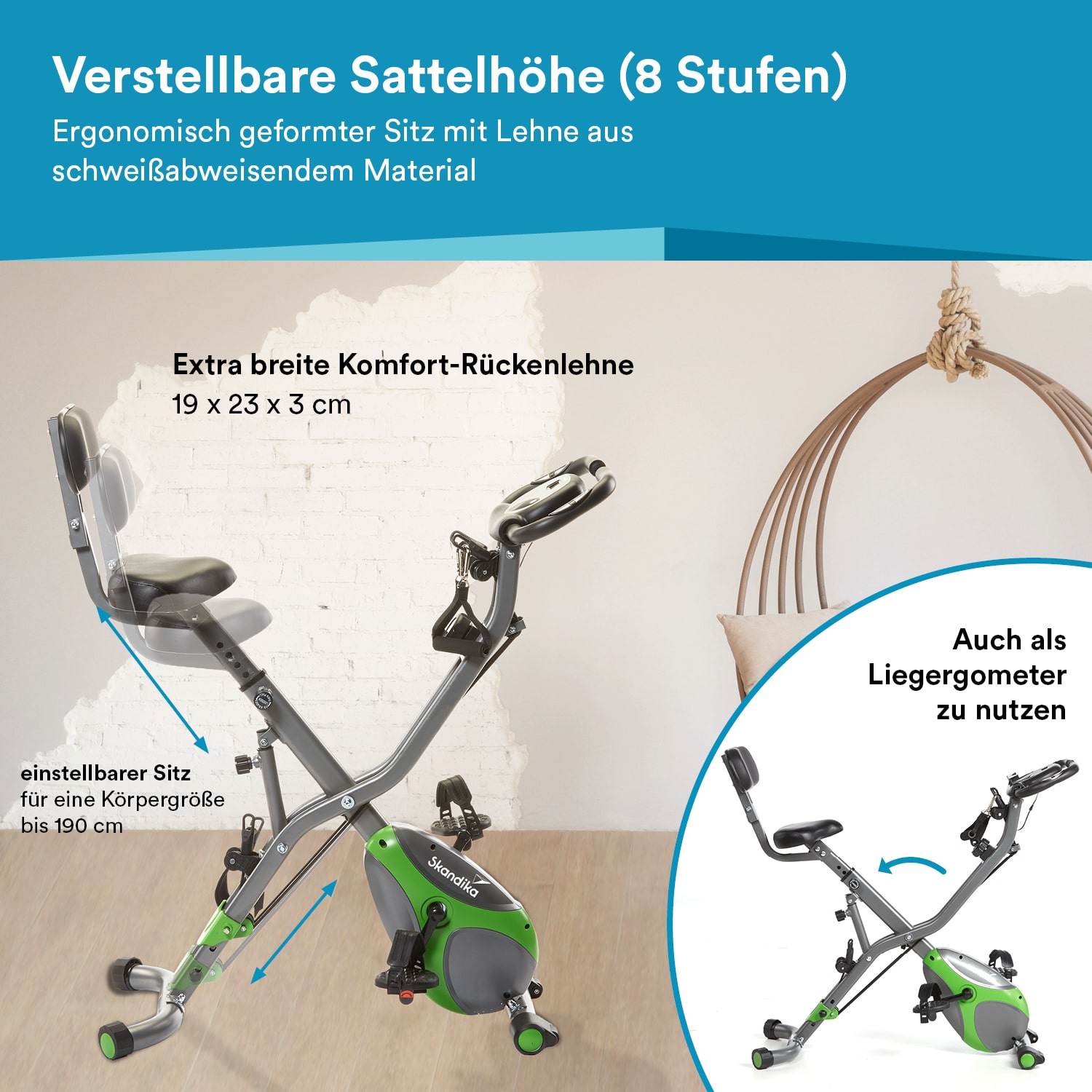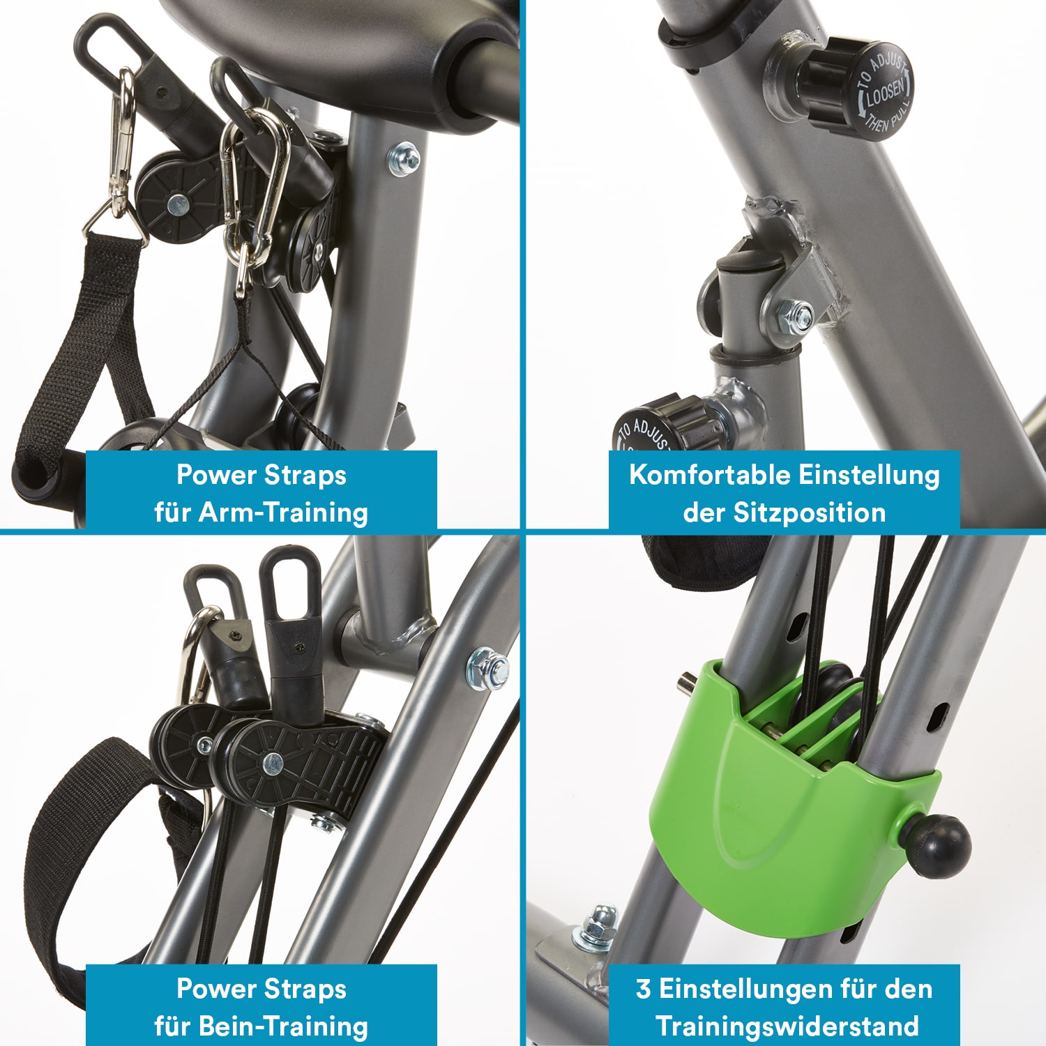 Das Skandika Foldaway X-3000 besitzt die Vorzüge von Heimtrainer, Liegeergometer und Kraftstation und bietet damit ein möglichst vielseitiges Training. Das Multifunktionsgerät verbessert die Fitness und Flexibilität und unterstützt den Muskelaufbau. Bei dem Training auf dem X-3000 werden nicht nur die Beine und der Rumpfbereich beansprucht, sondern mit dem einzigartigen Dual-Zugbandsystem mit Power Ropes wird darüber hinaus die Körperhaltung optimiert und der Arm- und Schulterbereich fit gehalten.