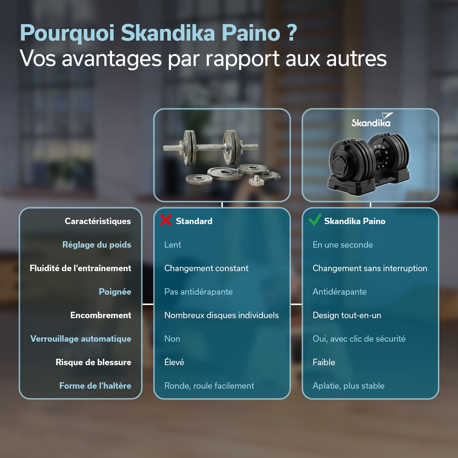 Die Hantel ist Teil der durchdachten Paino-Reihe von Skandika, die verschiedene Hantelgrößen, Kettlebells und Sets umfasst. Das aufeinander abgestimmte Sortiment bietet vielfältige Möglichkeiten für das Krafttraining zu Hause.