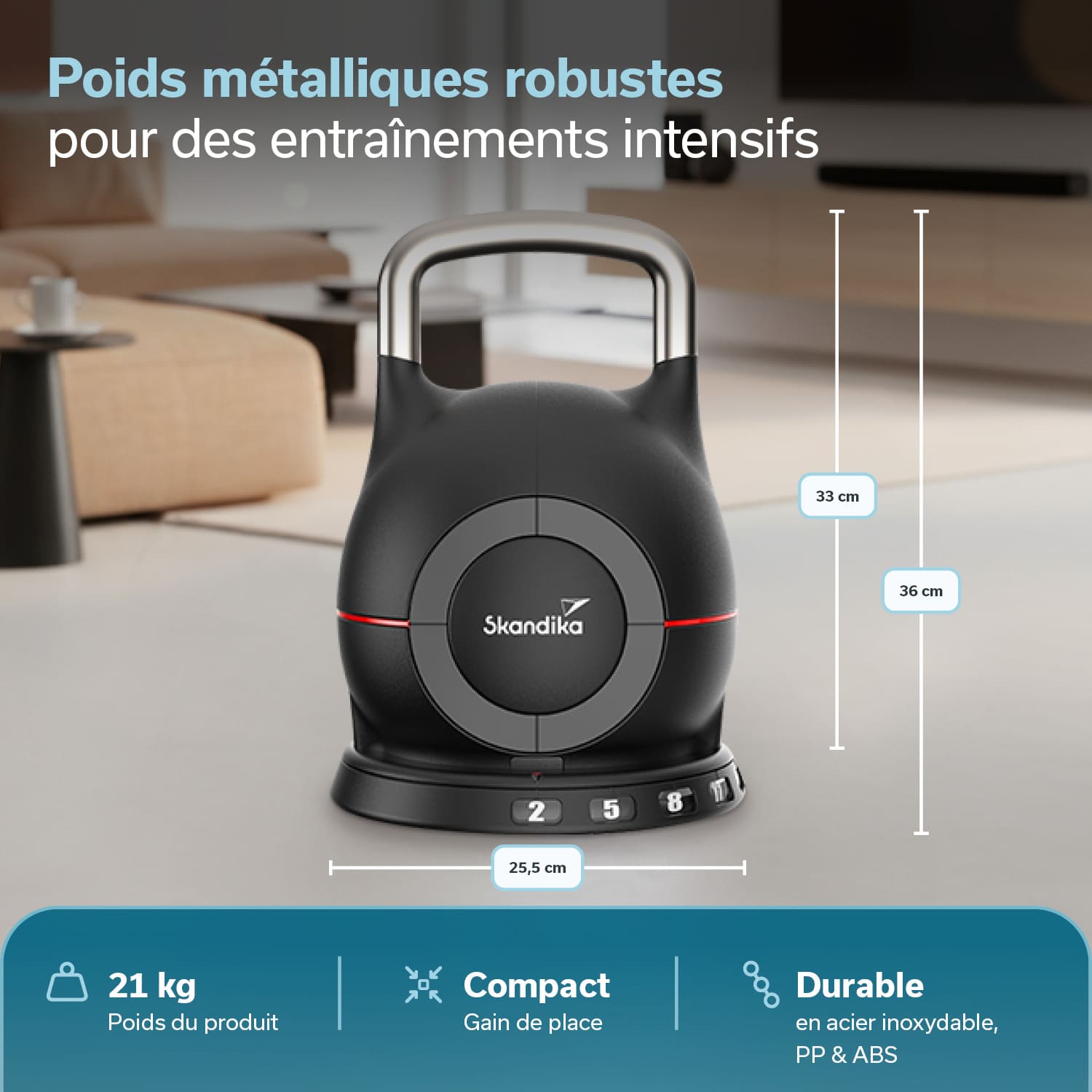 Mit der Skandika Kettlebell Paino wird funktionelles Krafttraining zu Hause auf ein neues Level gehoben. Dank des innovativen Schnellwechselsystems und der kompakten Bauweise ersetzt dieses durchdachte Trainingsgerät sieben herkömmliche Kettlebells. Von 2 bis 20 kg stehen sieben Gewichtsstufen zur Verfügung, die dynamische Schwungübungen und funktionelle Ganzkörperworkouts für jedes Leistungsniveau ermöglichen. Das intelligente Selbstverriegelungssystem sorgt für blitzschnelle Gewichtsanpassungen und unterbricht den Trainingsfluss nicht.