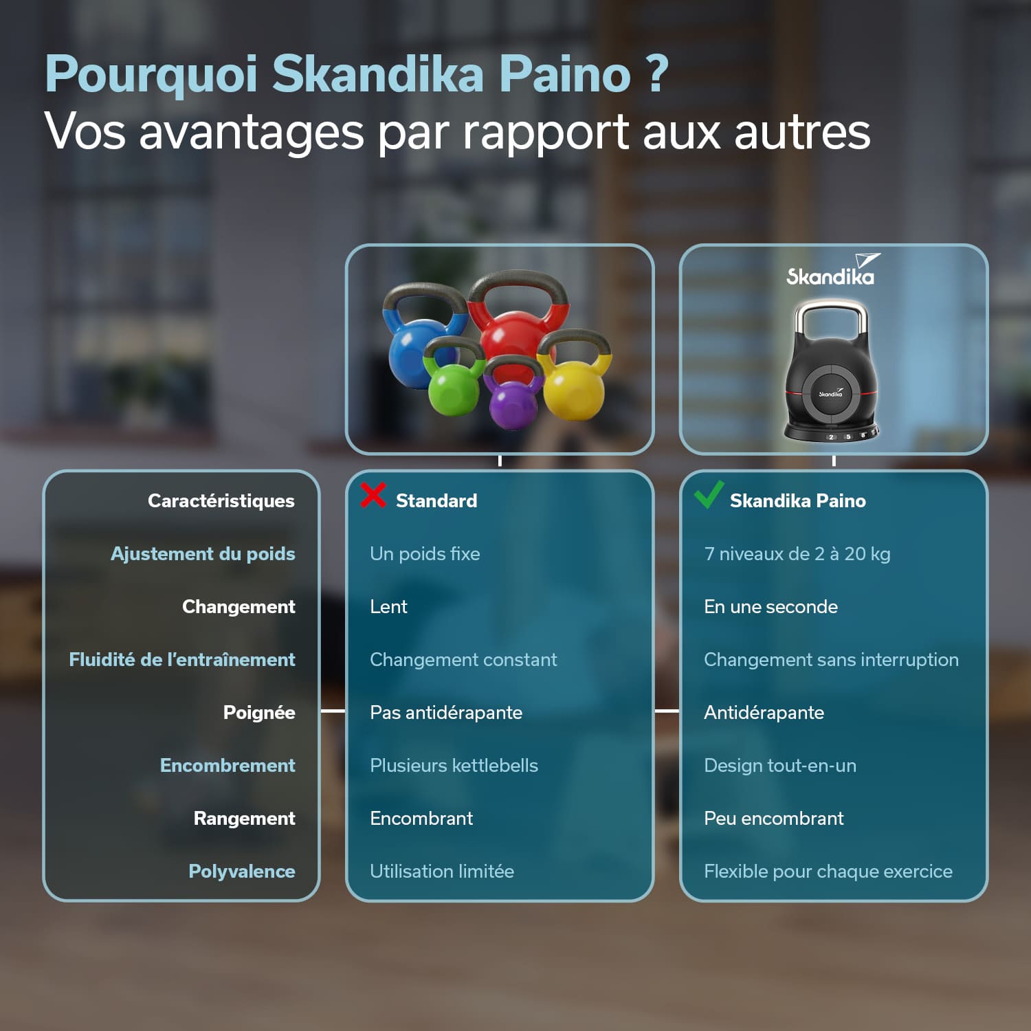 Anstelle von sieben einzelnen Kettlebells beansprucht die Paino im All-in-One-Design nur minimalen Raum. Das durchdachte Konzept schafft Ordnung im Trainingsbereich und ist ideal für platzbewusstes Heimtraining.