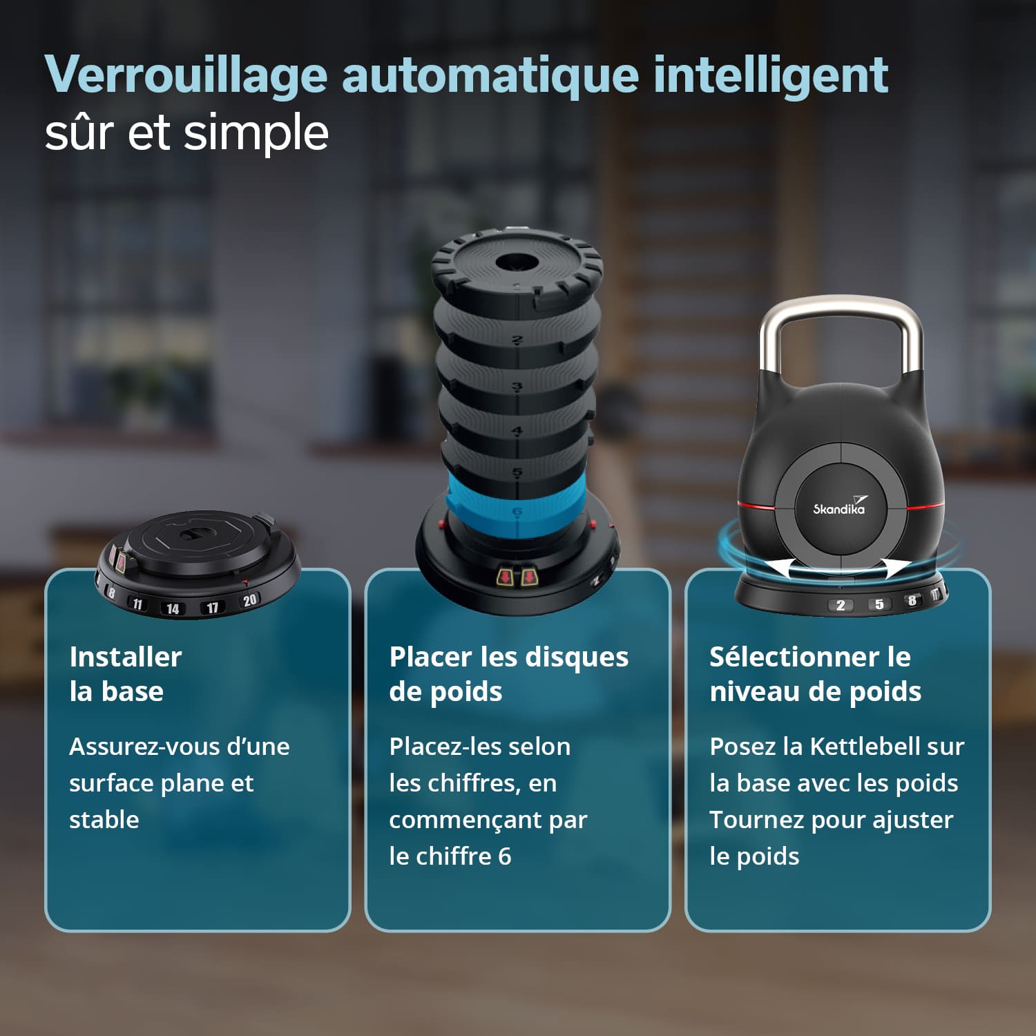 Alle nicht benötigten Gewichtsscheiben verbleiben automatisch auf der Basis. Umständliches manuelles Wechseln zwischen einzelner Kettlebells entfällt komplett und spart wertvolle Trainingszeit.