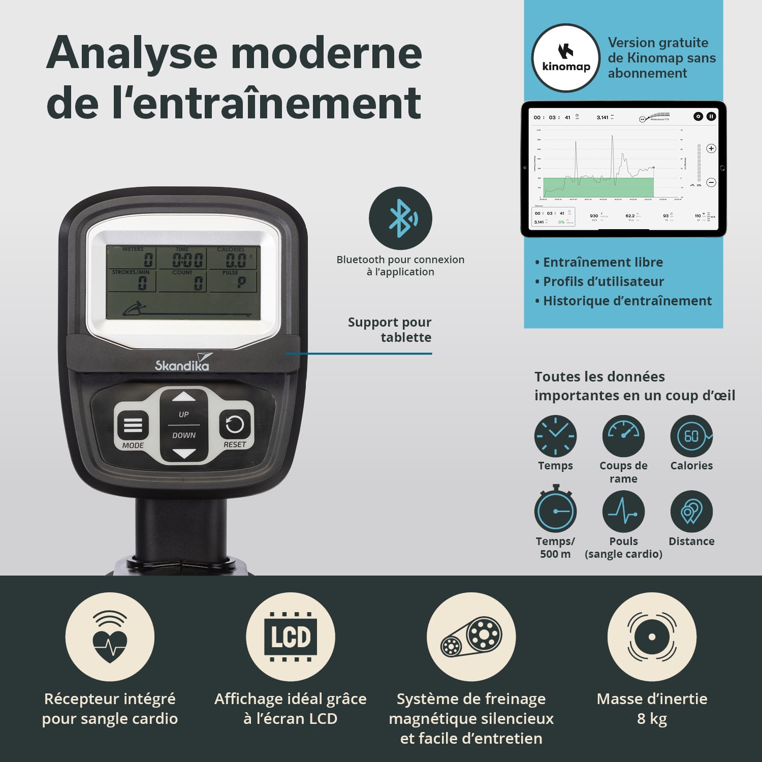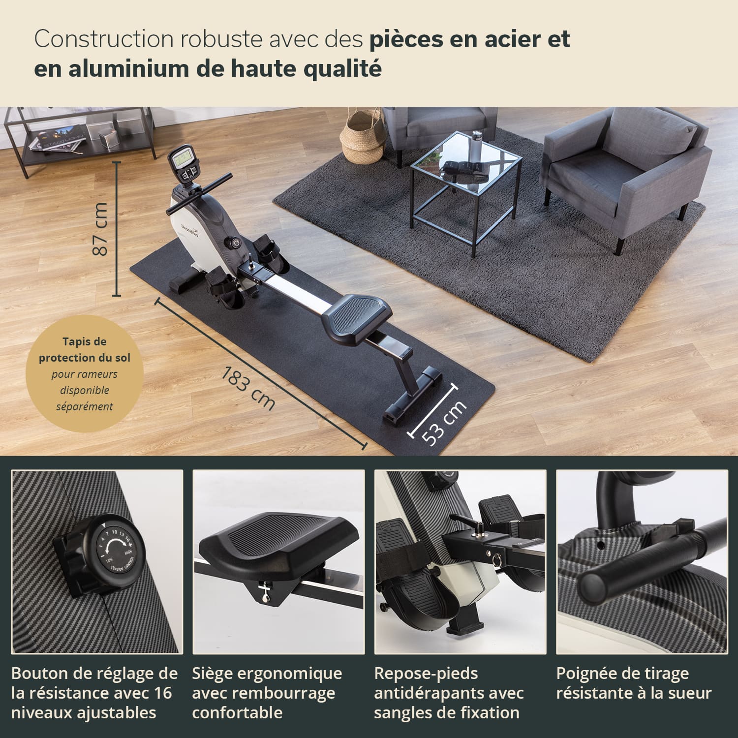 Das wartungsarme und flüsterleise Magnetbremssystem gleitet geschmeidig ohne merkbare Verzögerungen und das Schwungmassensystem von 8 kg erzeugt einen flüssigen Ruderzug. Die 16 manuell einstellbaren Widerstandsstufen ermöglichen ein individuelles Training für alle Leistungslevel.
