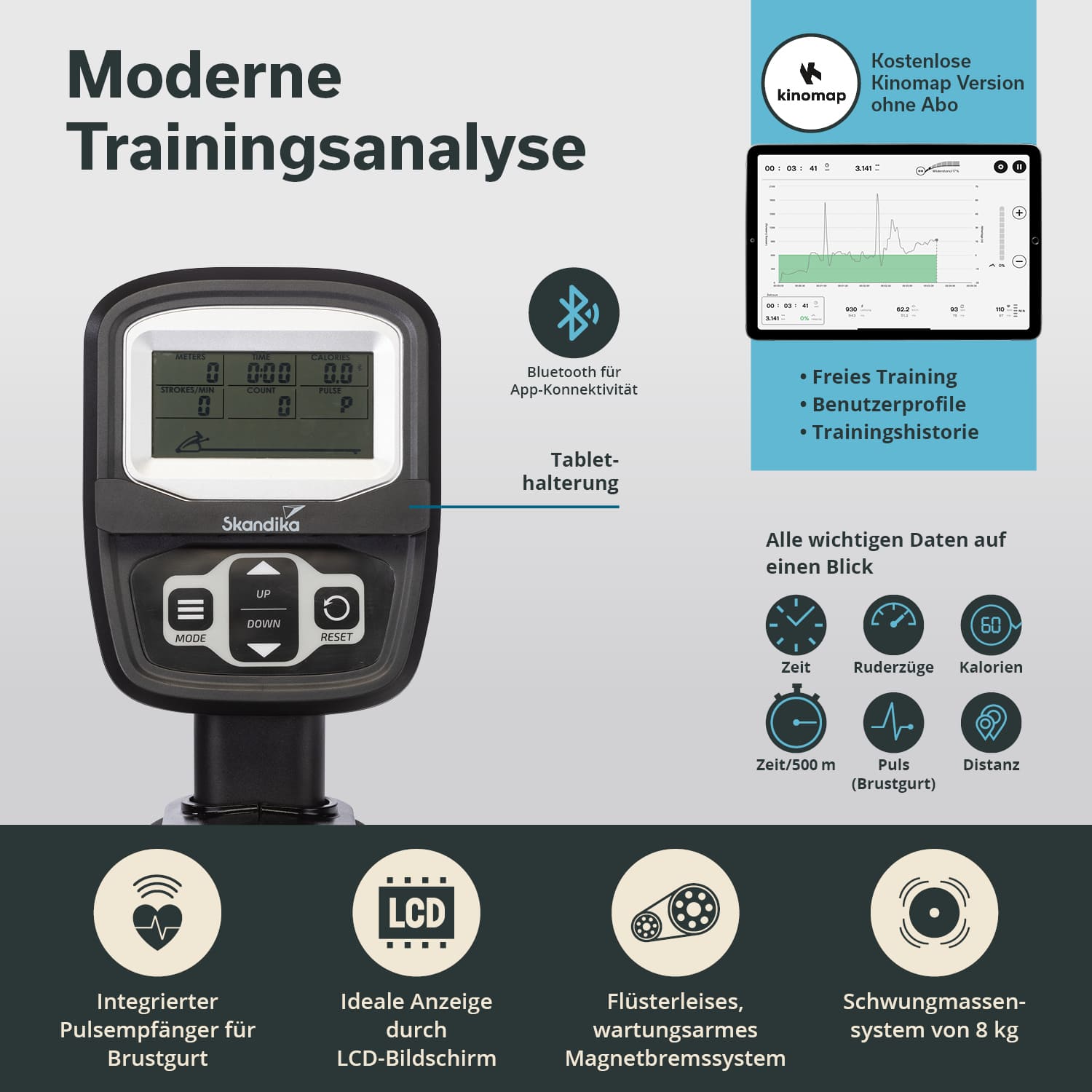 - Große LCD-Display-Anzeige: Ruderschläge, Distanz, Puls, Zeit, Kalorien