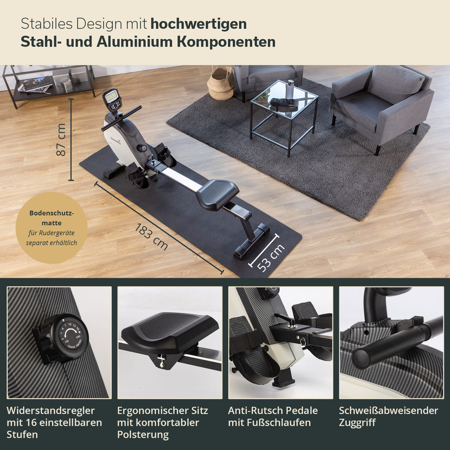 Die stabile und hochwertige Konstruktion ermöglicht ein komfortables Training für eine Körpergröße bis 190 cm und bis zu einem maximalen Benutzergewicht von 135 kg. Die Aufbaumaße des Rudergeräts betragen 193 × 57 × 86,5 cm.