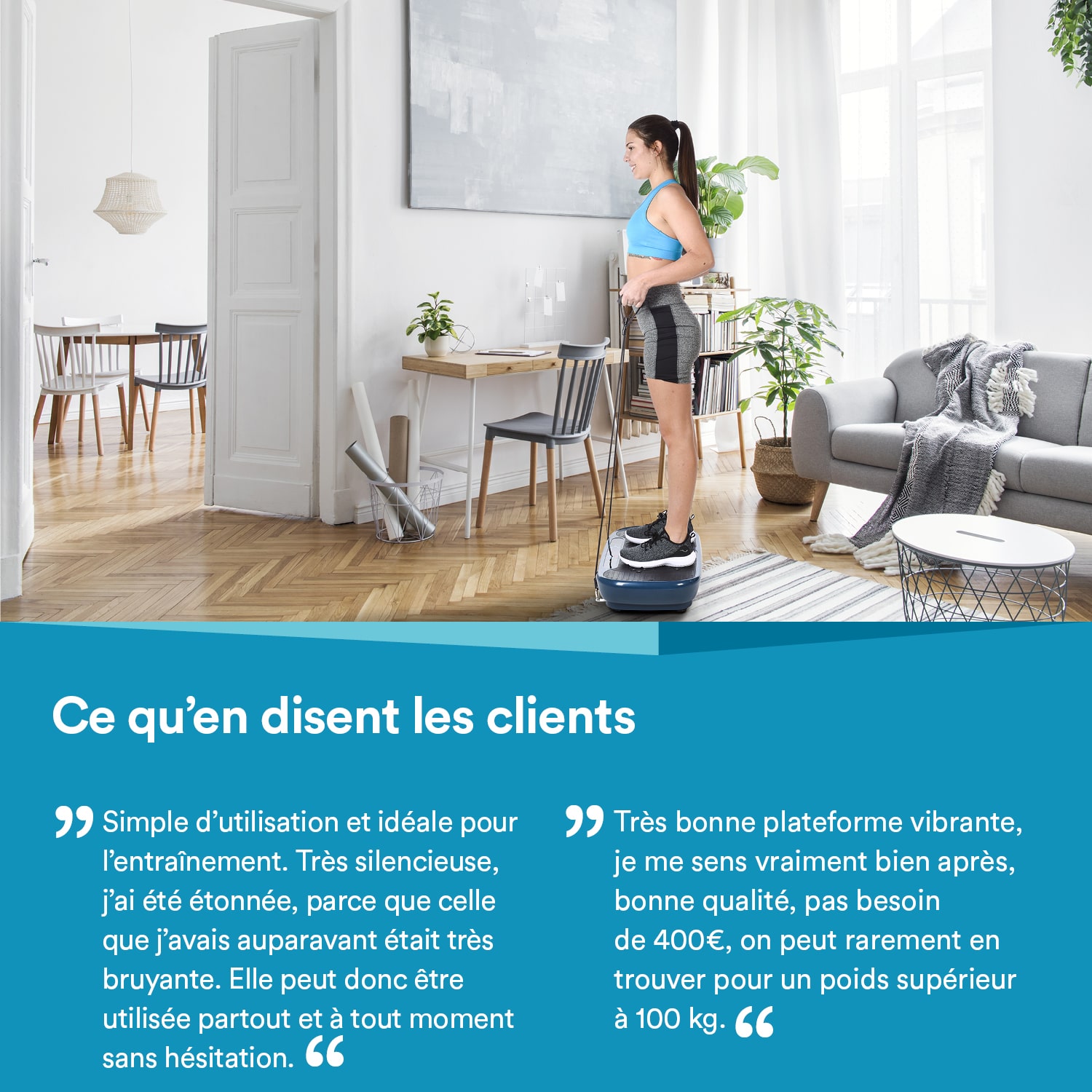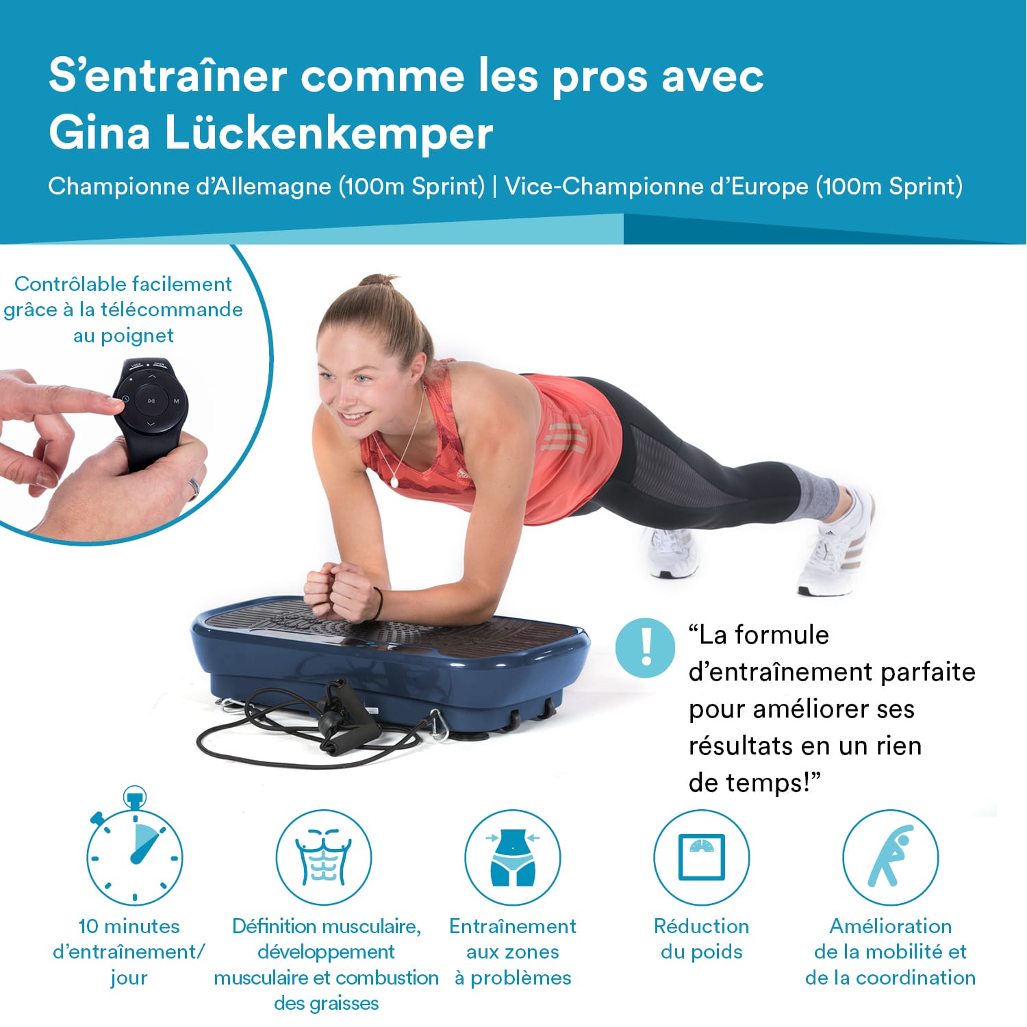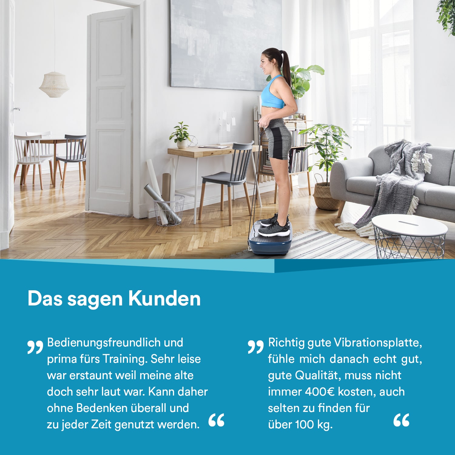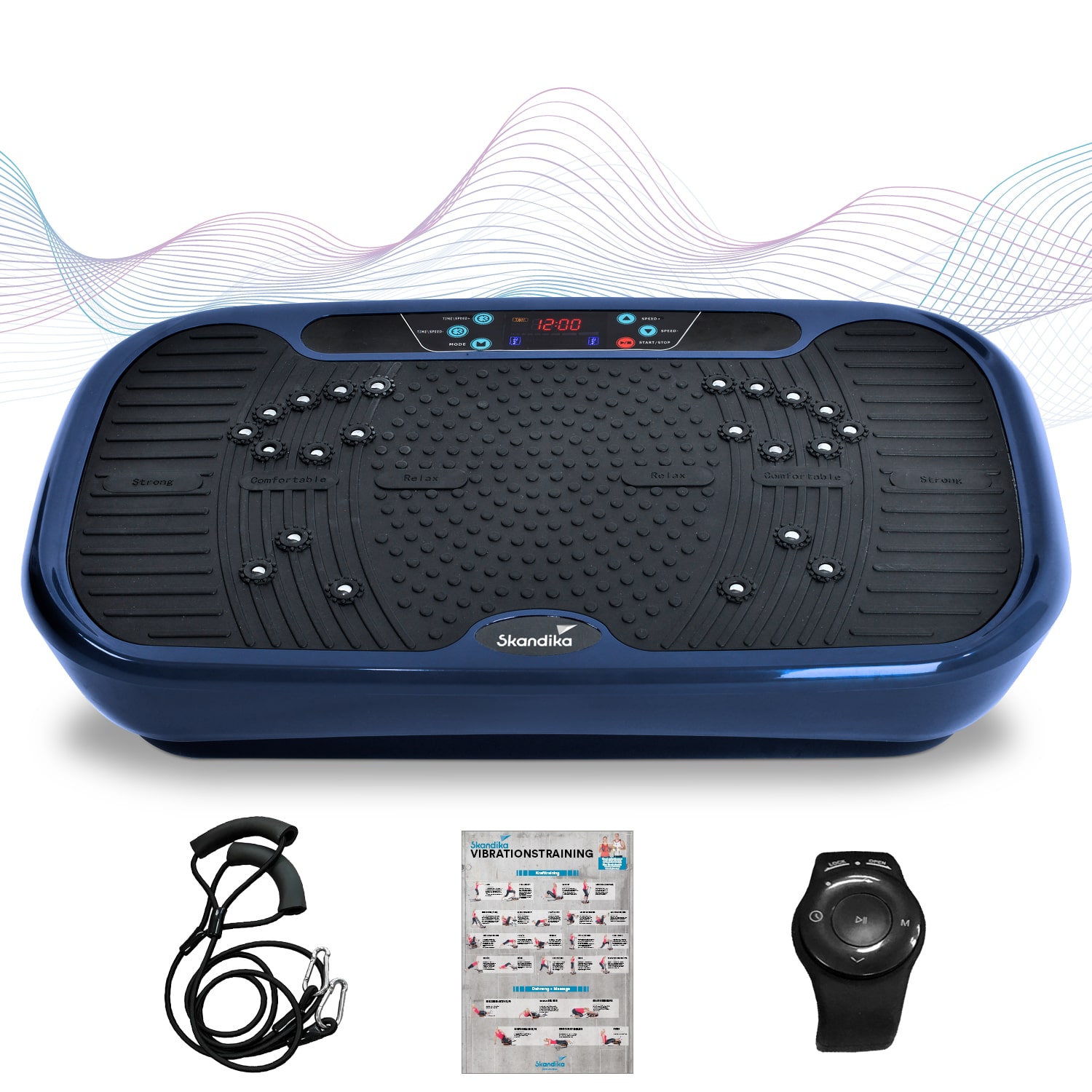 Komfortgröße zum Komfortpreis. Unsere Vibrationsplatte V1 überzeugt durch eine große Trittfläche und einen schmalen Kostenaufwand. 10 Minuten täglich genügen, um die Ausdauer zu steigern, Gewicht zu reduzieren und Muskeln zu kräftigen. Dabei liegt die Betonung auf „und", denn während man hier nur ein Gerät nutzt, muss man im Studio für die einzelnen Partien und einen vergleichbaren Trainingseffekt auf verschiedenen Geräten trainieren. Für eine individuell abgestimmte Trainingseinheit stehen 60 Geschwindigkeitsstufen in 5 Programmen und einem manuellen Modus zur Verfügung – einfach steuerbar über die einzigartige Armband-Fernbedienung. Die Trainingsgurte machen das Training abwechslungsreich und ermöglichen zusätzliche Übungen. So wird die Vibrationsplatte V1 zum vielseitigen Trainingsgerät mit einem hervorragenden Preis-Leistungsverhältnis.