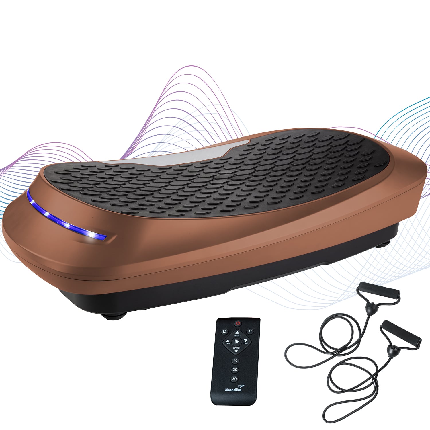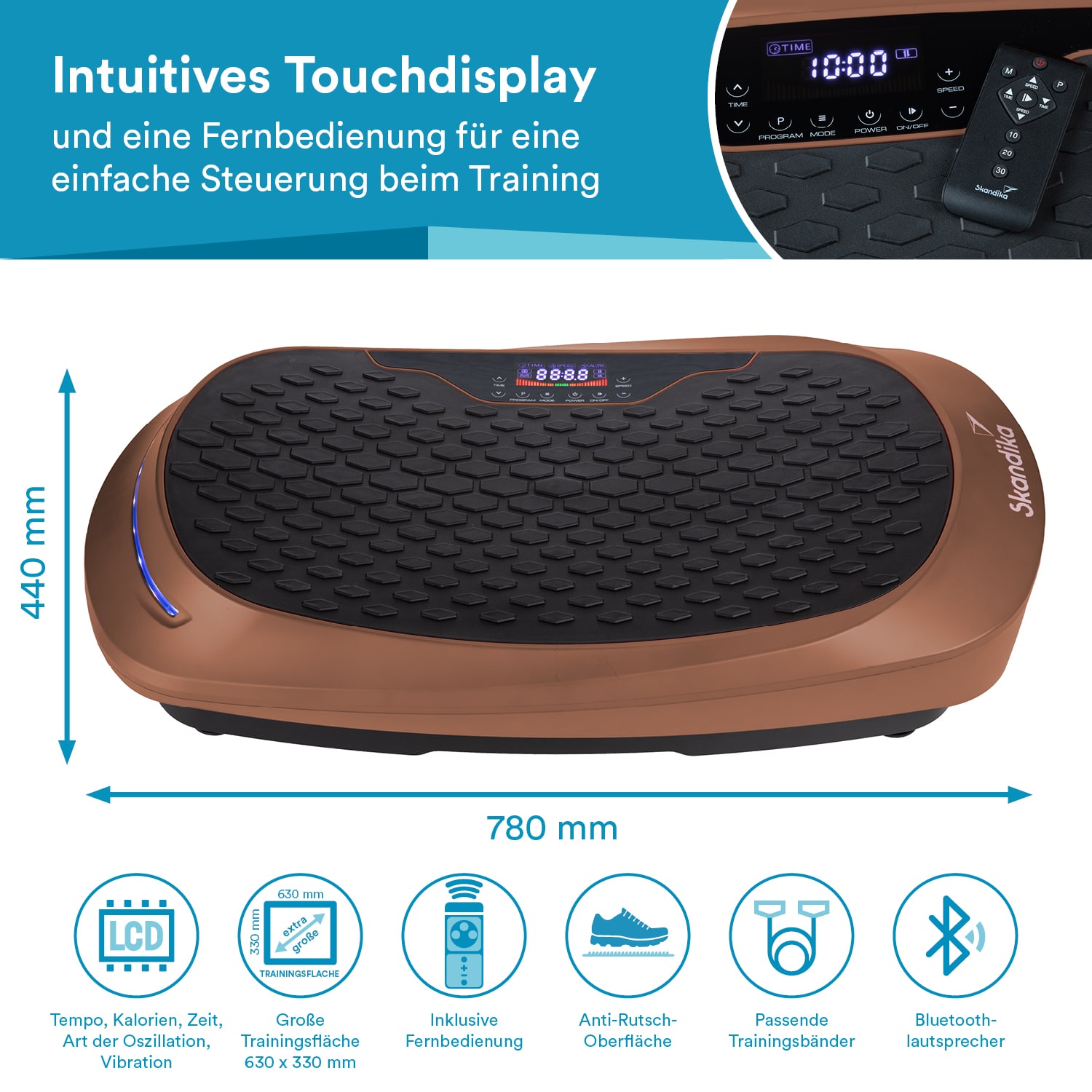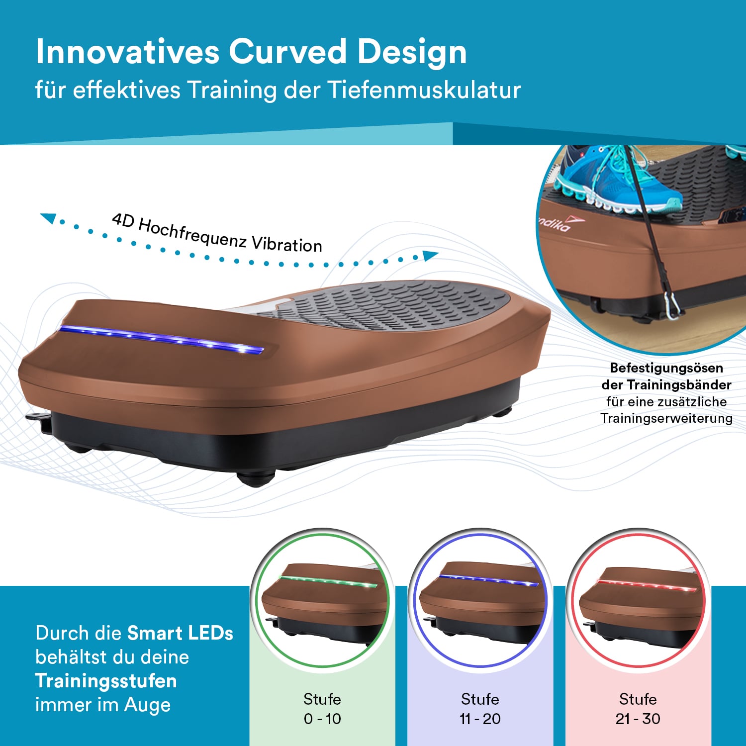 Neben der direkten Einstellung der Platte durch das farbige Touchdisplay ist auch eine Fernbedienung im Lieferumfang enthalten, um ein komfortables Training zu gewährleisten. Um den Trainingsumfang immer im Auge zu behalten, liefern die seitlichen Smart-LEDs optische Signale und sorgen so mit ihren drei Farben für den perfekten Überblick der 30 möglichen Intensitätsstufen.
