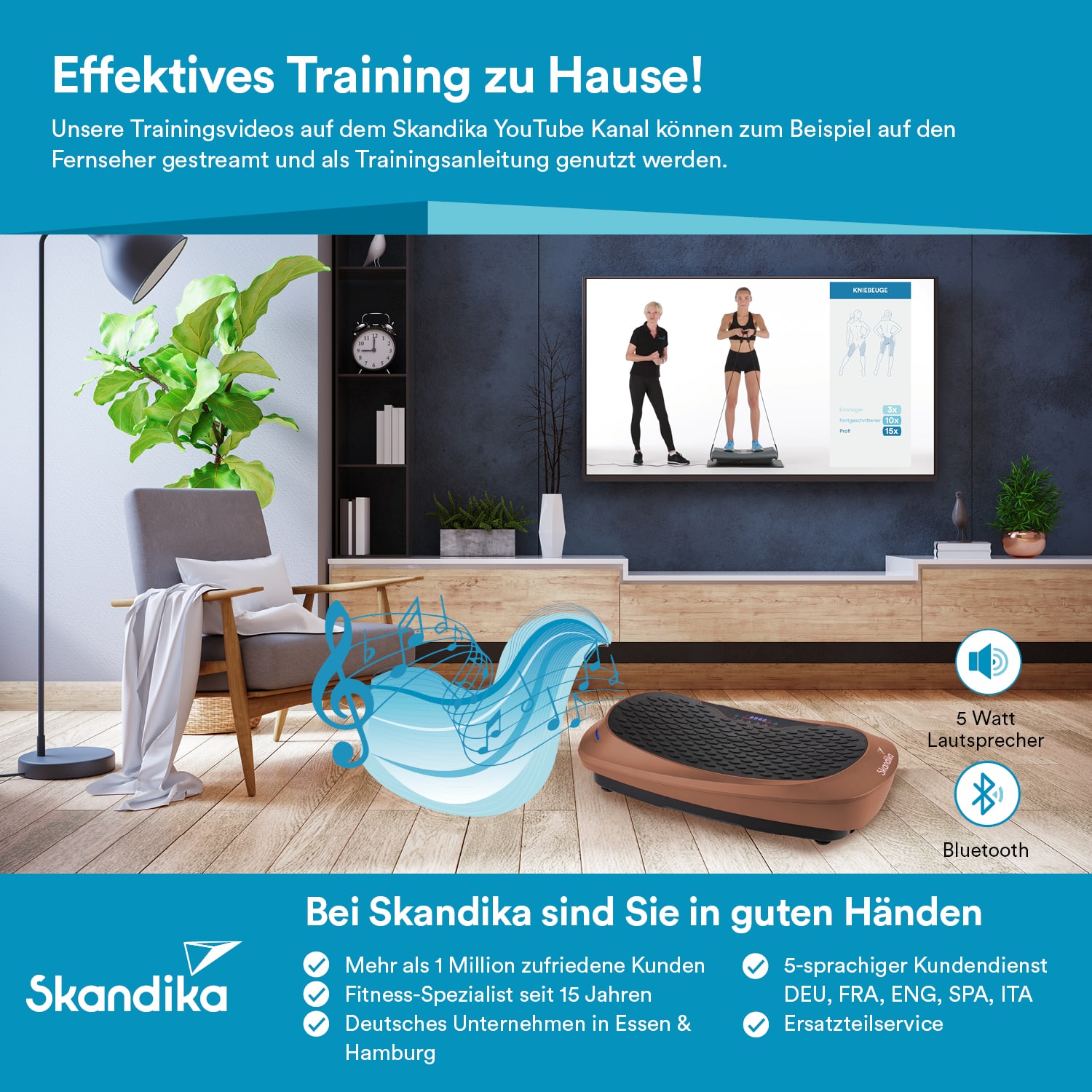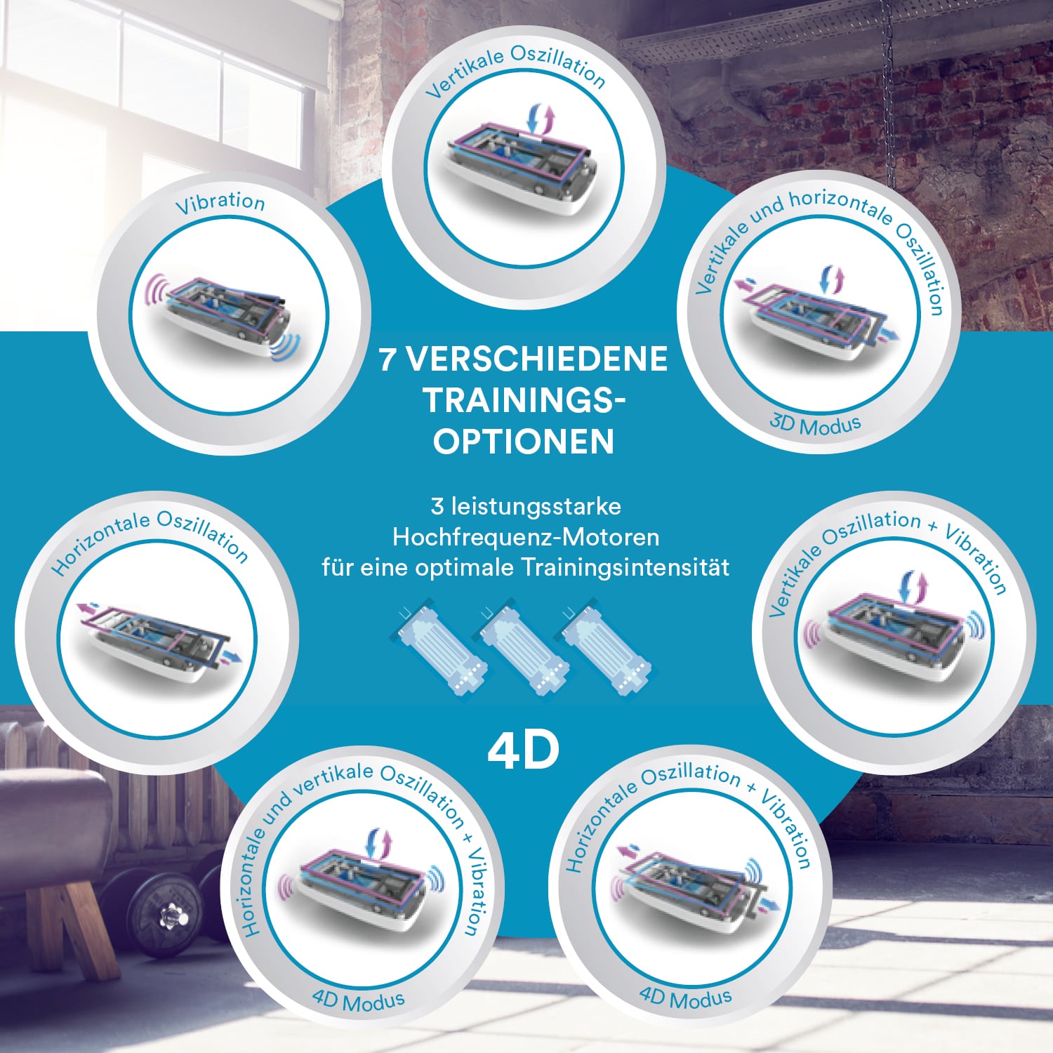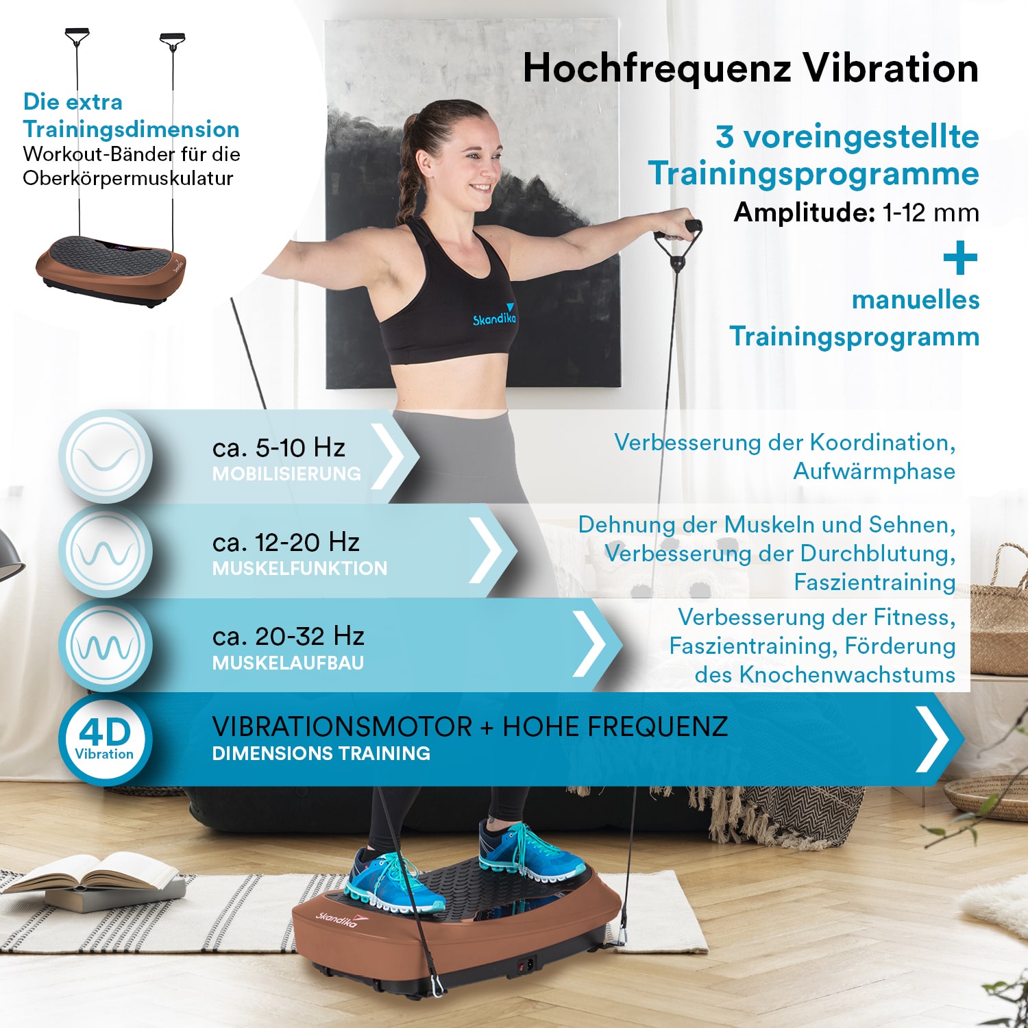 Keinen Platz für einen vollausgestatteten Fitnessraum zu Hause? Dann ist das kompakte Multitalent V2500 von Skandika die perfekte Lösung. Unser innovatives Trial-DC-System mit 3 leistungsstarken Motoren kombiniert die klassische Vibration mit Hightech Oszillation, sodass eine 4D Vibrationstechnologie entsteht – eine optimale Trainingssymbiose aus Vibration und Schwingung in einem.