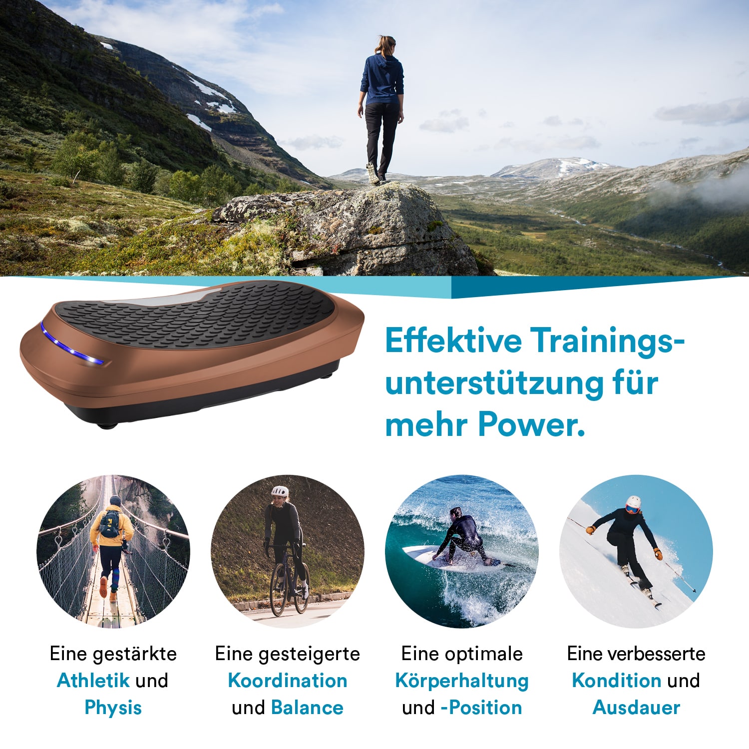 Egal ob für Muskeldefinition, Muskelaufbau und Fettverbrennung, für Problemzonentraining und Gewichtsreduzierung oder für allgemeine Fitness, Beweglichkeit und Koordination, die V2500 ist ein Multitalent, wenn es um effektives Vibrationstraining geht. Kurzes, intensives Training ist der Schlüssel zum Erfolg. Das innovative Curved Design mit der besonders großen Anti-Rutsch-Oberfläche sieht nicht nur optisch top aus, sondern sorgt zudem für ein effektives Training der Tiefenmuskulatur. Bei regelmäßiger Nutzung zeigen sich positive Ergebnisse bei nur 10 Minuten Training täglich.