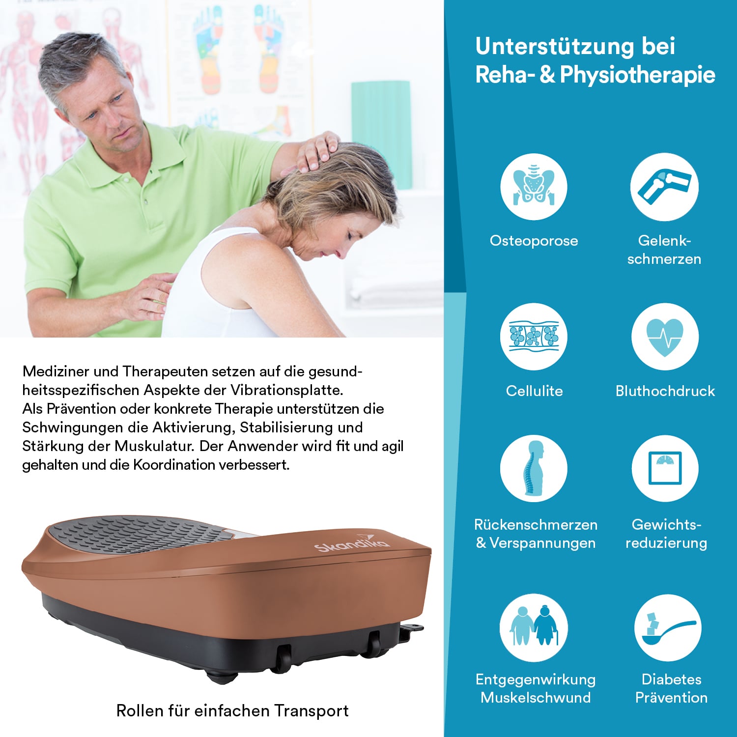 Vibrationsplatten werden auch zu Therapie- und Rehabilitationszwecken erfolgreich eingesetzt. Osteoporose, Bluthochdruck oder Diabetes sind nur ein paar Krankheitsbilder, die mit Vibrationstraining vorgebeugt oder gelindert werden können.