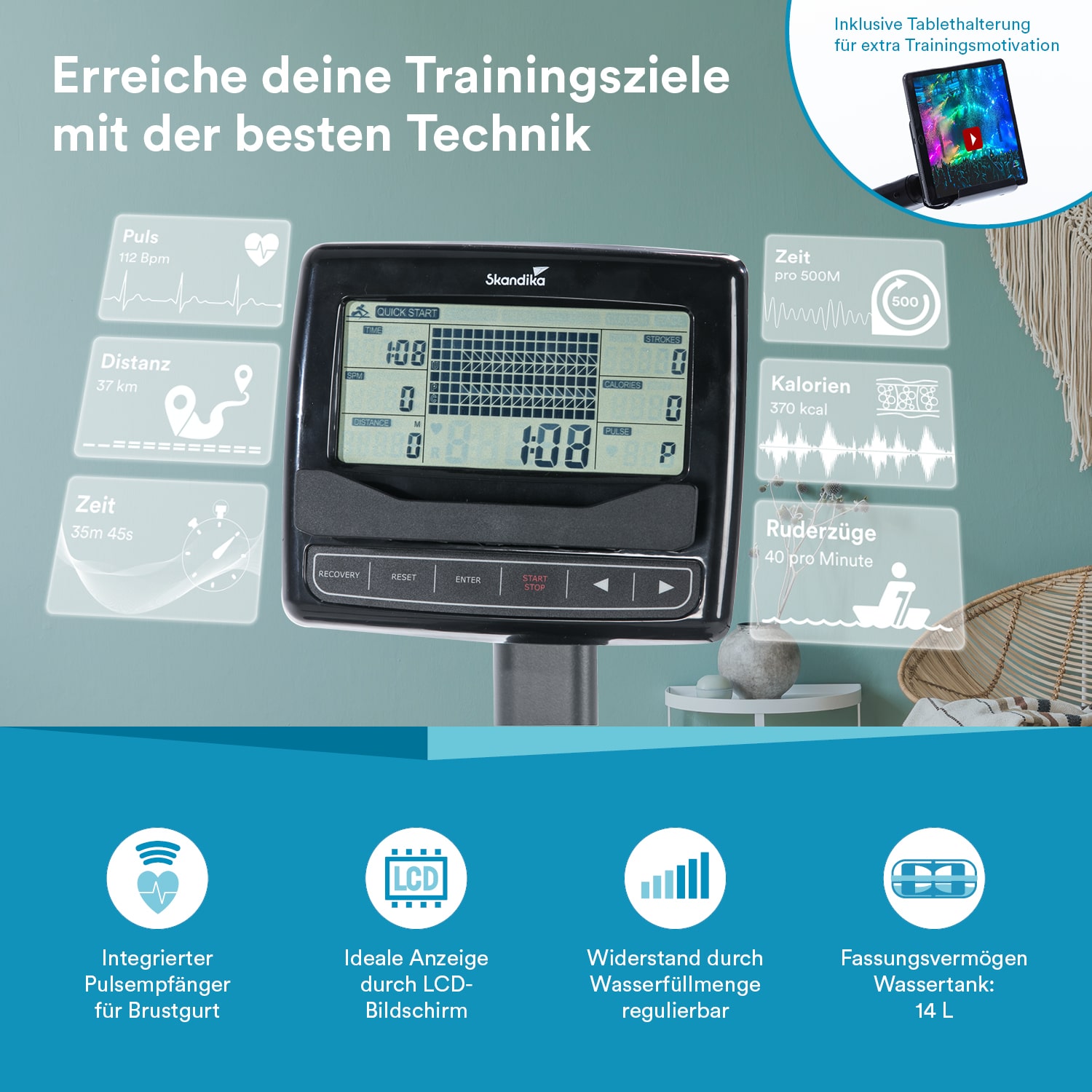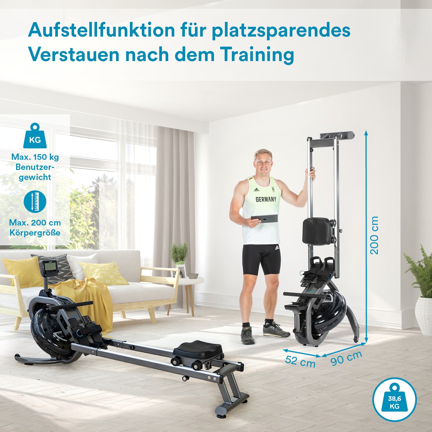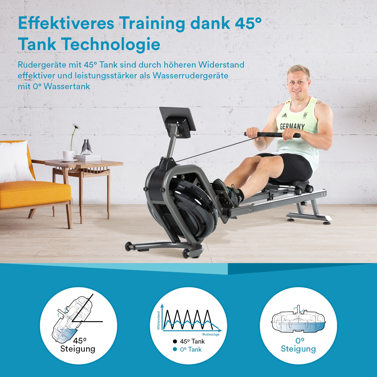 Der Widerstand ergibt sich zum einen durch die Wasser-Füllmenge und zum anderen durch den Kraftaufwand, der beim Ruderzug aufgebracht wird. Der Wassertank ist aus bruchsicherem Kunststoff gefertigt und fasst bis zu 14 Liter.