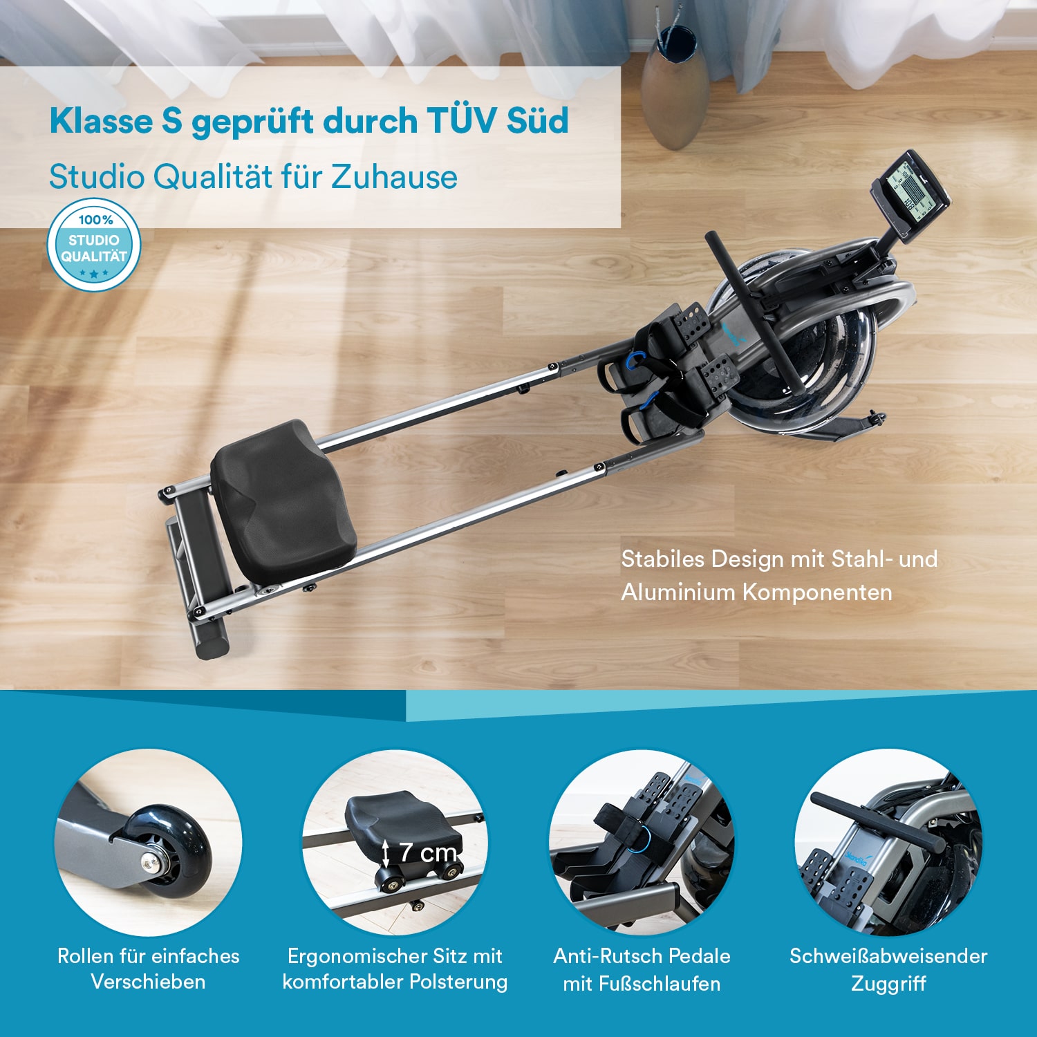 Das Nemo IV Rudergerät mit Wasserwiderstand hat Studioqualität geprüft durch den TÜV Süd. Es handelt sich also um ein Trainingsgerät von hoher Qualität und Langlebigkeit – der ideale Heimtrainer für ein effektives Training zu Hause.