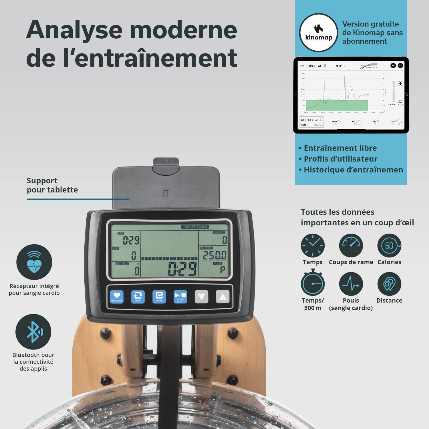 Der innovative Trainingscomputer mit großem LCD-Display ist leicht zu bedienen und zeigt alle wichtigen Trainingsdaten an, wie Anzahl der Schläge, Schläge pro Minute, Entfernung, Kalorien, Zeit und Zeit pro 500 m. Der integrierte Empfänger für optional erhältliche Brustgurte (5,3 kHz) ermöglicht auch die Anzeige des Pulses.