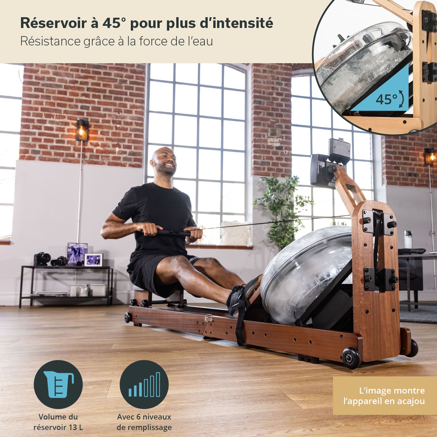 Durch die 45 Grad aufgestellten Ruderblätter wird ein größerer Widerstand erzeugt, der sich in den Trainingsergebnissen widerspiegelt. Das harmonische Trainingsgeräusch des Wassers schafft eine natürliche Atmosphäre und die geschmeidige Bewegung führt zu einem fließenden Trainingsablauf.