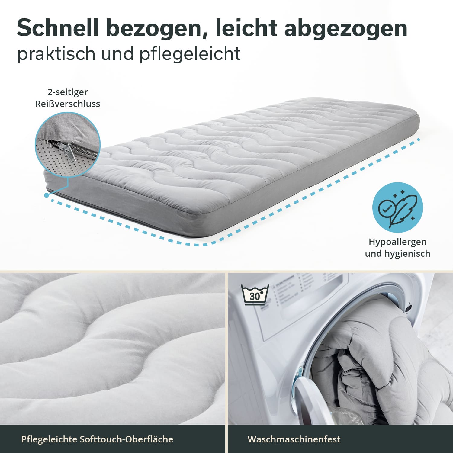 Pflegeleicht und hygienisch: der Bezug ist maschinenwaschbar bei 30 °C im Schonwaschgang und schnell wieder einsatzbereit.