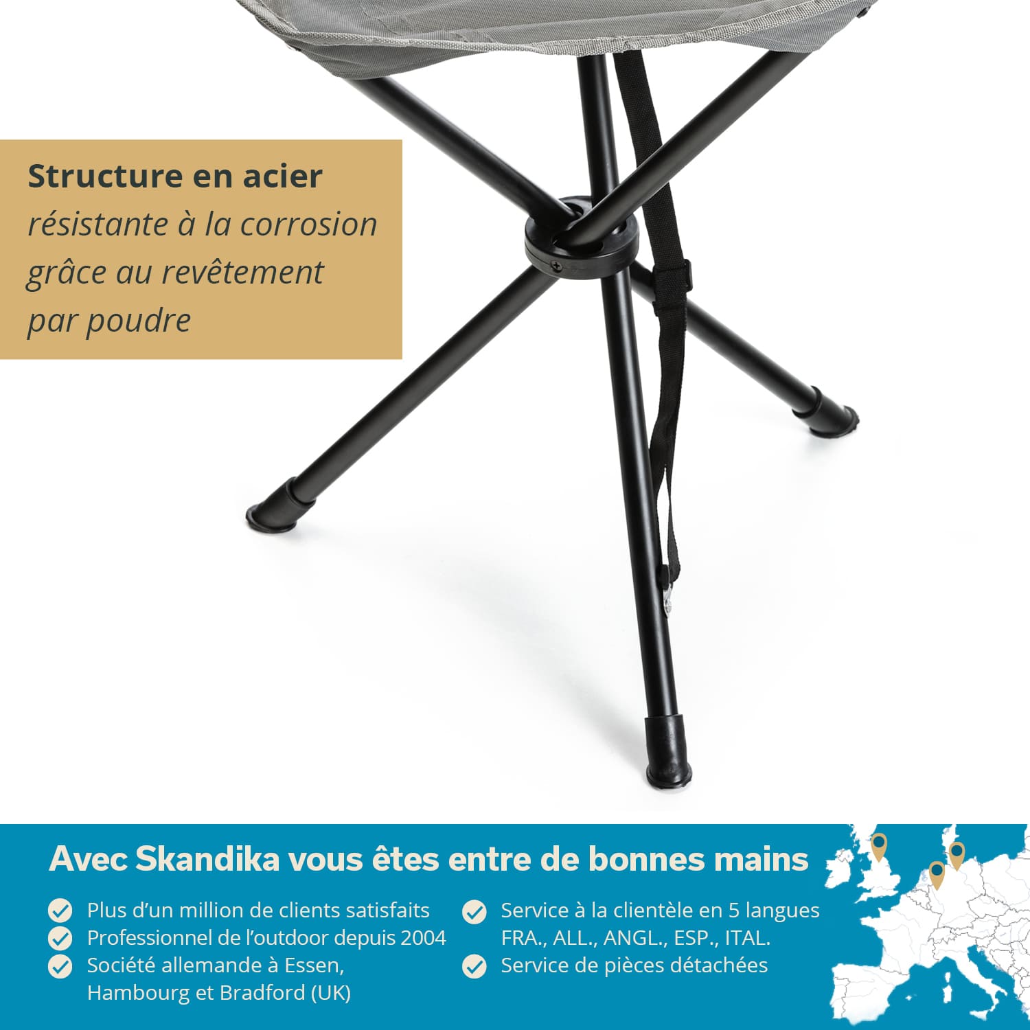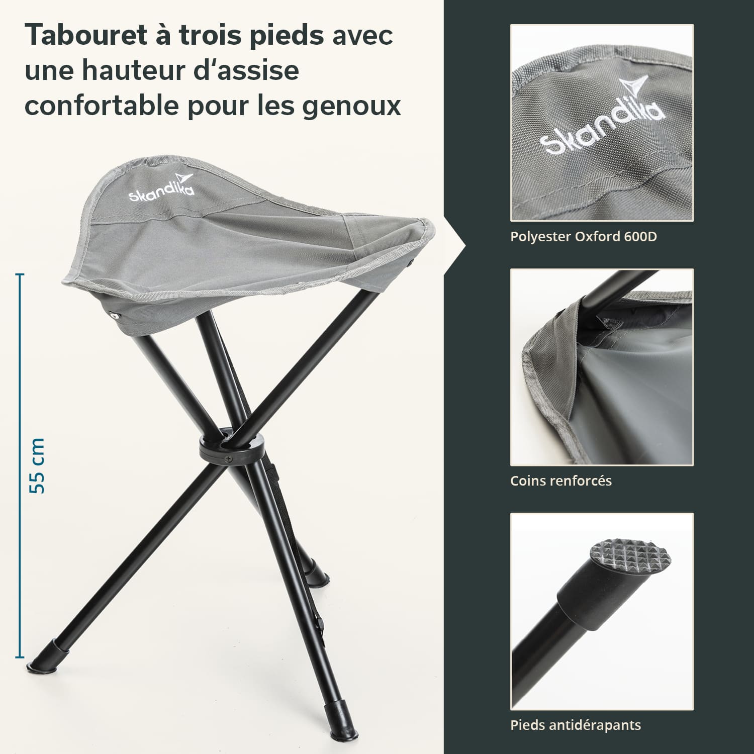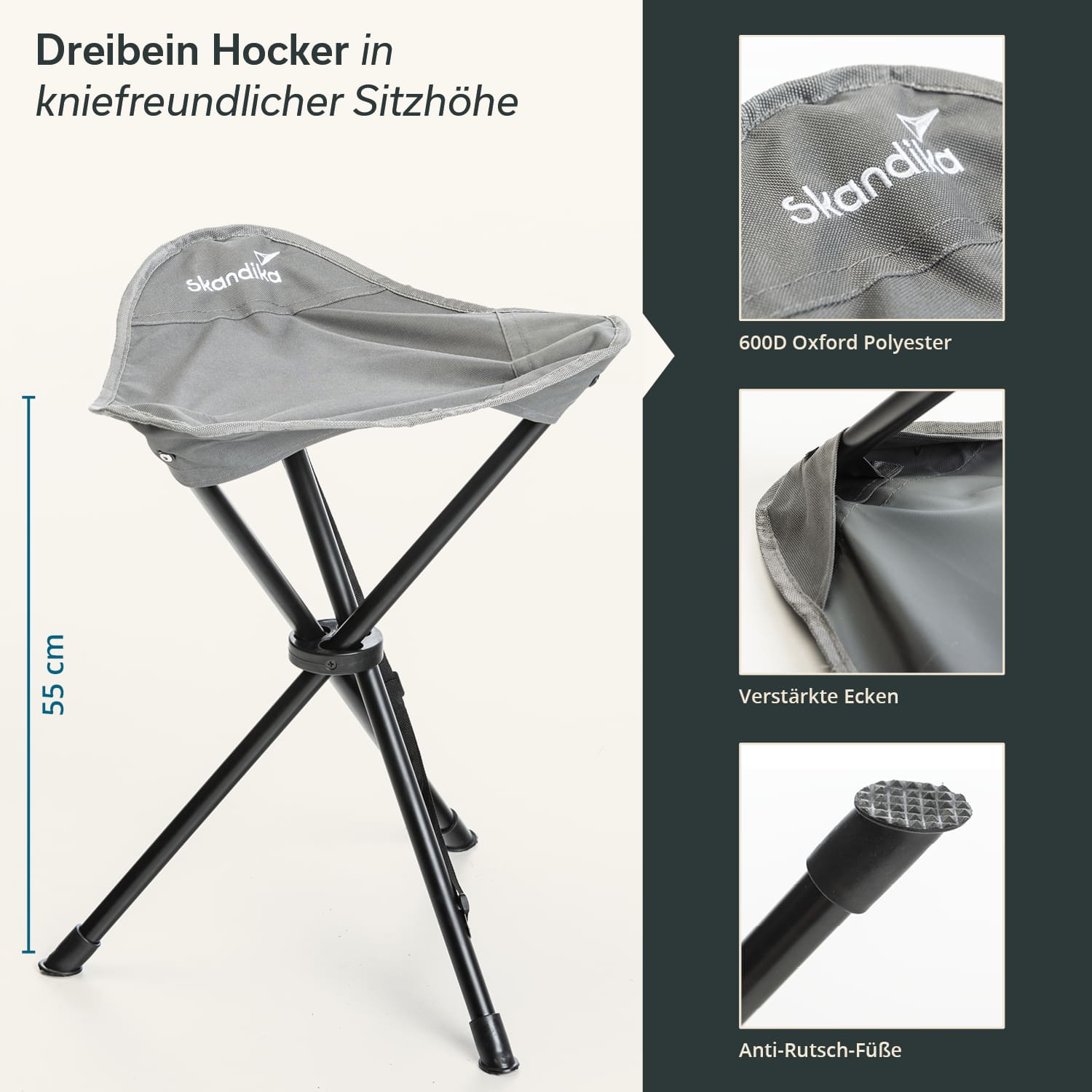 Der Dreibeinhocker hat eine angenehme Höhe und breite Sitzfläche aus strapazierfähigem, pflegeleichtem Oxford Polyester in steingrau, die für eine bequeme Sitzposition sorgt. Dank des robusten Stahlgestells im schlichten schwarz ist eine Belastung bis zu 100 kg kein Problem und rutschfeste Füße sorgen stets für einen sicheren Stand, selbst in unebenem Gelände.