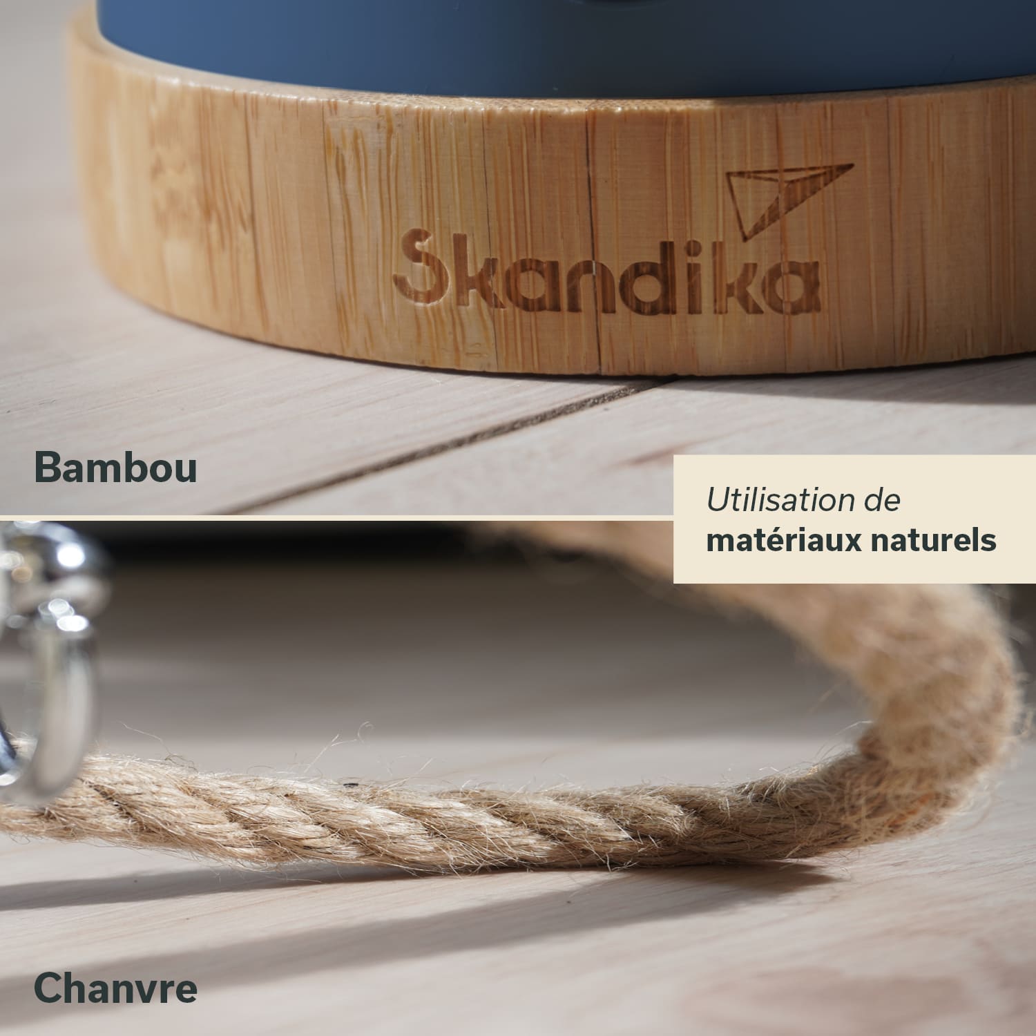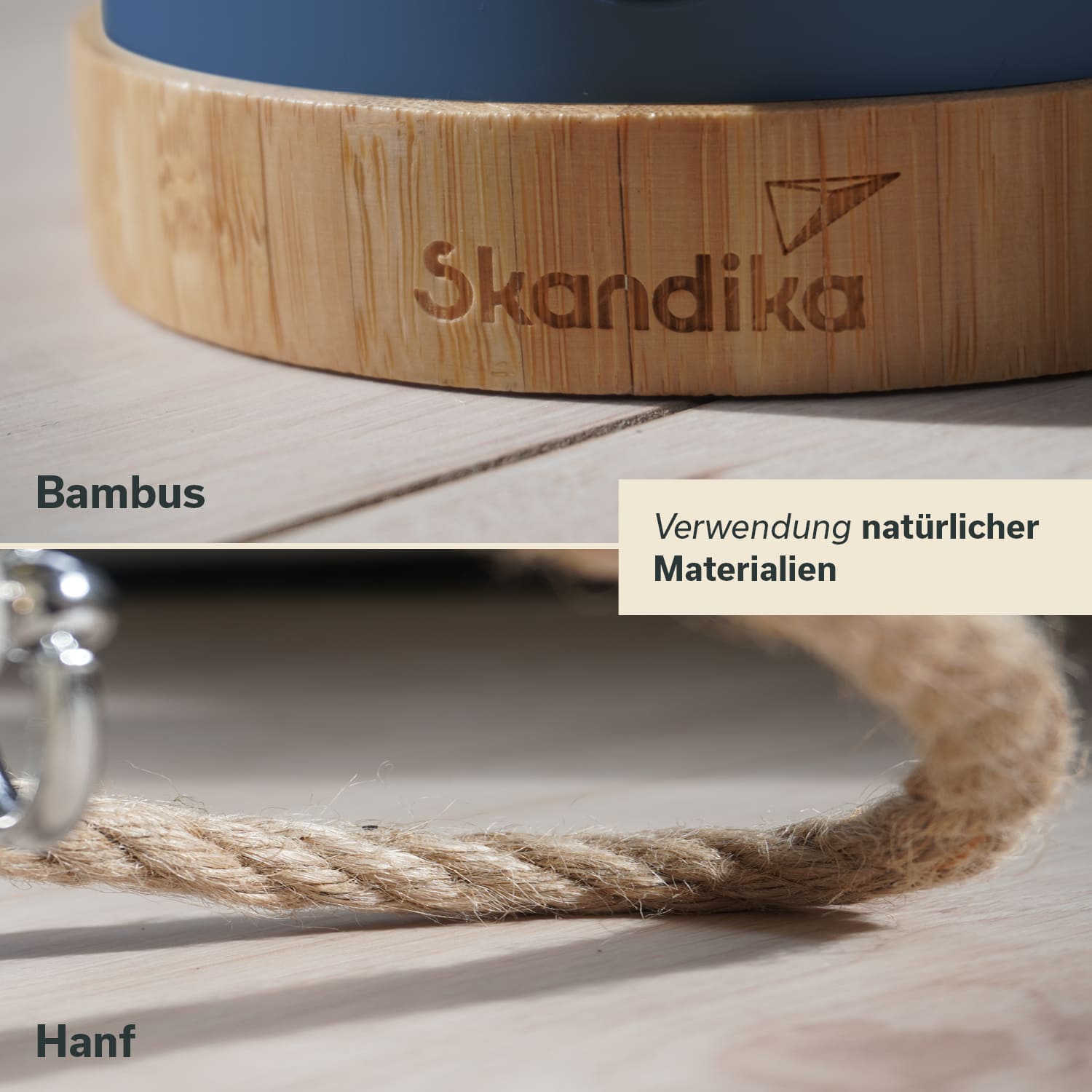 Das Hanfseil als auch der Bambussockel lassen die Laterne einerseits besonders stylisch aussehen, begünstigen andererseits aber auch ihre Langlebigkeit. Zudem ist sowohl Hanf als auch Bambus ein nachwachsender, nachhaltiger und ressourcenschonender Werkstoff.