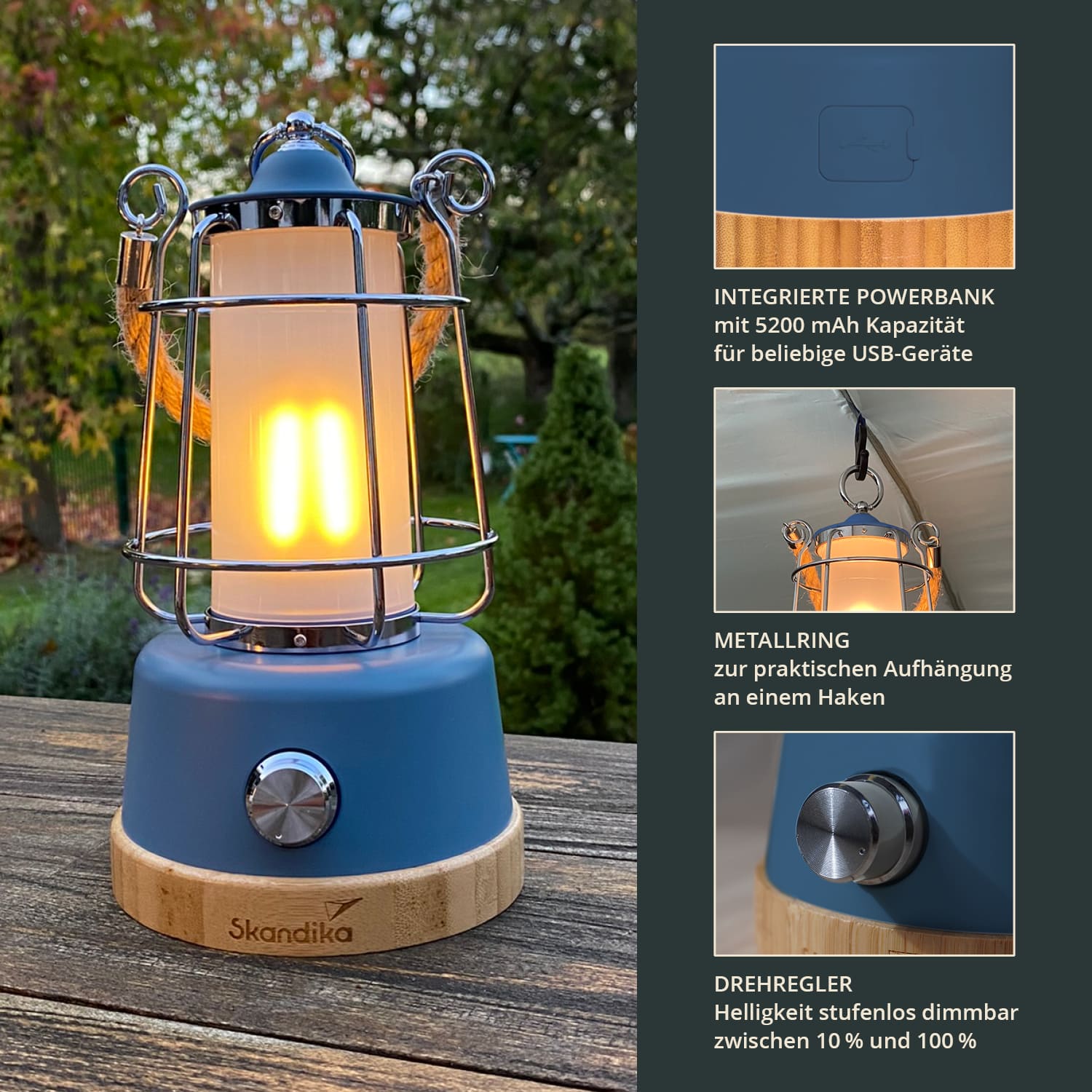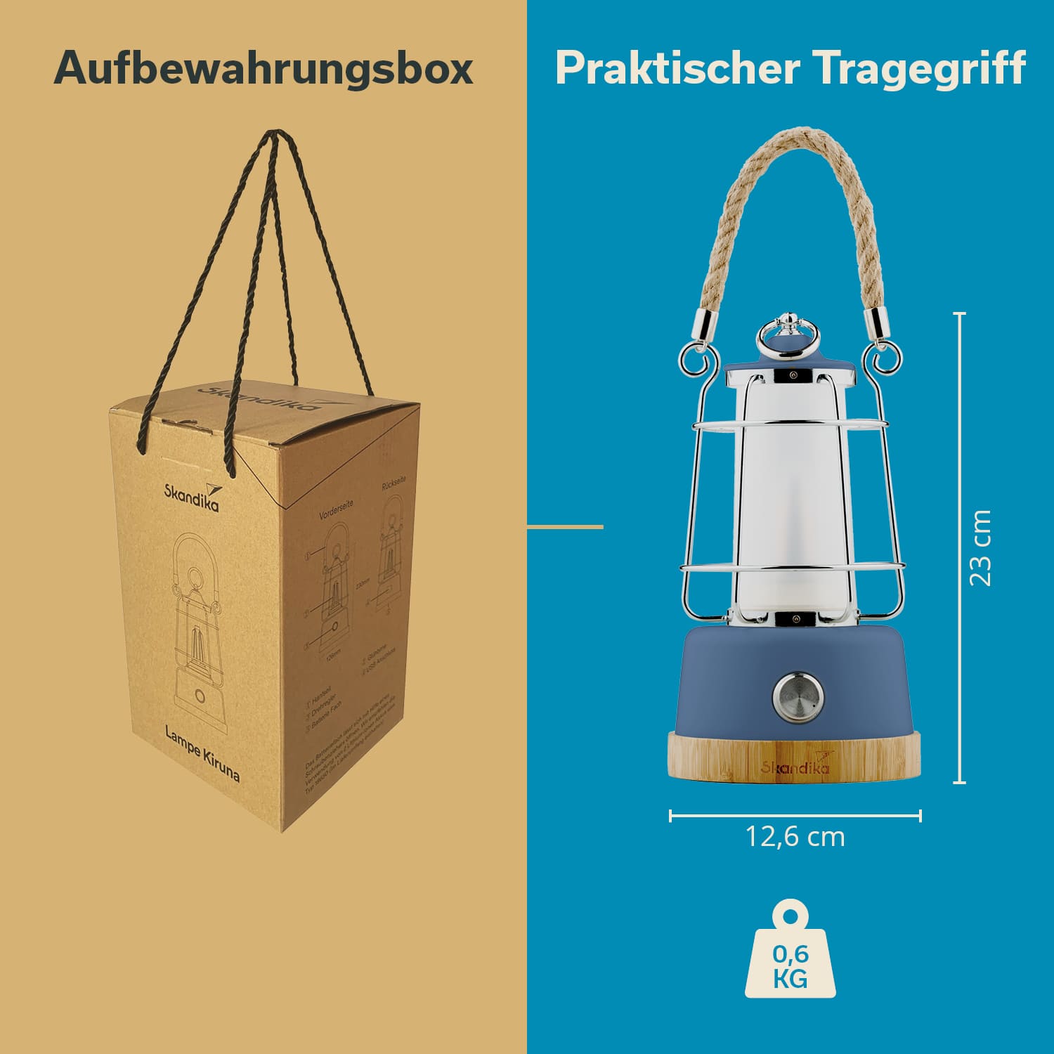 Mit 5200 mAh Akkukapazität und einer Akkulaufzeit von bis zu 75 Stunden spendet die Kiruna dank energiesparender LEDs bis zu 3 Tage Licht. Die Laterne kann dafür mit ihrer Öse an einen Zelthaken aufhängt, an ihrem Seil mit sich getragen oder problemlos abgestellt werden.