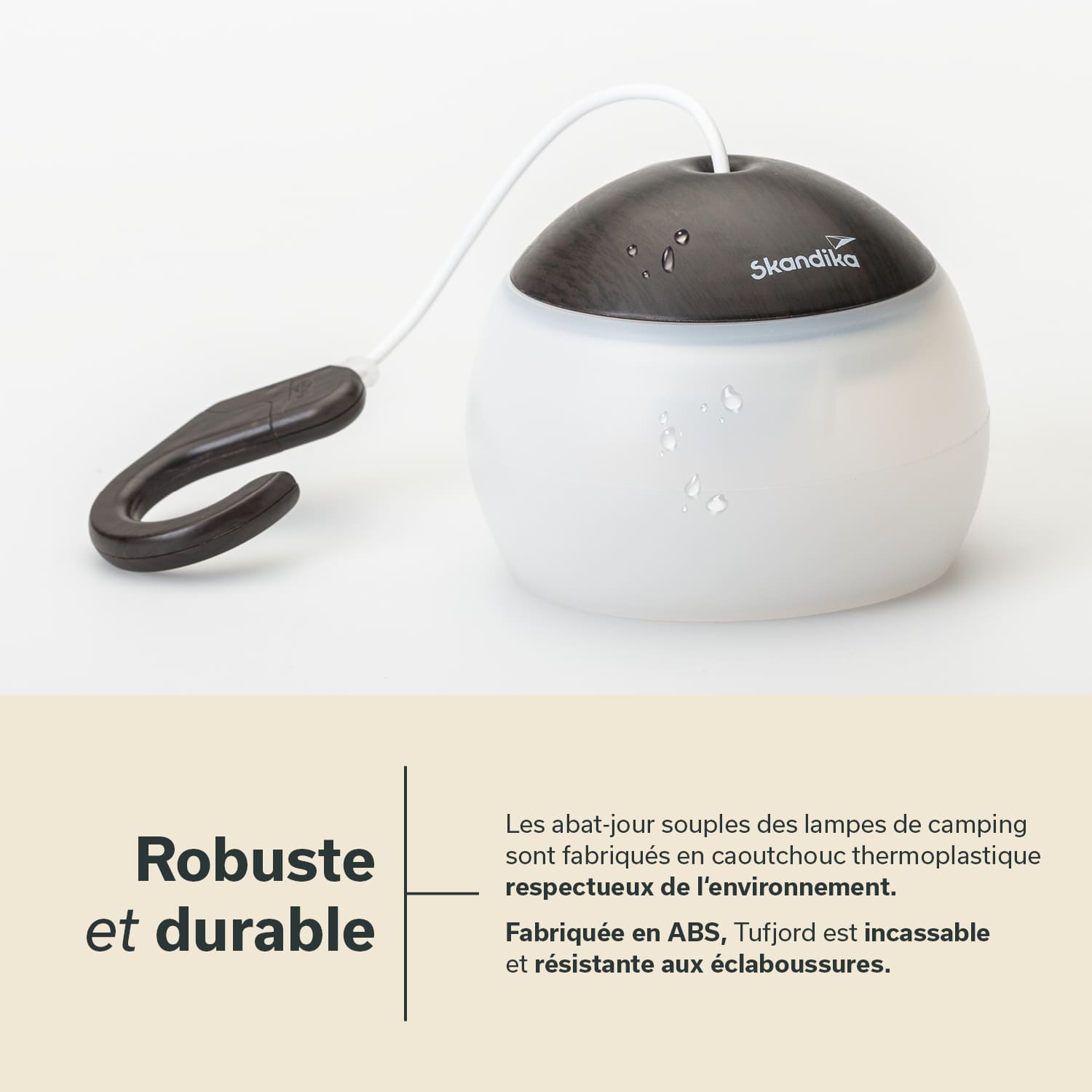 Die Tufjord hat ein schickes Gehäuse in schwarz und einen weichen Lampenschirm. Bruchsicher und spritzwassergeschützt, ist sie perfekt für den Einsatz beim Camping, beim Wandern oder bei jeder anderen Outdoor-Aktivität.