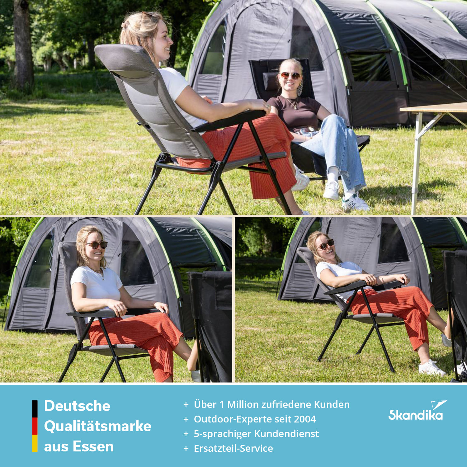Camping und Komfort schließen sich nicht aus – der Skandika Hochlehner Kvist vereint beides auf stilvolle Weise und in diesem Set sind gleich zwei Kvist Campingstühle enthalten. Mit seiner 4-fach verstellbaren Rückenlehne bietet dieser bequeme Klappstuhl maximale Flexibilität für verschiedene Outdoor-Situationen. Kvist eignet sich nicht nur perfekt für Campingliebhaber und Outdoor-Enthusiasten, sondern macht auch zu Hause auf dem Balkon, der Terrasse oder im Garten eine gute Figur.