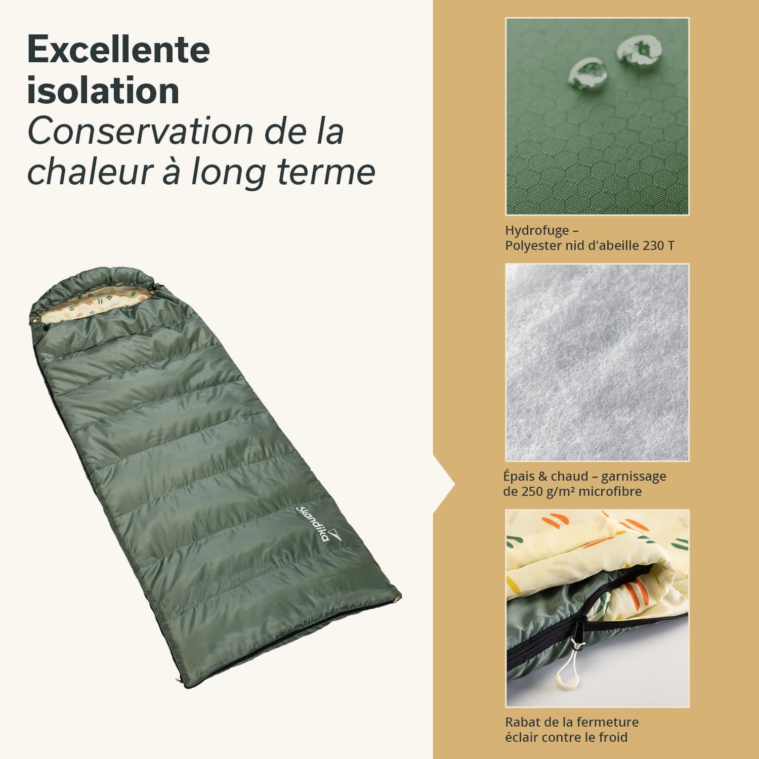 Mit einer 250 g/m² Mikrofaserfüllung ist der Iceland perfekt für 3-Jahreszeiten-Einsätze. Er bietet Komfort bei Temperaturen von 15 bis 5 °C – ideal für entspannte Nächte in der Natur.