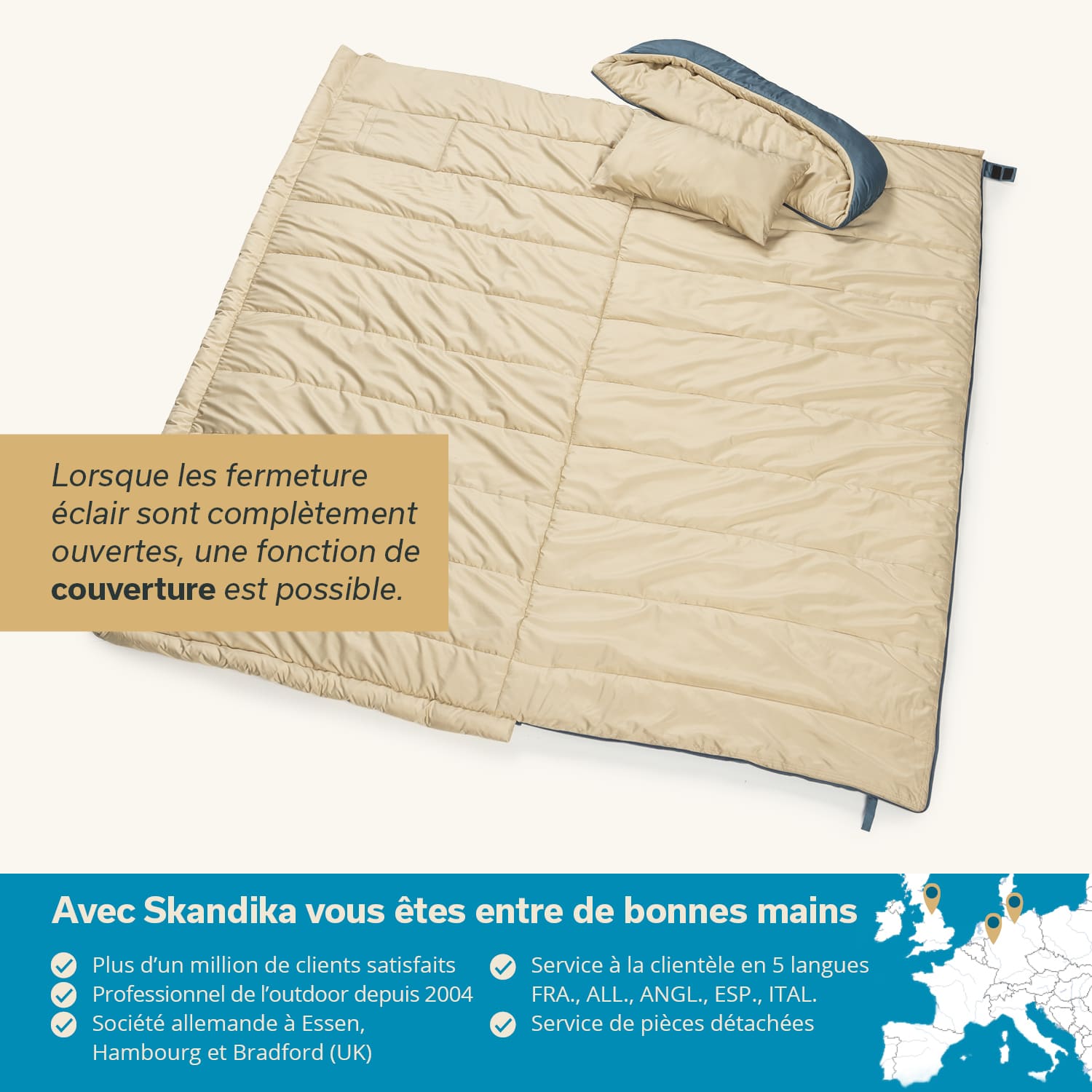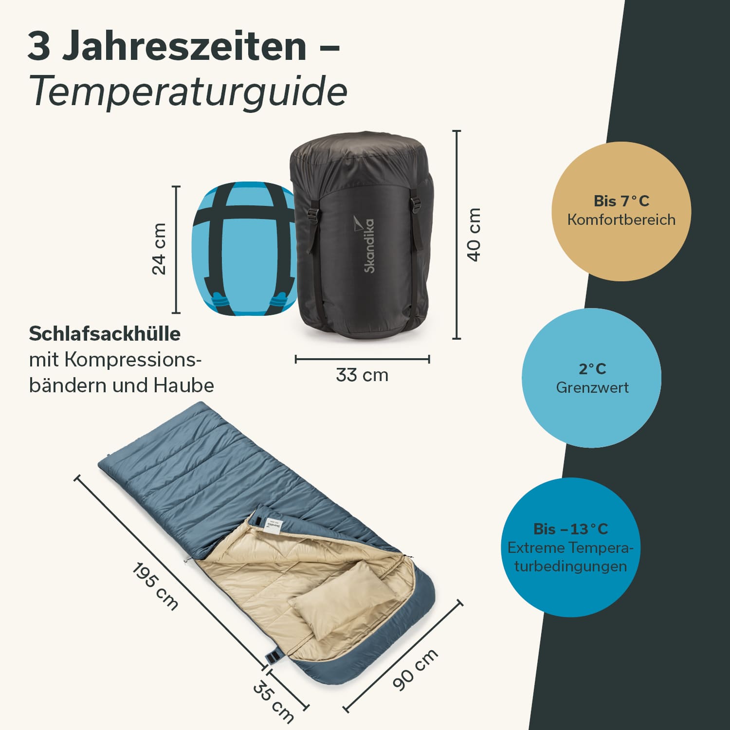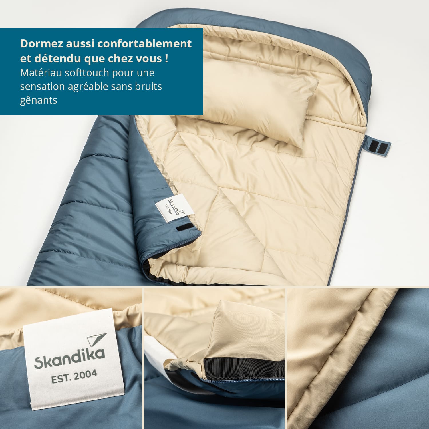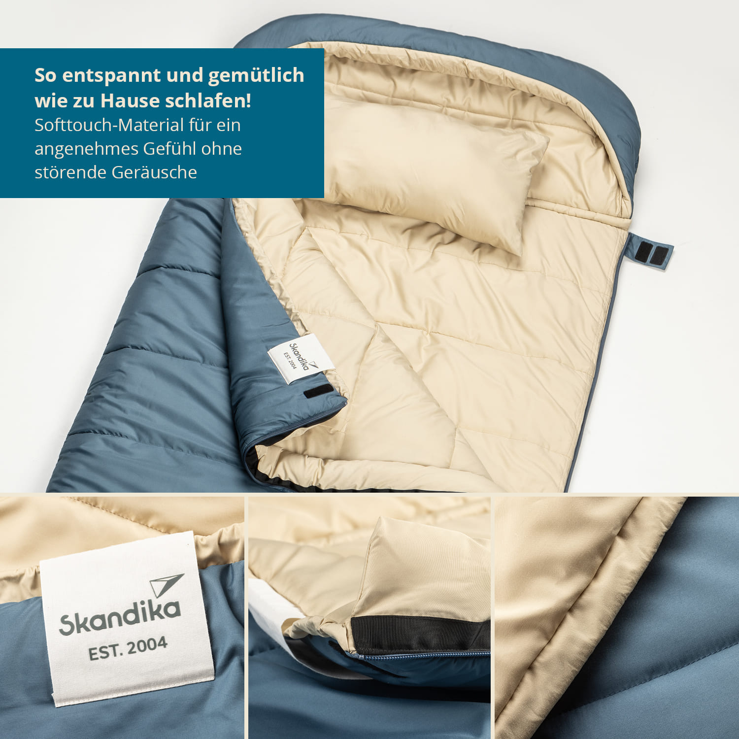 Das zeitlose, blau-beige Design wird dezent unterstrichen durch das hochwertige Skandika Branding Patch und die farblich abgestimmten Reißverschlüsse mit edlen Skandika Zughilfen. Skandika Oppdal bedeutet nicht nur hervorragend zu schlafen, sondern sich ebenfalls stylisch in Szene zu setzen!