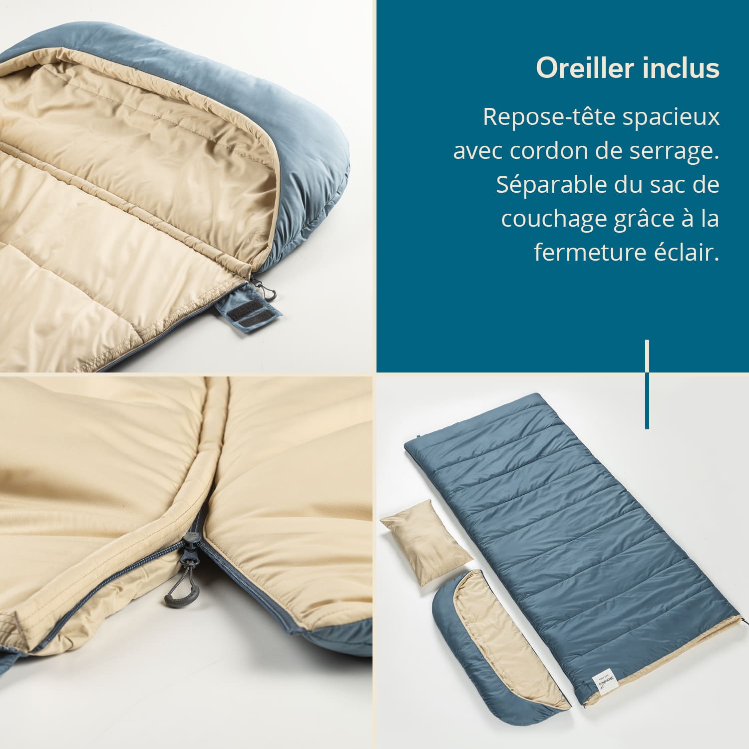 Eine kleine Tasche mit Klettverschluss im Inneren des Schlafsacks hält Smartphone oder Schlüssel sicher und griffbereit. Dank Reißverschluss kann das Kopfteil komplett vom Schlafsack abgetrennt werden, damit der Schlafsack bei geöffnetem Reißverschluss zu einer großen, rechteckigen Decke ausgebreitet werden kann – Perfekt für Picknicks!