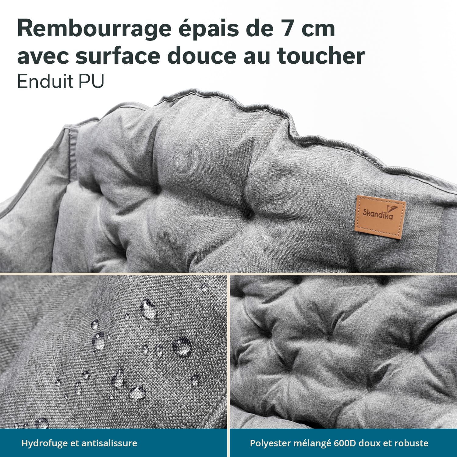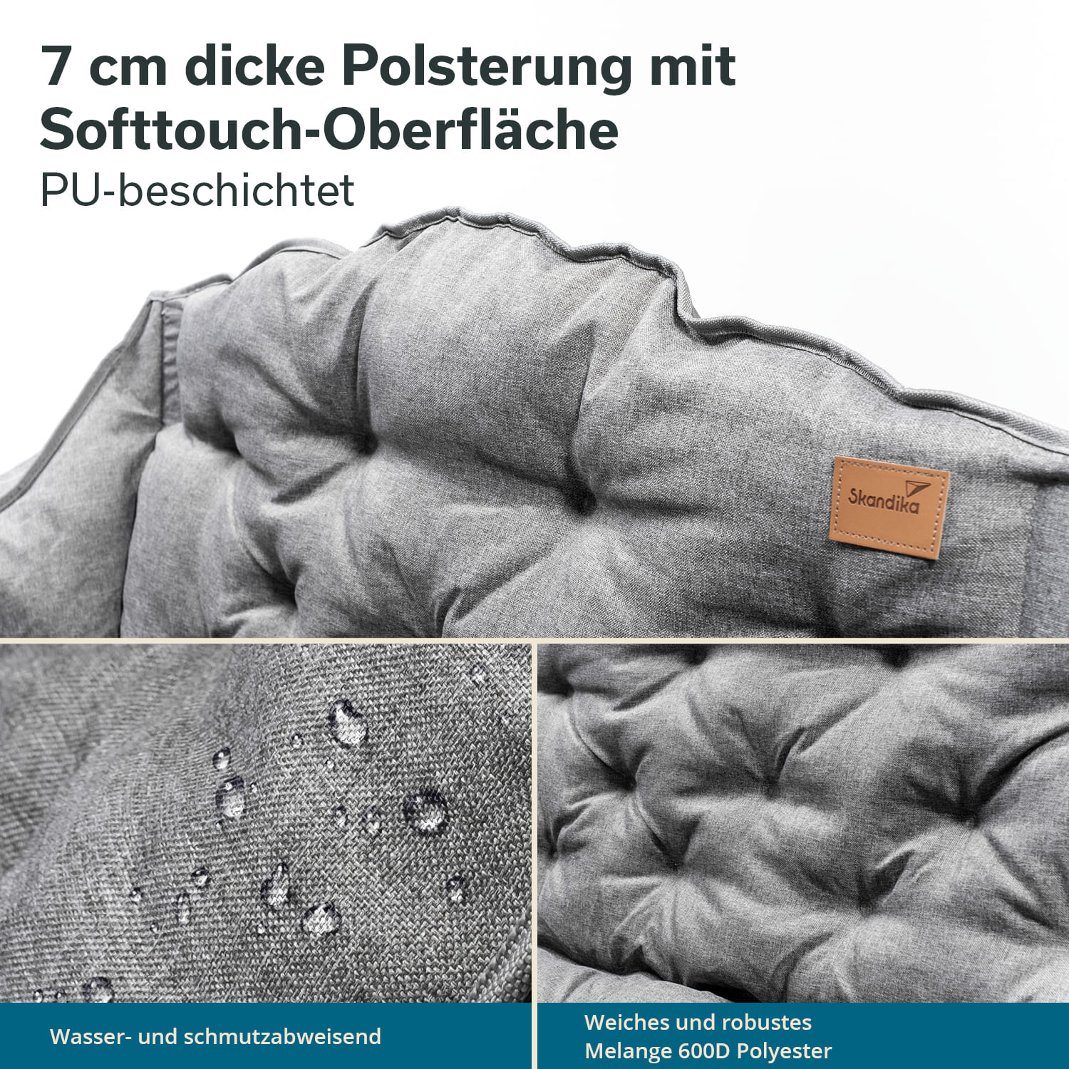 Hochwertiger graumelierter Bezug mit dezentem Skandika-Patch in Lederoptik – schick genug für Festival, Camping oder Balkon.