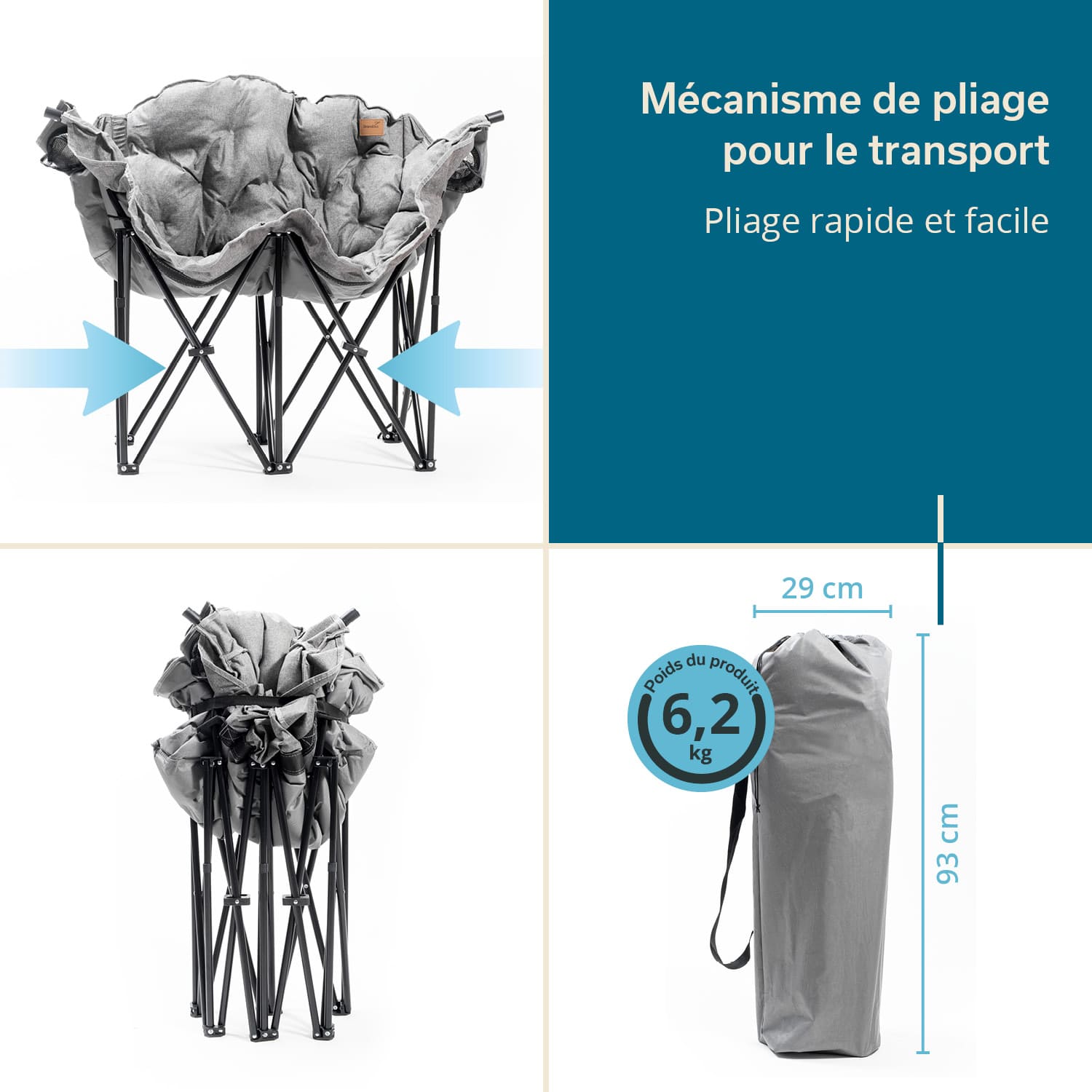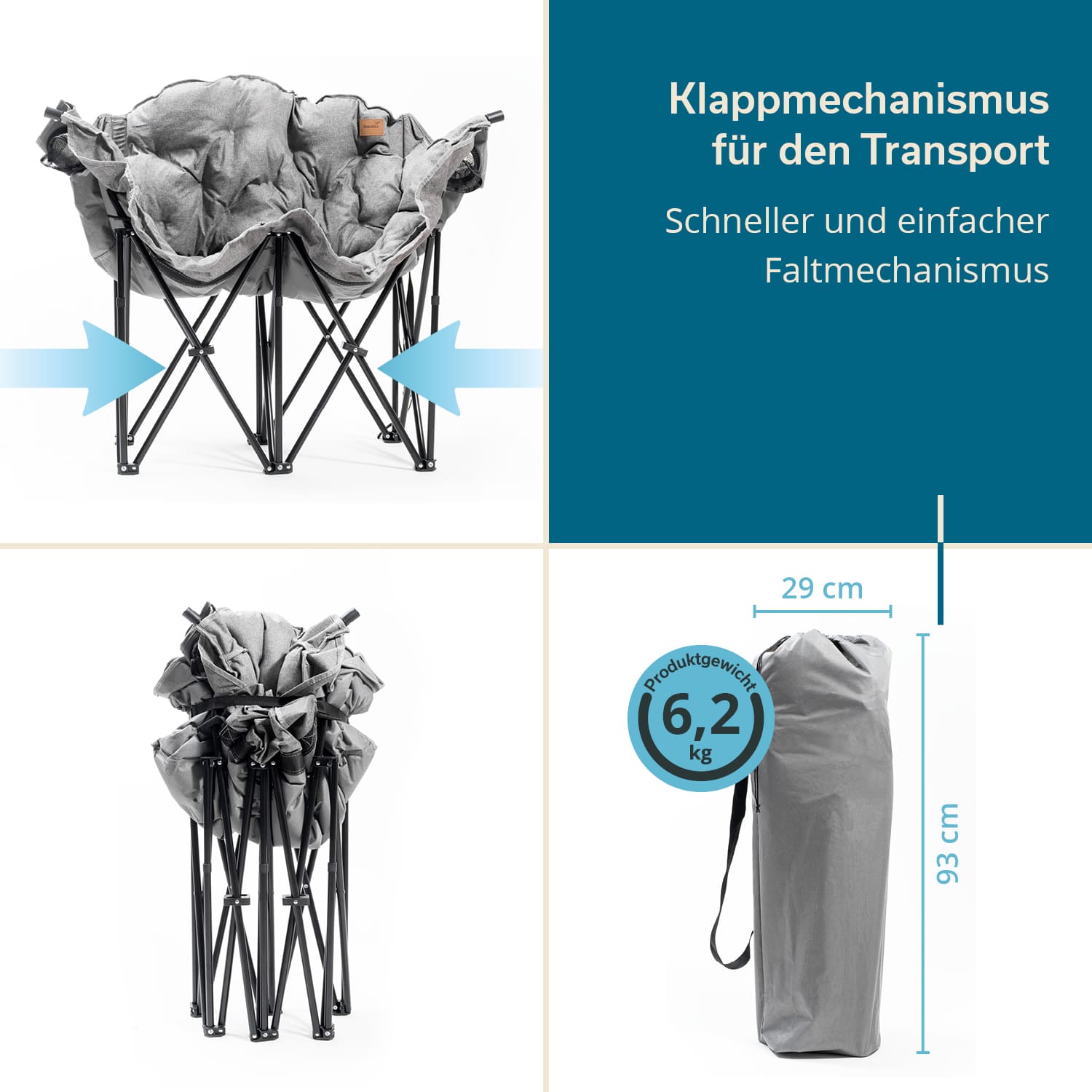 - Faltbare Konstruktion (ohne Werkzeug) und Tragetasche für den einfachen Transport