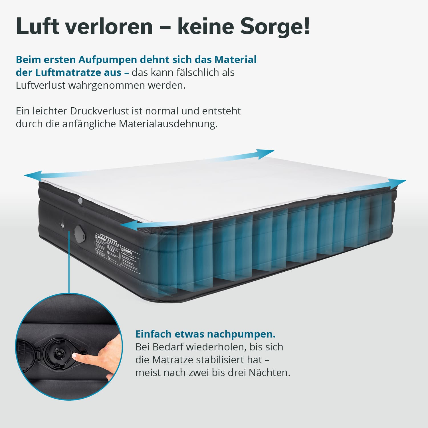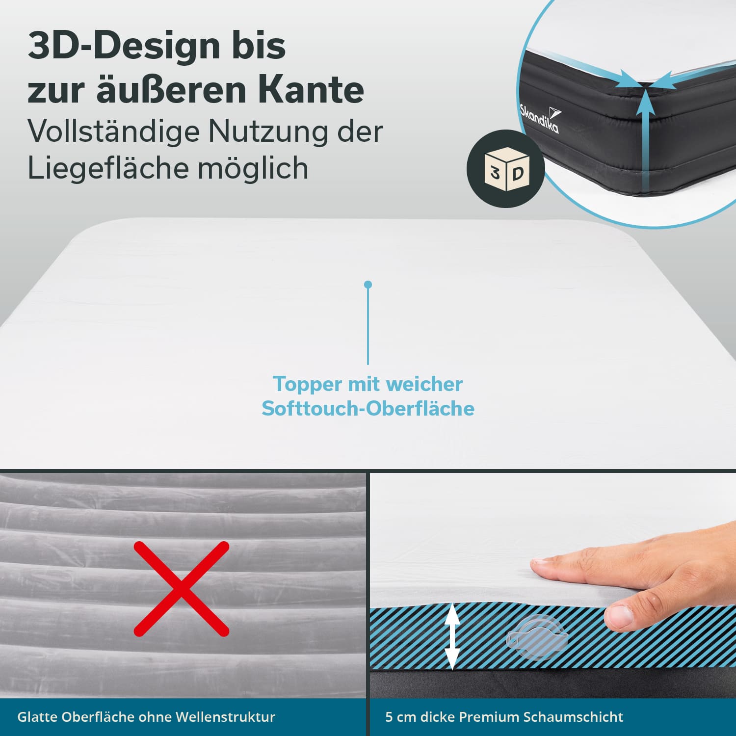 Der fest integrierte Topper bläst sich von selbst auf und bringt Extra-Komfort in jede Nacht. Die Härte lässt sich zusätzlich individuell über die Pumpe regulieren – für Schlafkomfort nach Maß.