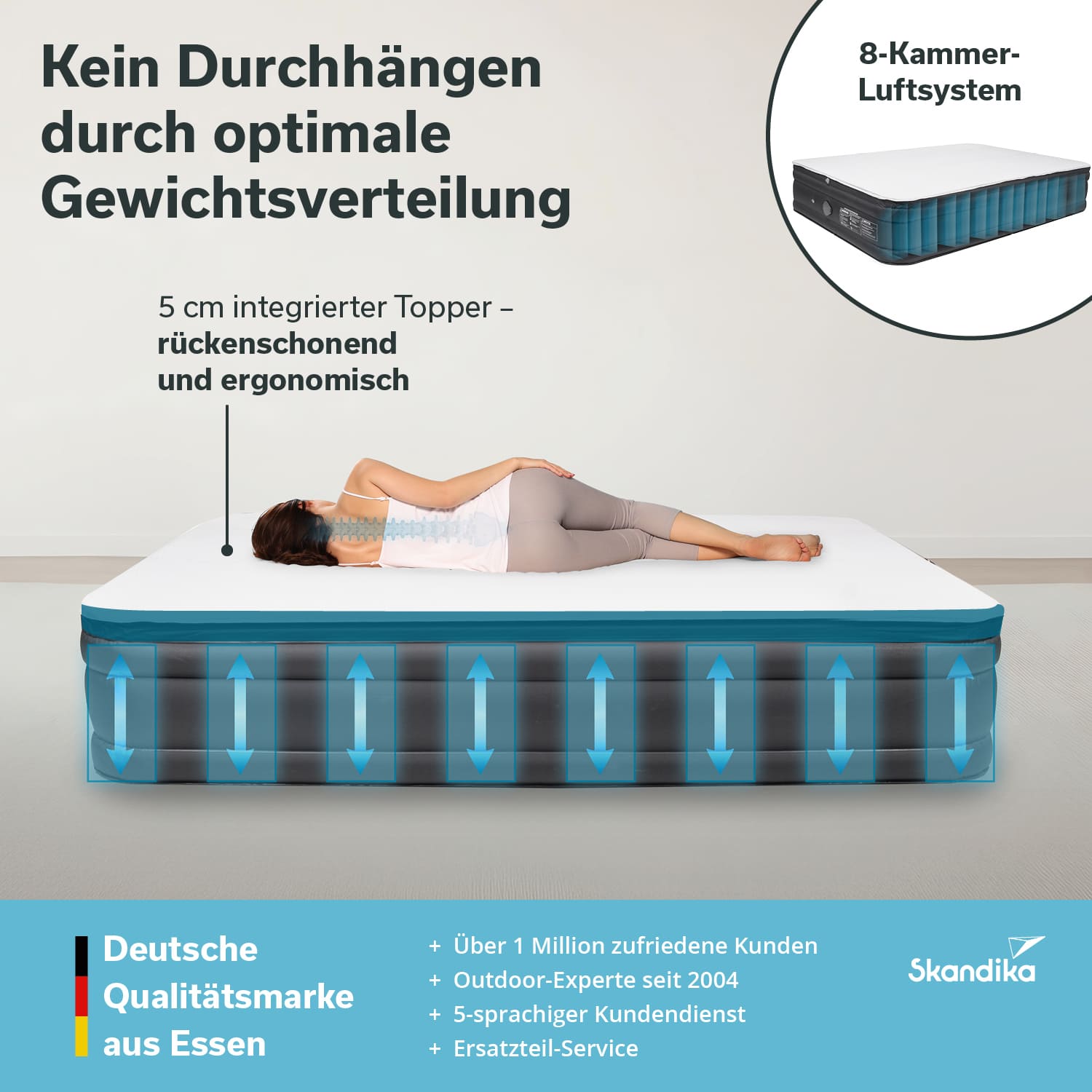Acht separate Luftkammern sorgen für eine gleichmäßige Gewichtsverteilung und unterstützen eine gesunde Liegeposition – für einen rundum erholsamen Schlaf.