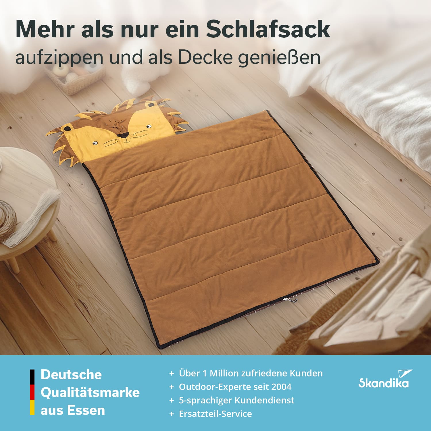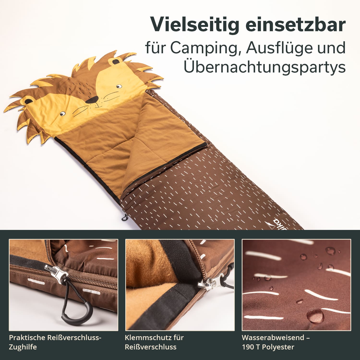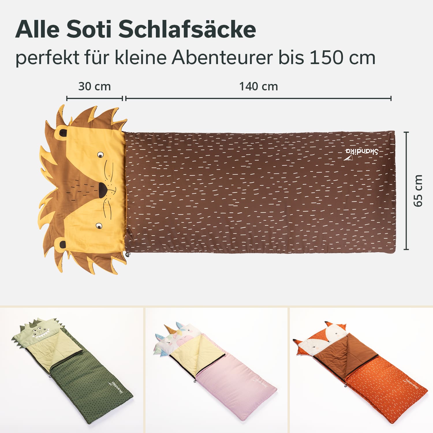 Auswärts übernachten macht Spaß! Ob in den Ferien bei Oma und Opa, auf einer Übernachtungsparty bei Freunden aus dem Kindergarten oder als Outdoor-Profi mit den Eltern auf dem Campingplatz. Die farbenfrohen Schlafsäcke fallen mit ihrem großen Kopfteil mit putzigem Tierkopf ganz besonders ins Auge. Schluss mit langweiligen, einfarbigen Designs. Bei den Skandika Sotis helfen Löwe, Dinosaurier, Einhorn und Fuchs dabei, die Angst im Dunkeln zu vertreiben, und sorgen für jede Menge Spaß. Soti – der tierisch gute Begleiter für kleine Abenteurer!