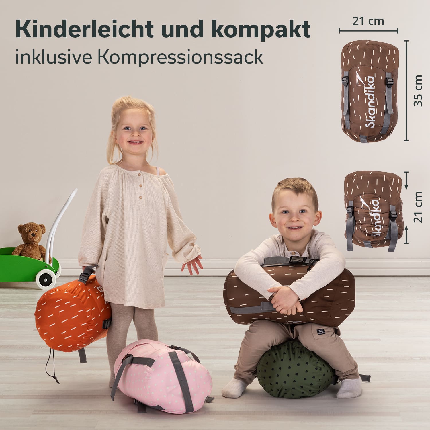Der robuste Packsack ist mit Kompressionsbändern versehen, damit Kinder ihr Gepäck auf ein handliches Maß reduzieren können. Dank dem farblich zu den Schlafsäcken passenden Design sind die Schlafsäcke auch eingepackt leicht zu identifizieren.