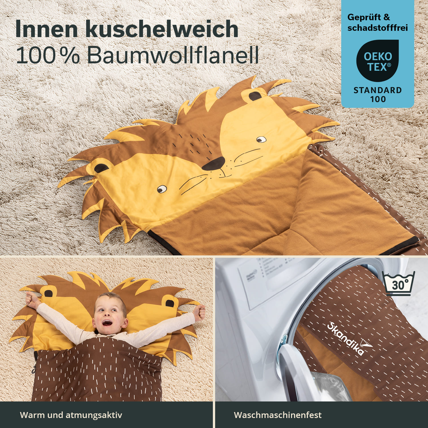 - OEKO-TEX® 100-Zertifizierung der Materialien sichert die hohe Qualität des Schlafsacks