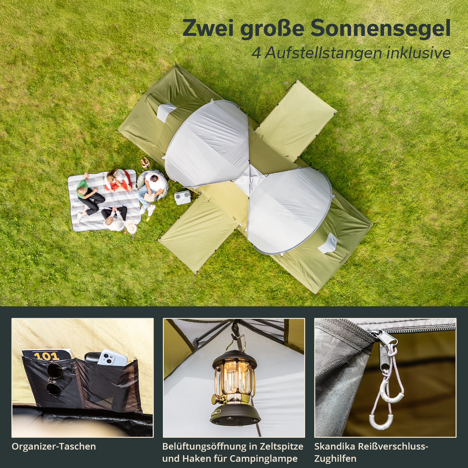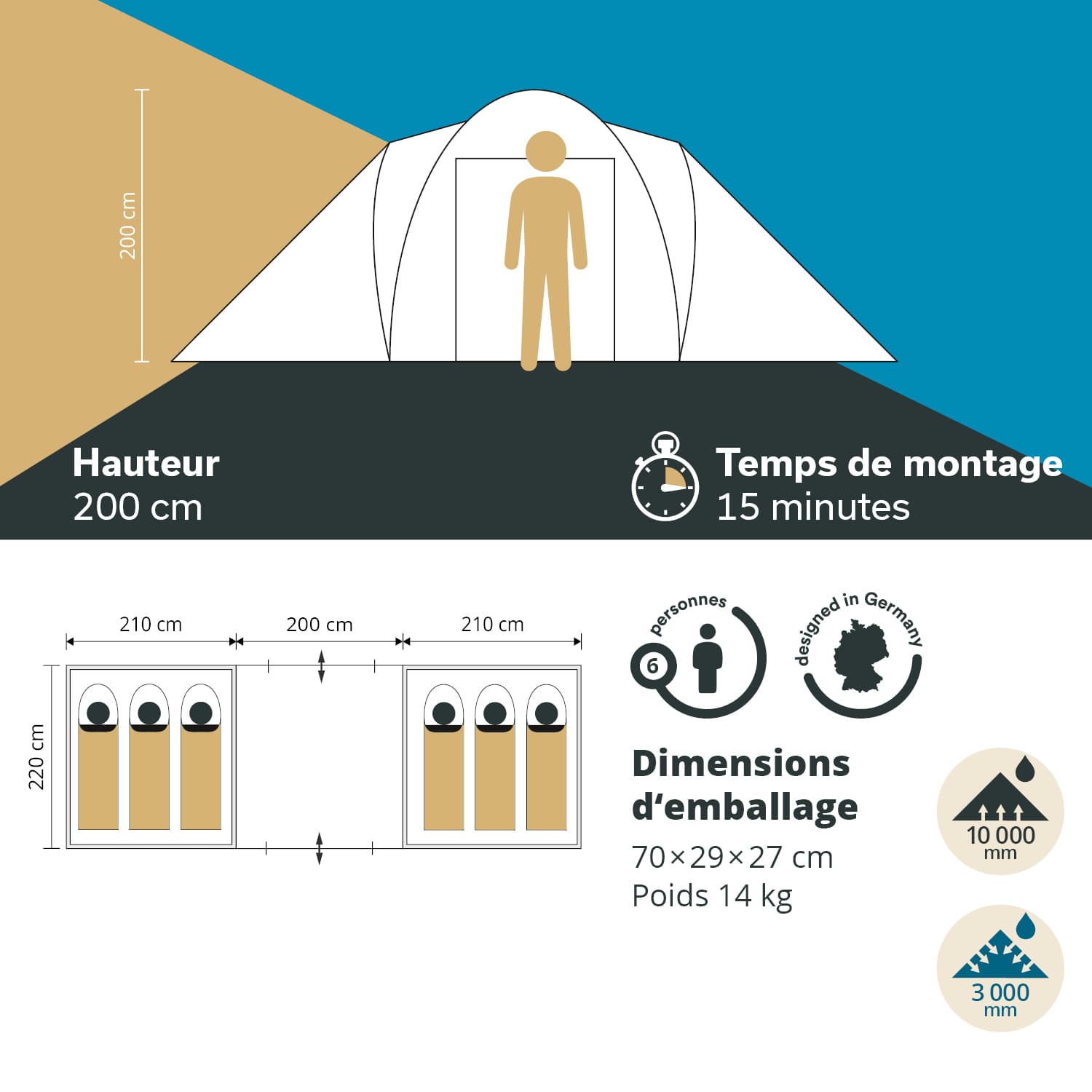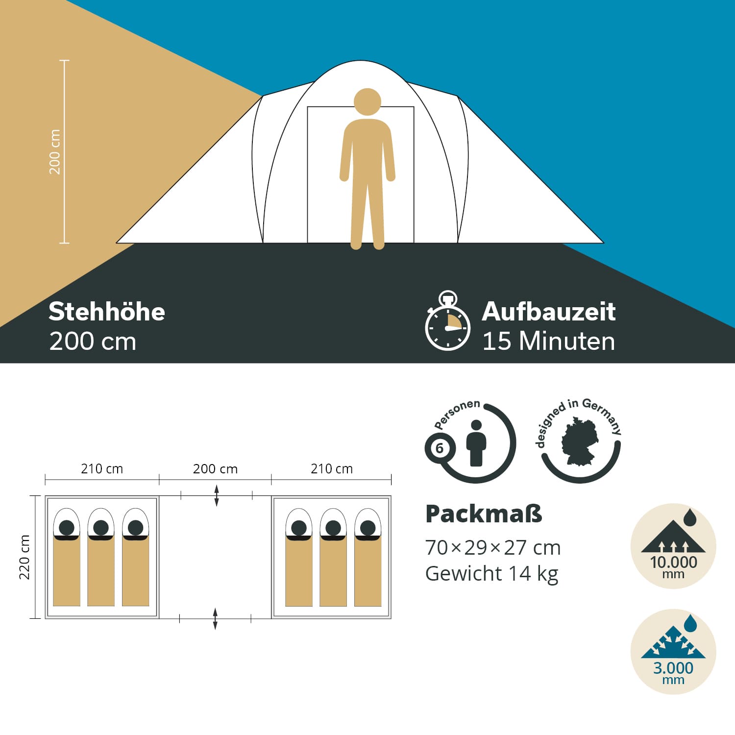 - Wasserdichtes Außenzelt mit 3.000 mm Wassersäule und verschweißten Nähten