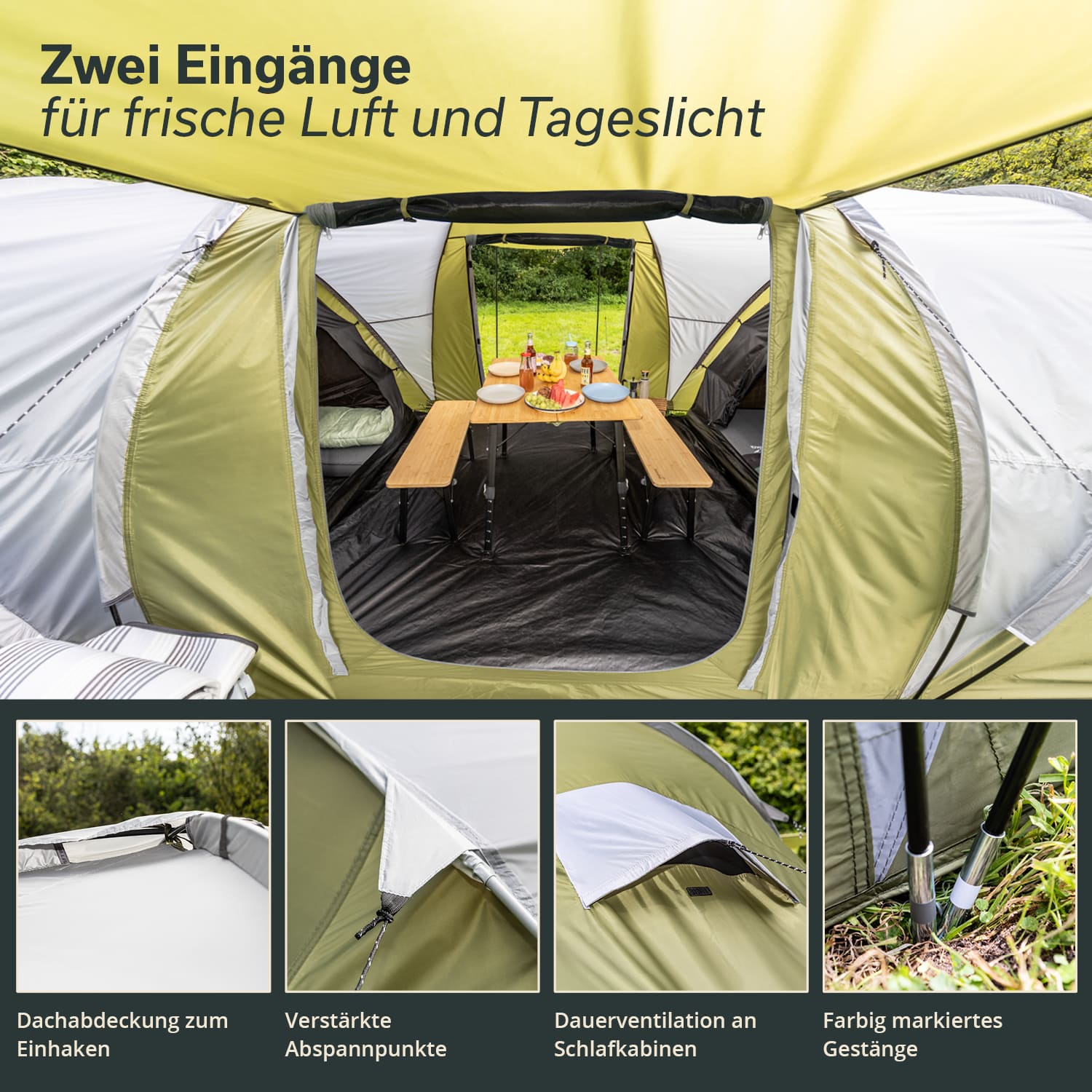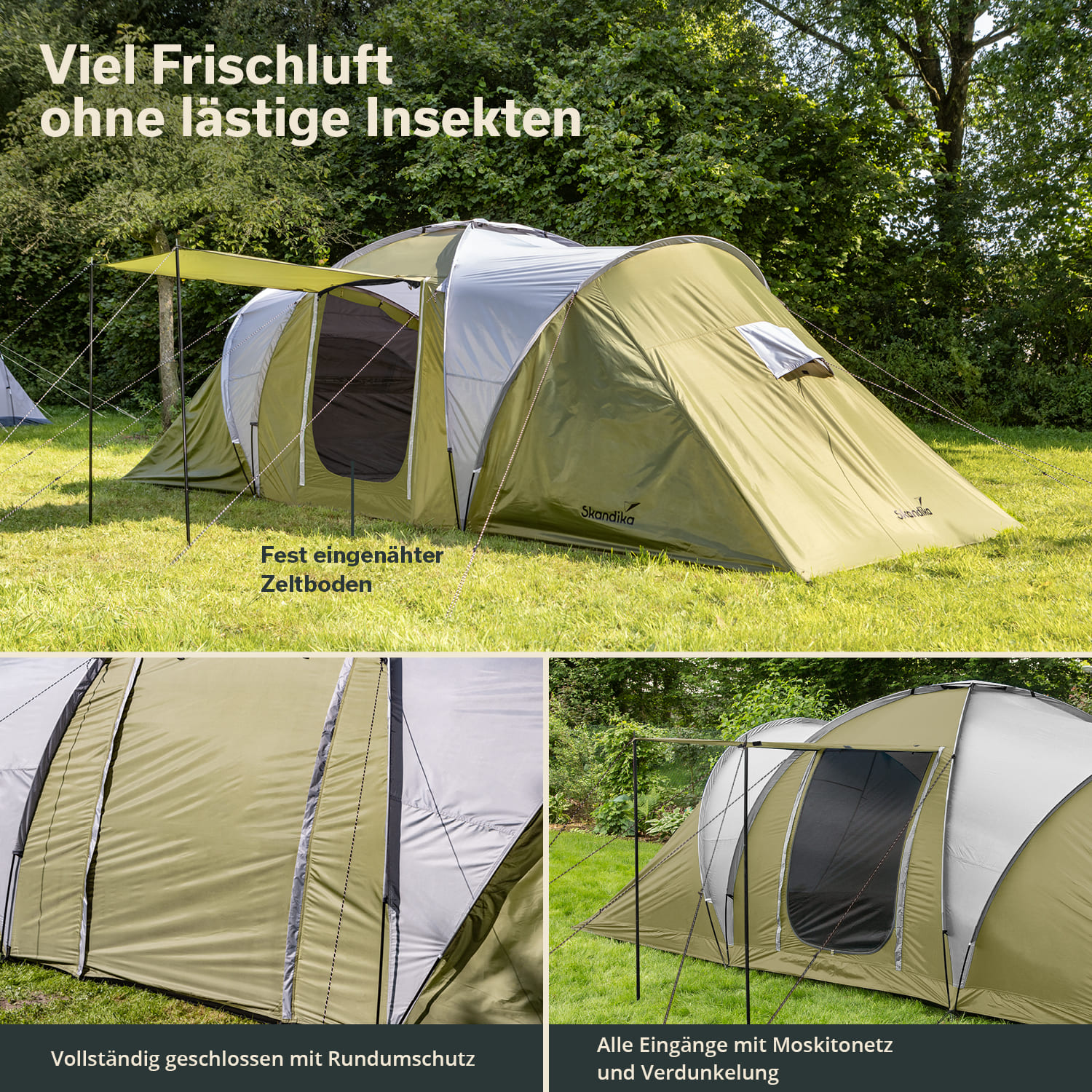Das Zelt hat einen fest eingenähten Boden und die Eingänge und Schlafkabinen sind mit Moskitonetz ausgestattet. Somit bleiben lästige Insekten draußen und der Innenraum bleibt geschützt vor Feuchtigkeit und Zugluft.