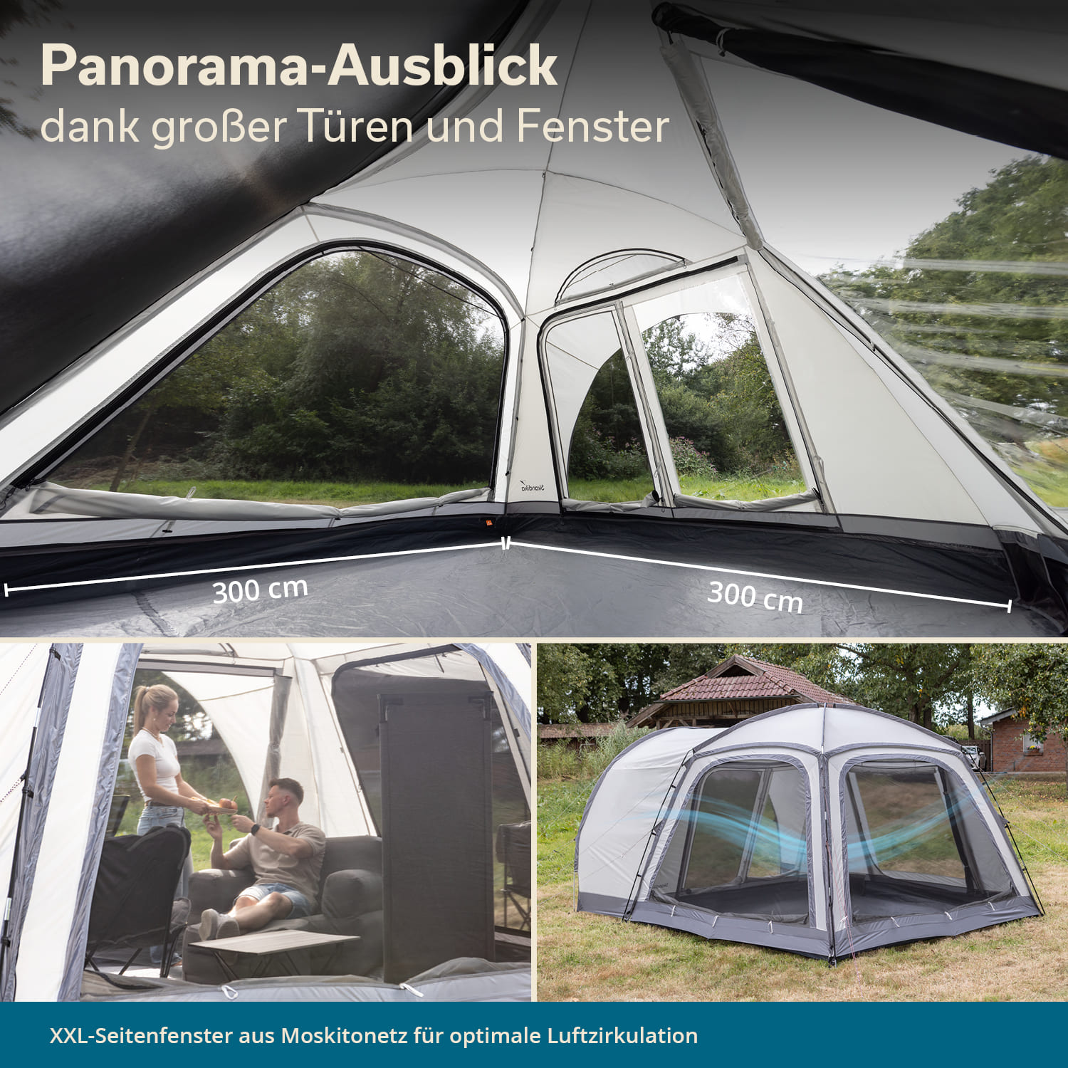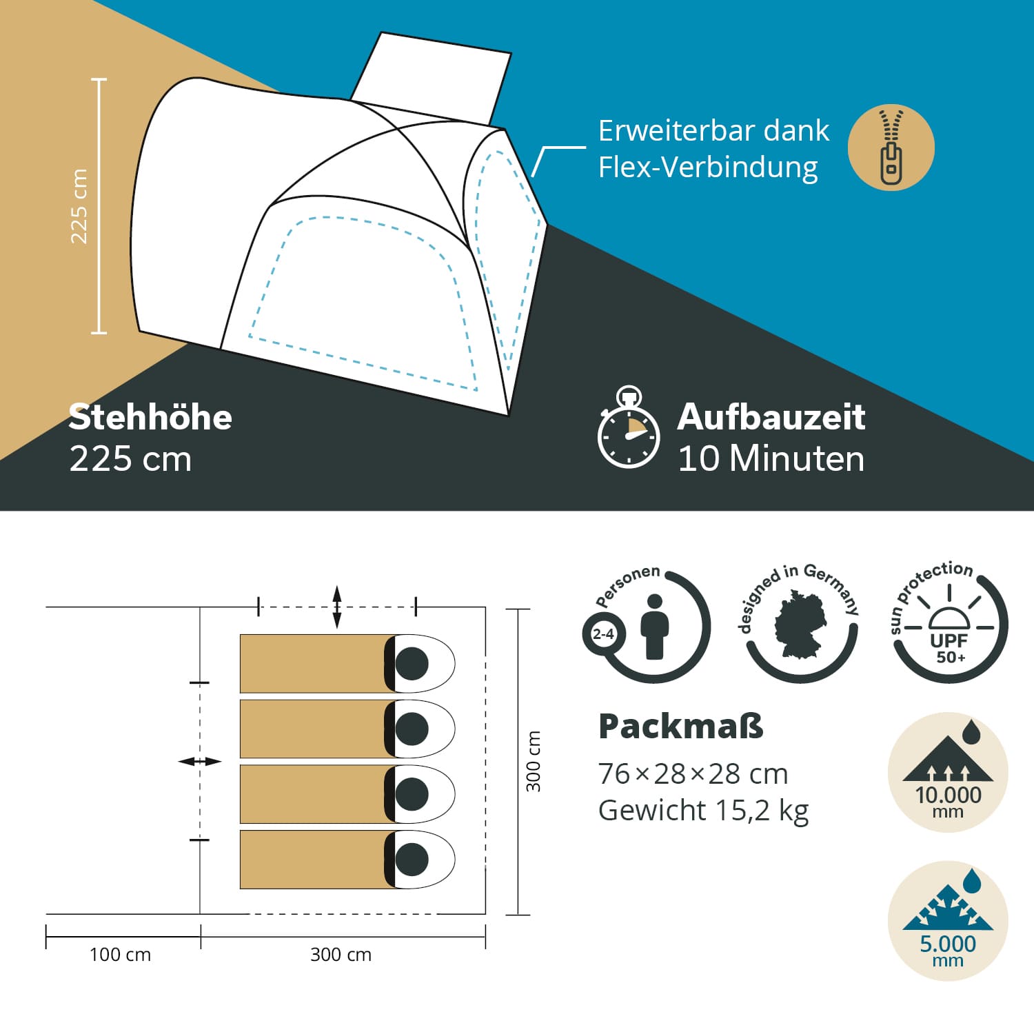 - Freistehendes, quadratisches Kuppelzelt – wandelbar zum praktischen Fahrzeugvorzelt