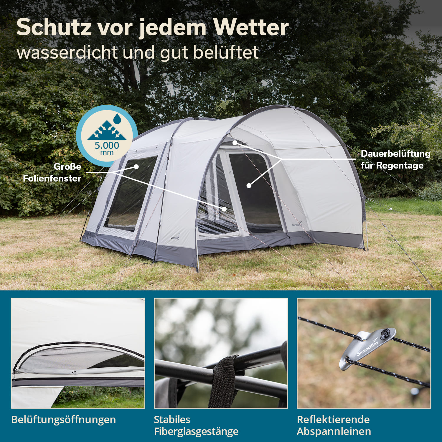 Der Zeltstoff hat einen UV-Schutzfaktor 50+ und bewahrt das Zelt davor, durch intensive Sonneneinstrahlung spröde oder rissig zu werden. Das Zelt wird langlebiger, heizt sich nicht so schnell auf und ein angenehmes Zeltinnenklima wird begünstigt.