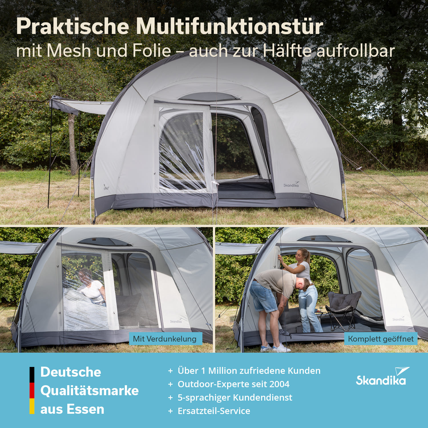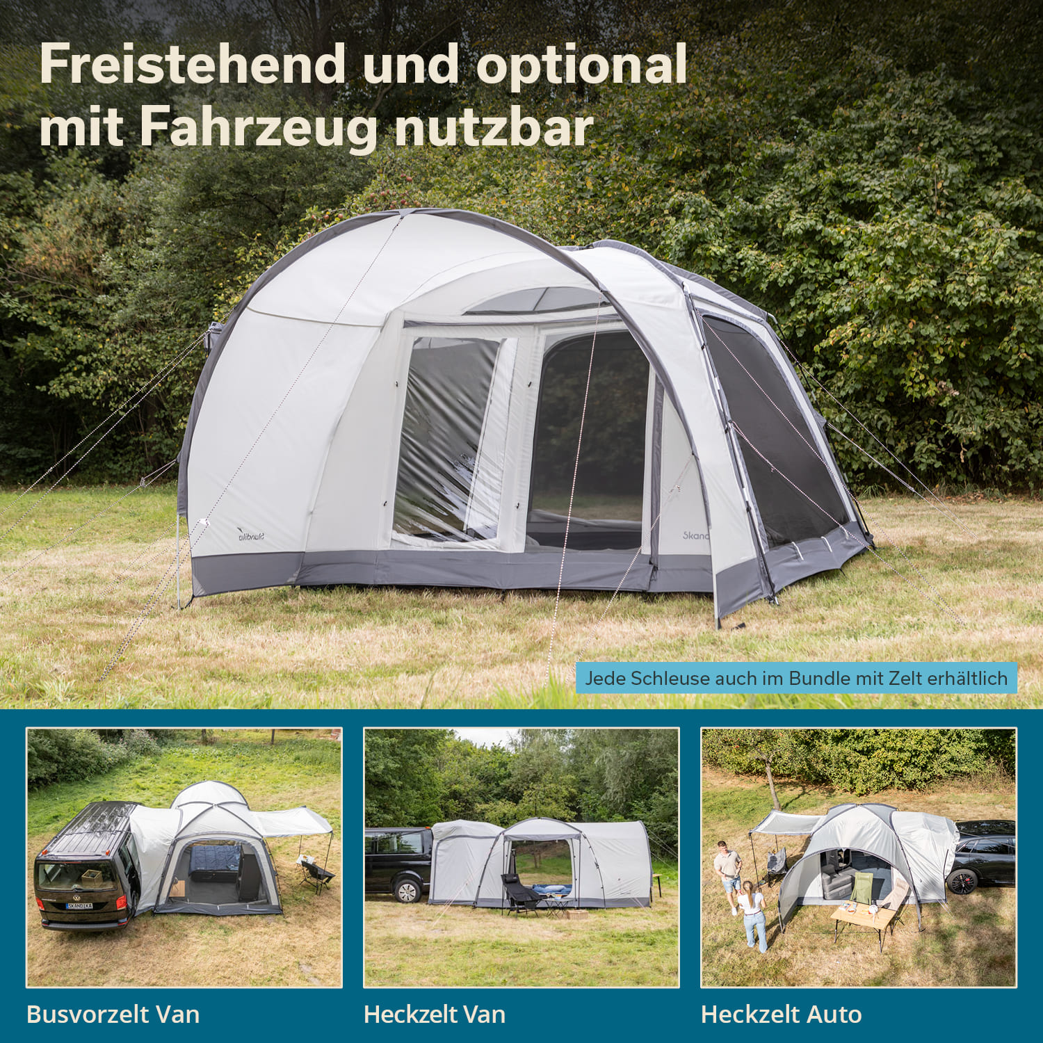 Das freistehende Pitea 4 Flex Protect ist das Herzstück eines durchdachten Baukastensystems und lässt sich durch separat erhältliche Schleusenmodule individuell an verschiedene Fahrzeugtypen und Campingsituationen anpassen.