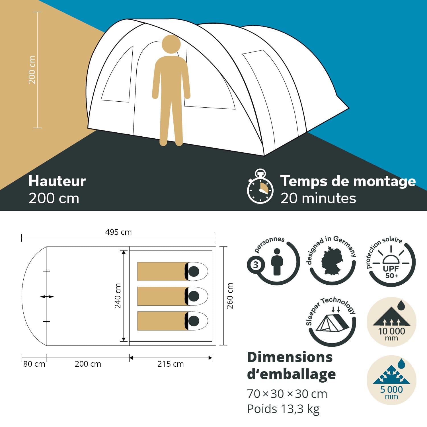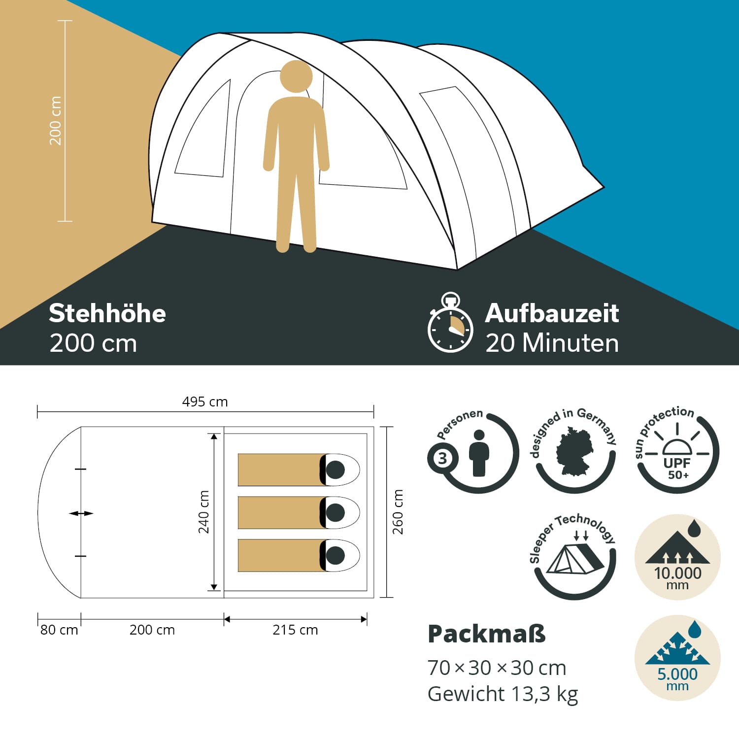 • Größe 495 × 260 cm / Kabine 215 × 240 cm / Packmaß 70 × 30 × 30 cm / Gewicht 13,3 kg