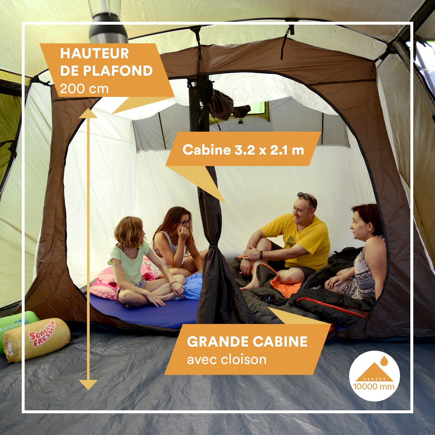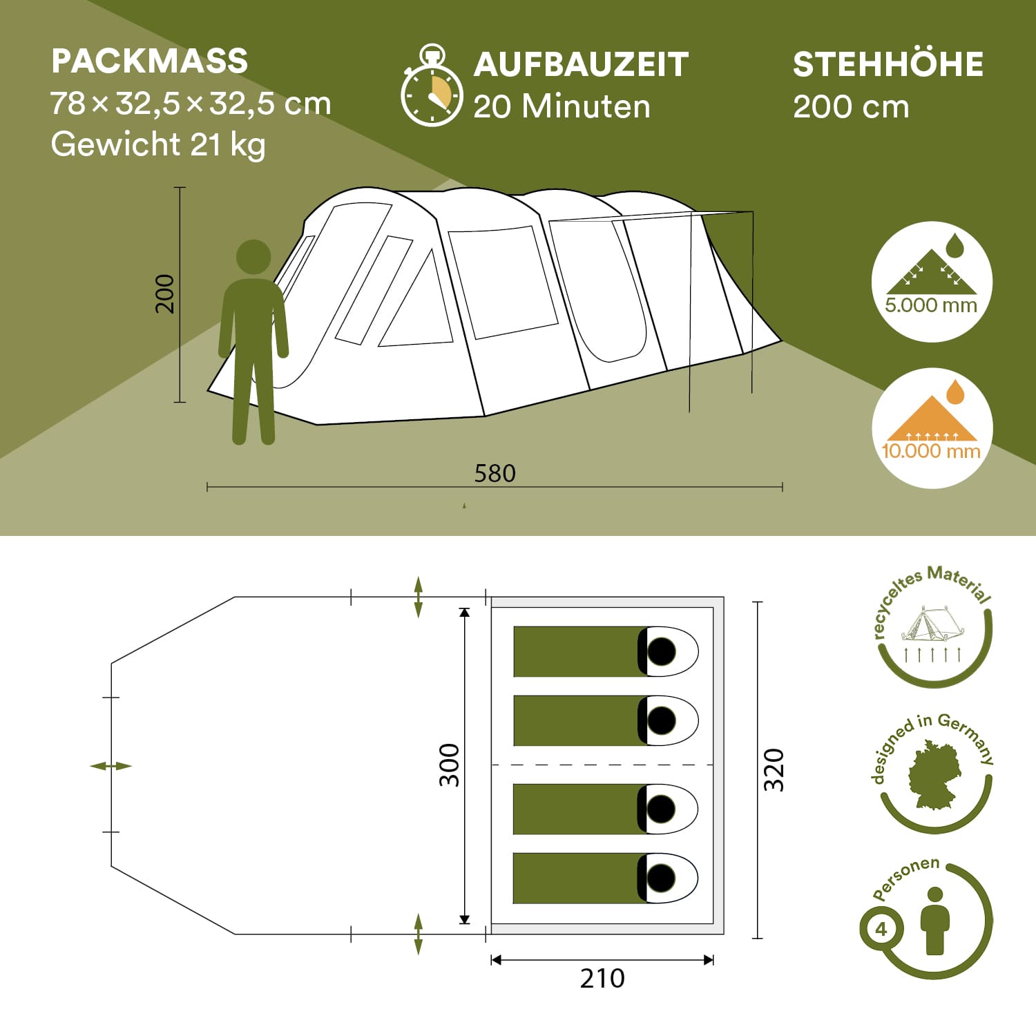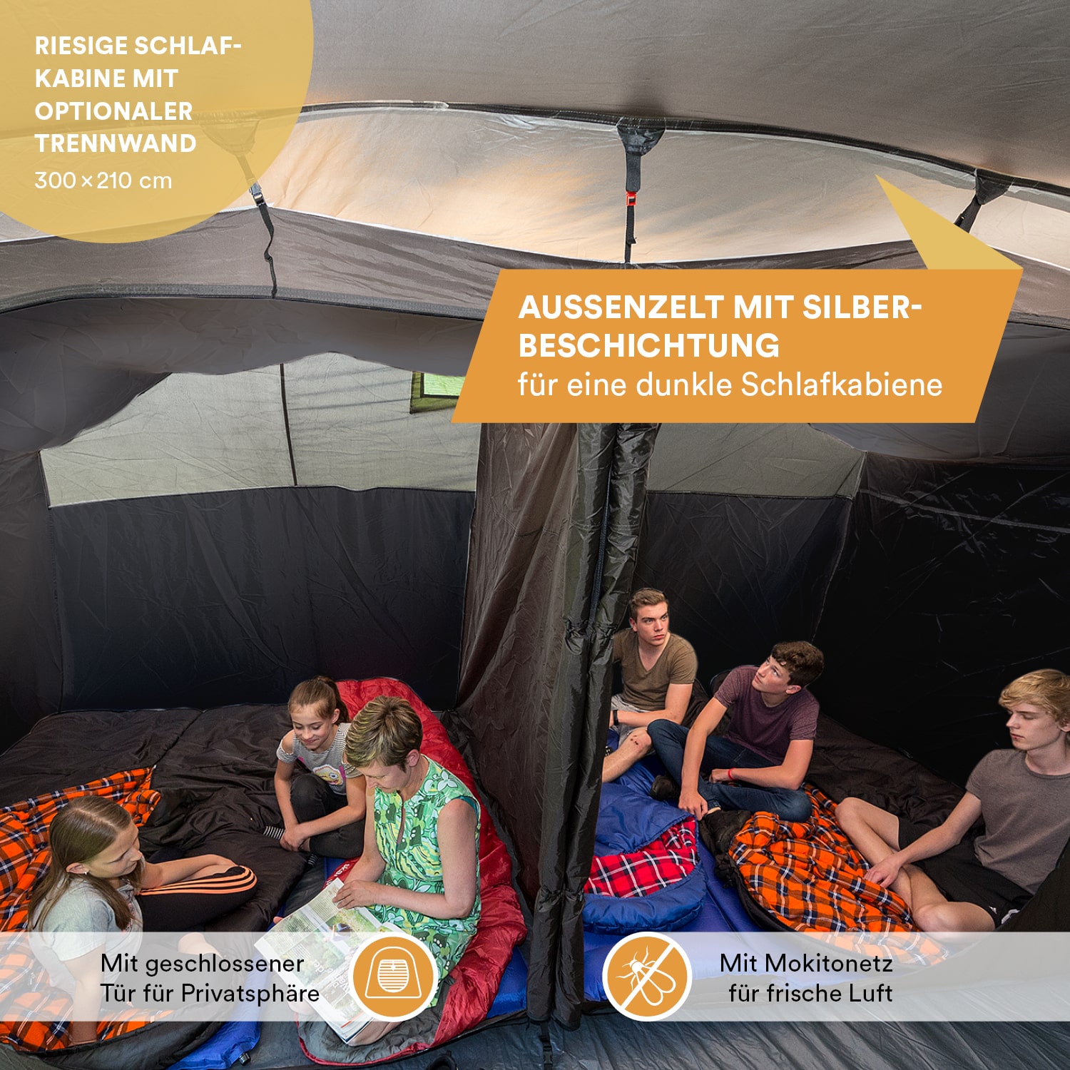 Das Tunnelzelt besitzt eine 210 x 300 cm große Kabinen für 4 Personen. Die große Kabine kann zusätzlich durch eine optionale Trennwand zu zwei 210 x 150 cm großen Kabinen für je 2 Personen separiert werden.