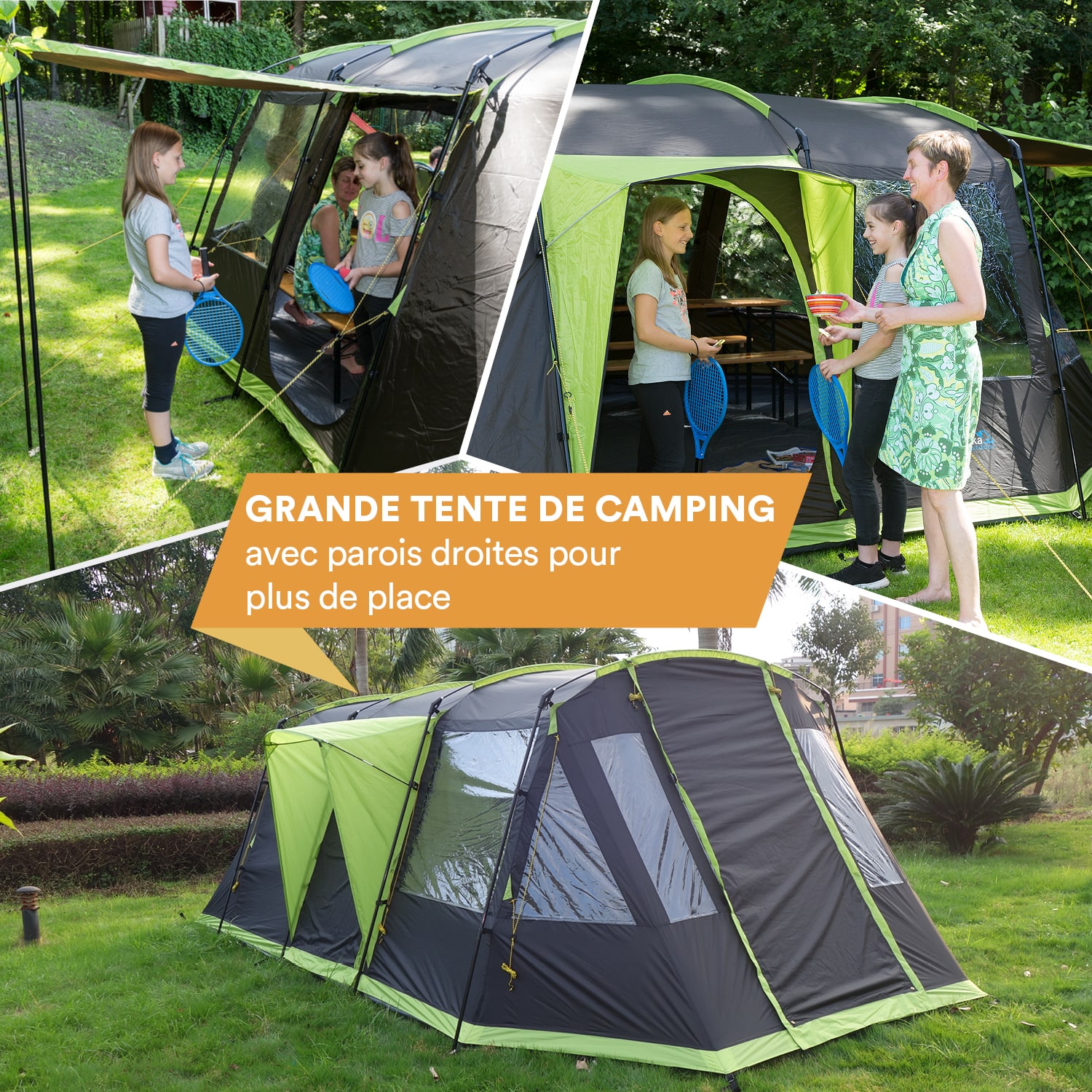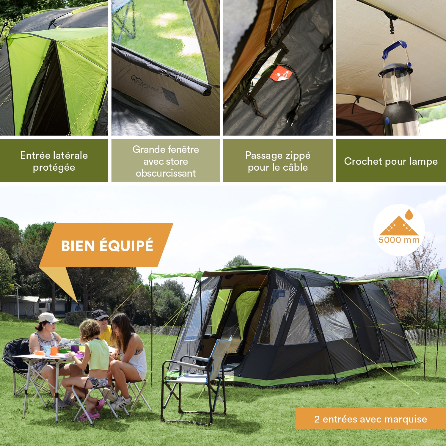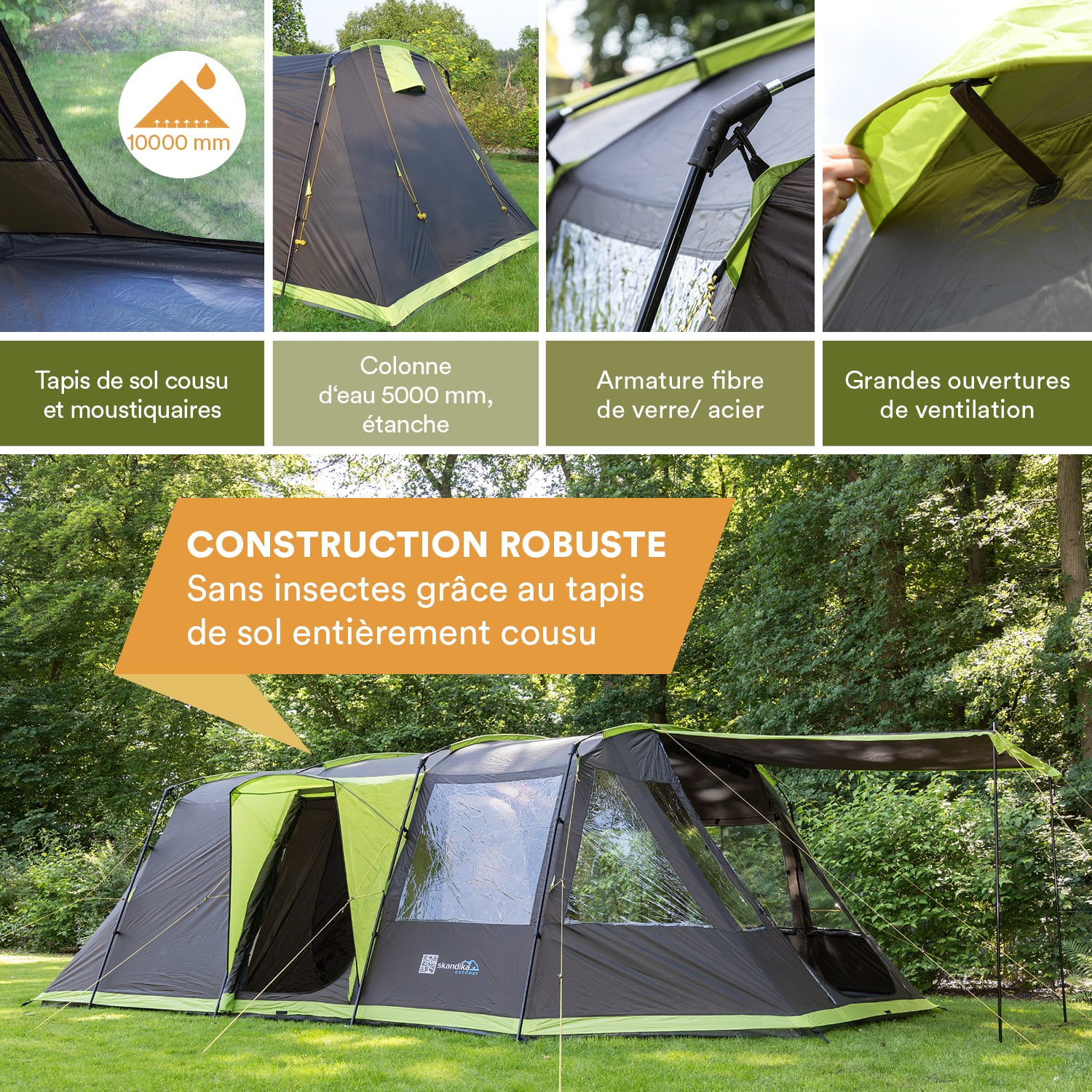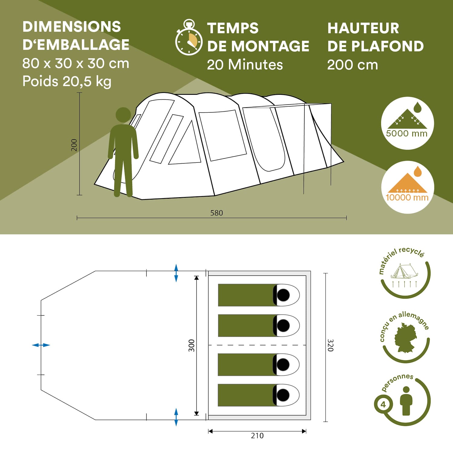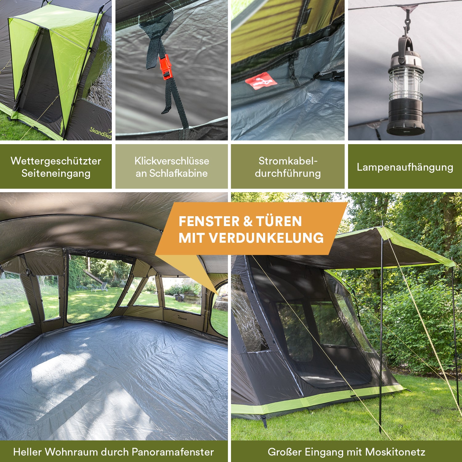 Das Zelt besitzt praktische Extras wie Lampenhaken, Kabeldurchführung, Belüftungsöffnungen und Verdunklungen. In der Lieferung miteingeschlossen sind Tragetasche, Abspannleinen, Erdnägel, Aufbauanleitung und ein Reparatur-Kit.ern den Aufbau und im Wohnbereich befindet sich ein Deckenhaken für eine Campinglampe. Ein passender Zeltboden, Erdnägel, Abspannleinen und eine Aufbauanleitung werden mitgeliefert.