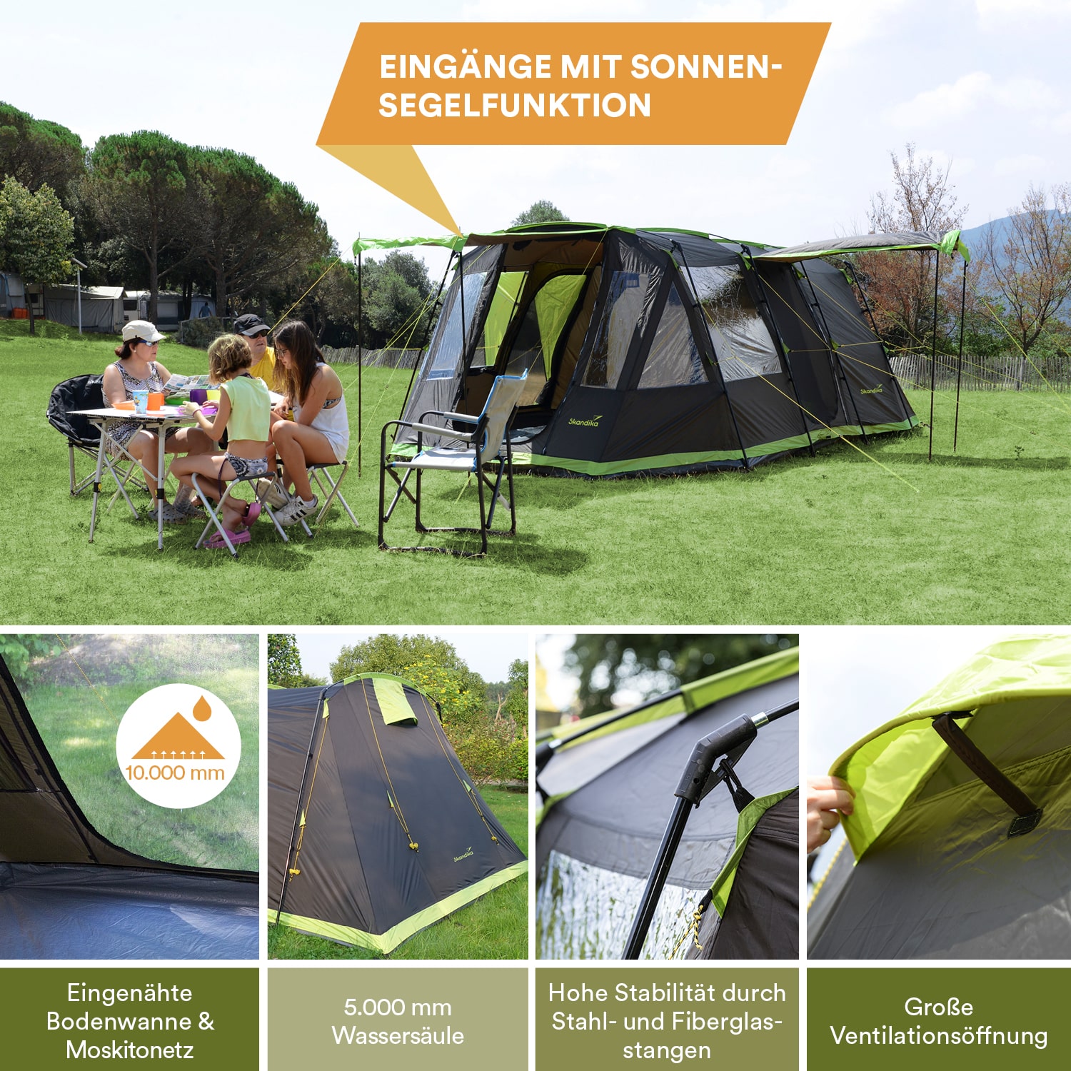 Das große Zelt verfügt über 3 Eingänge mit großer Flexibilität. Zwei lassen sich zu einem Sonnensegel aufstellen, um den Eingängen Schatten zu spenden und der zusätzliche dritte Seiteneingang hat ein kleines Vordach und ist somit wettergeschützt.