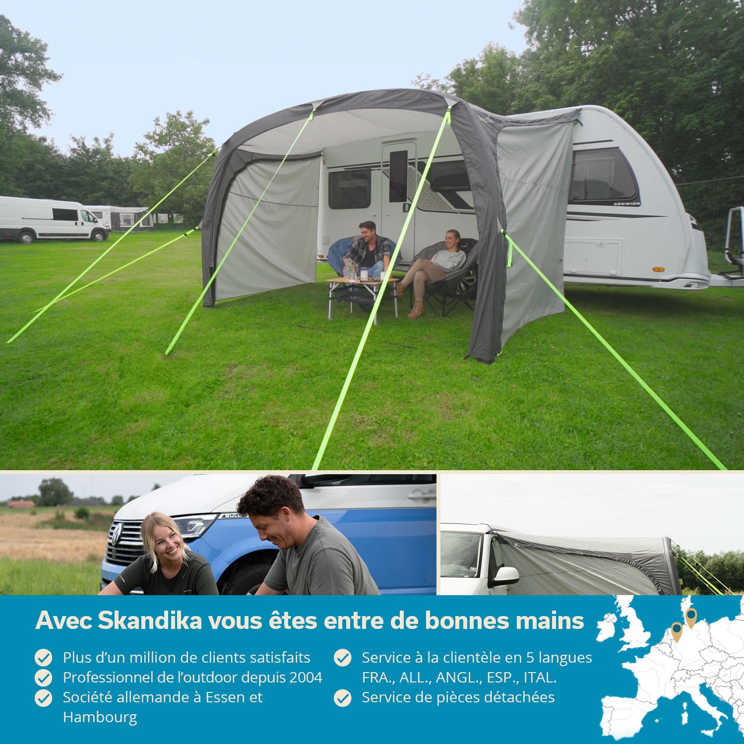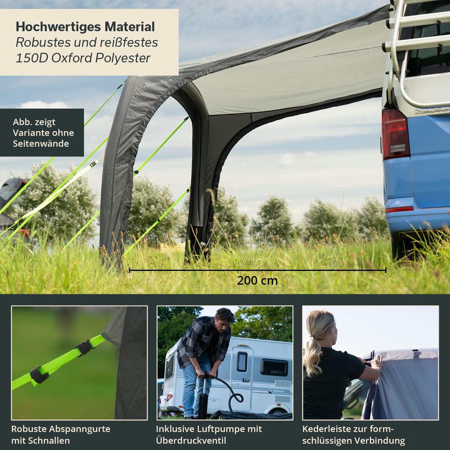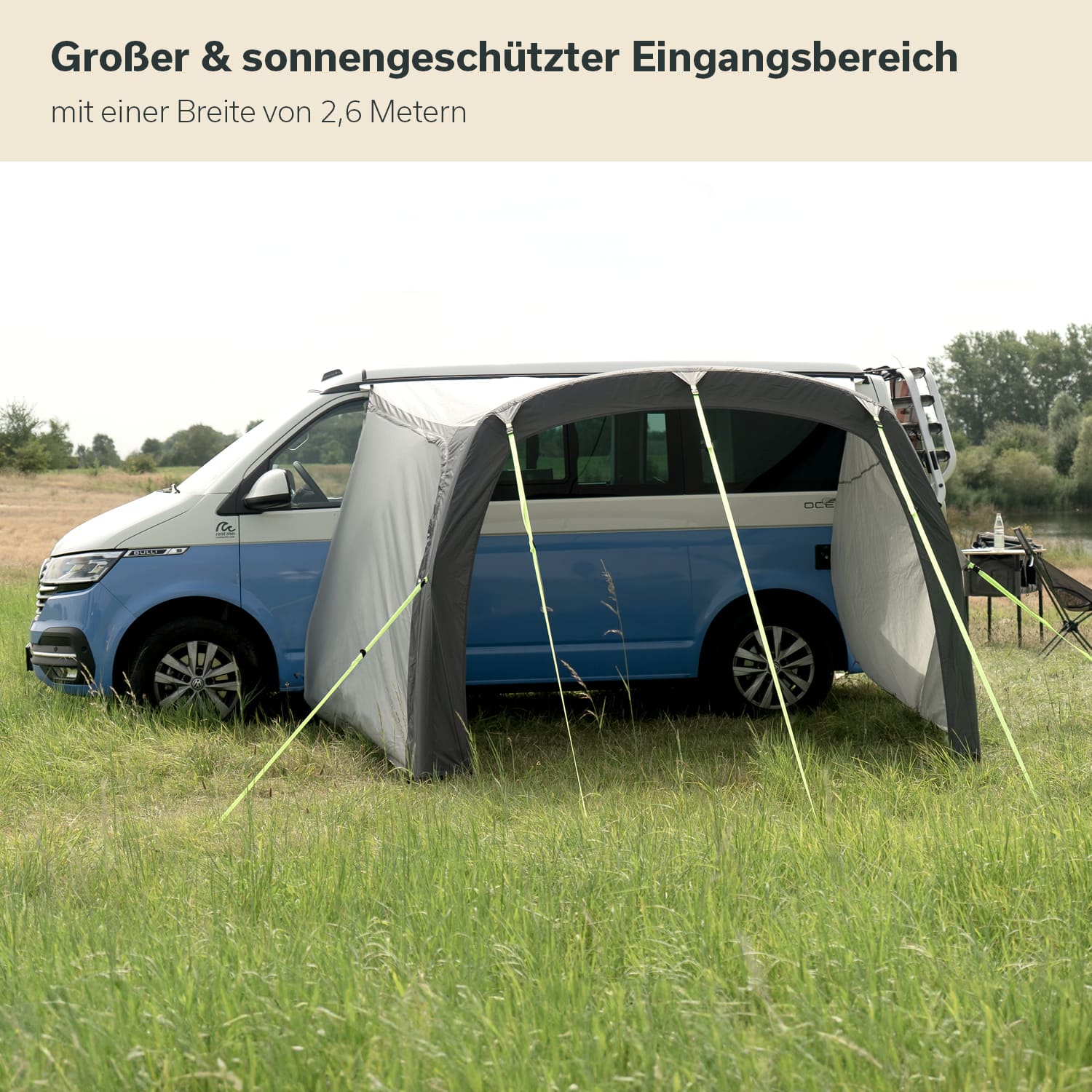 Wer sich einen optimal geschützten Eingangsbereich für den Campervan wünscht, ist bei unserem Vika Air Van 260 mit Seitenwänden genau richtig! Das clevere Vordach ist dank Skandika Air-Rise Technology im Nu aufgestellt und befestigt. Die zwei Seitenwände geben noch mehr Schutz und werden ganz einfach mittels stabiler Reißverschlüsse am Vordach befestigt.
